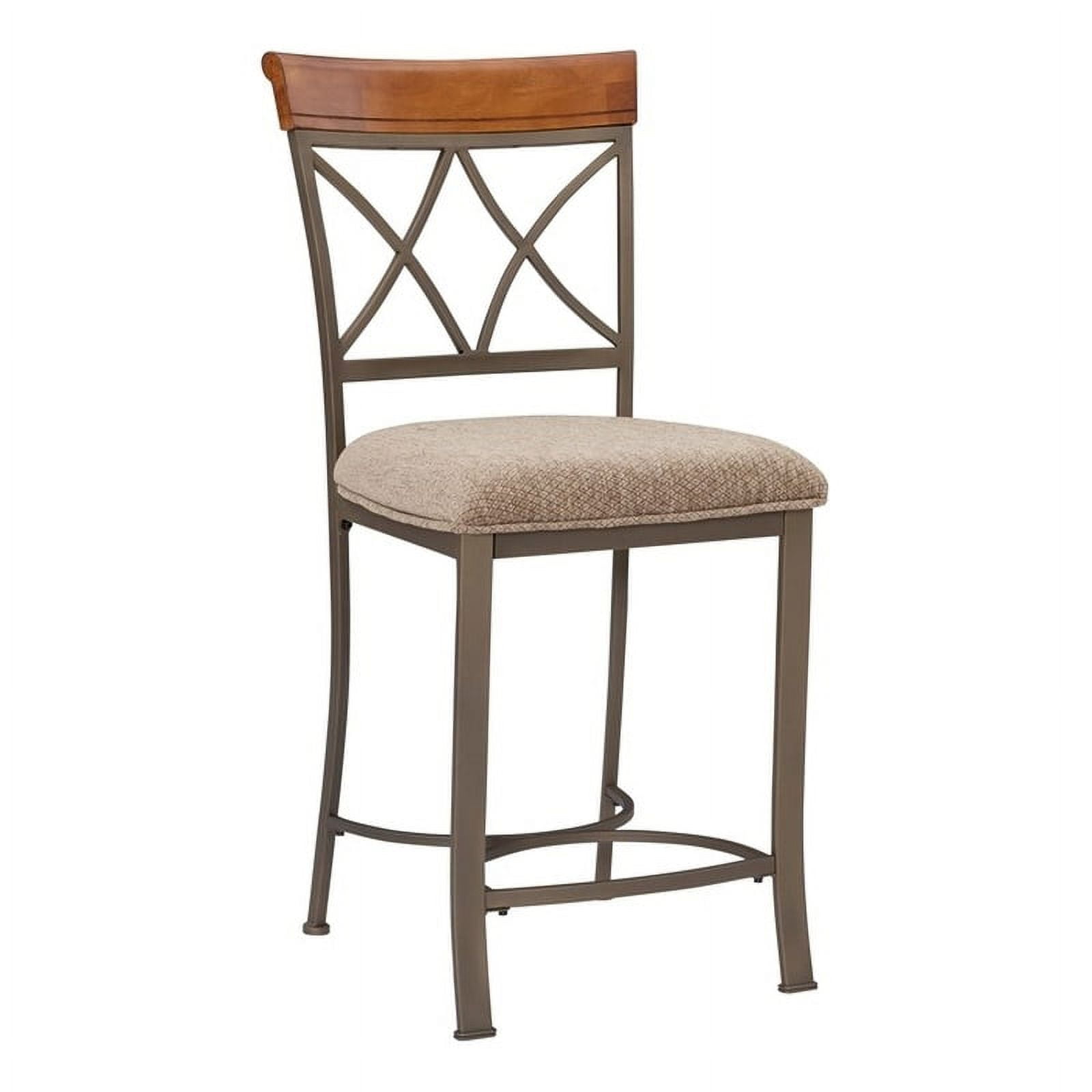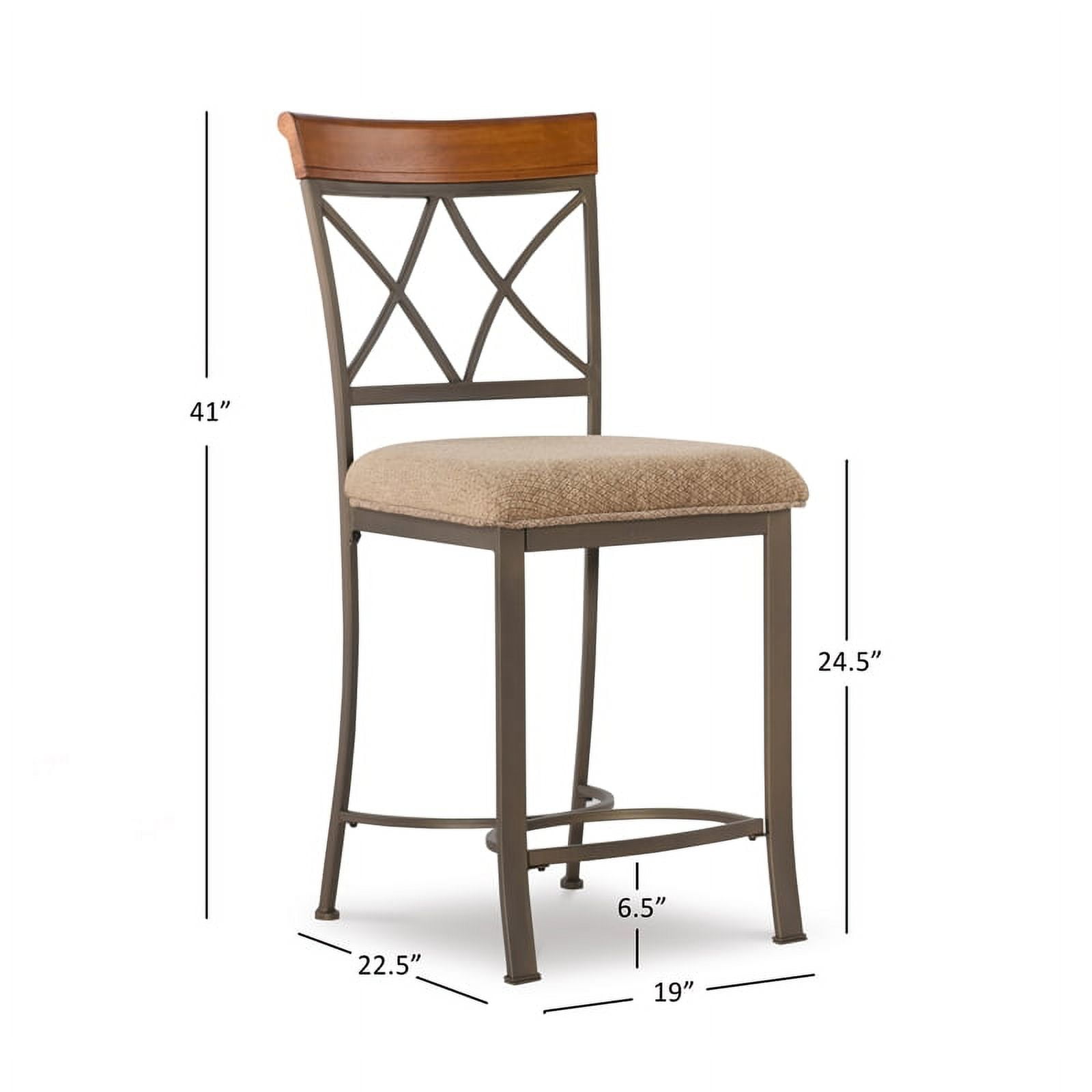 The Hamilton Counter Stool features a diamond shaped back and slight curved legs. The top of the back piece is a sleek “Brushed Faux Medium Cherry” wood, while the frame is a “Matte Pewter and Bronze” metal. This piece is sure to add interest and extra seating to your table. Some assembly required. Features: Crafted from Metal, Rubberwood, Foam and Fabric Matte Pewter and Bronze Metal Base Brushed Faux Medium Cherry Wood Finish Beige Diamond Patterned 100% Polyester Upholstery Metal footrail Counter Height Specifications: Assembly Required: Some Assembly Required Product Dimensions: 18.75″W x 22.5″d x 41.13″h Product Weight: 17.2 lbs Seat Height: 24.5″ Seat Dimensions: 17″ x 17″ Weight Capacity: 350 lbs