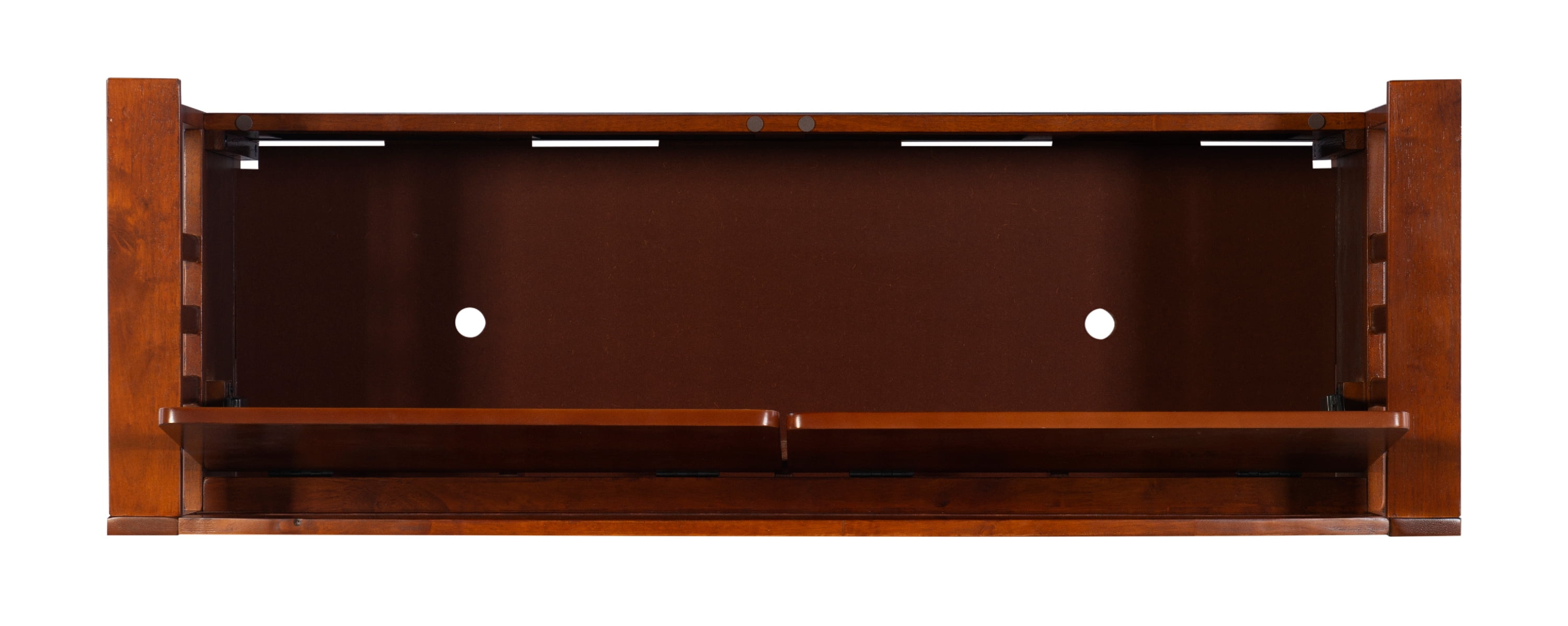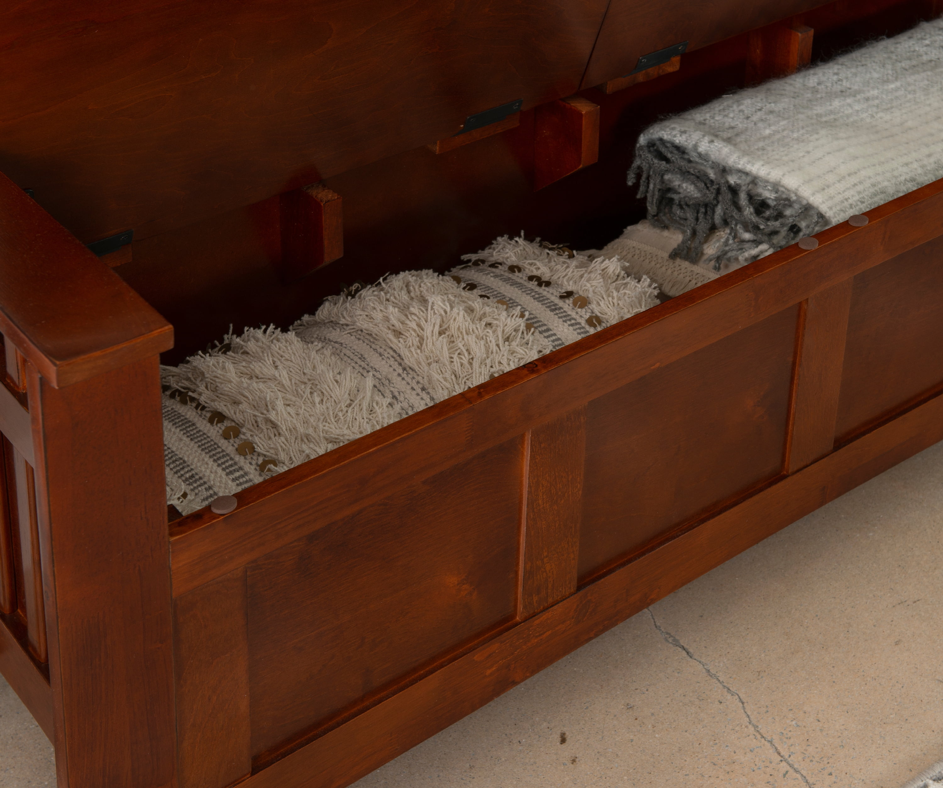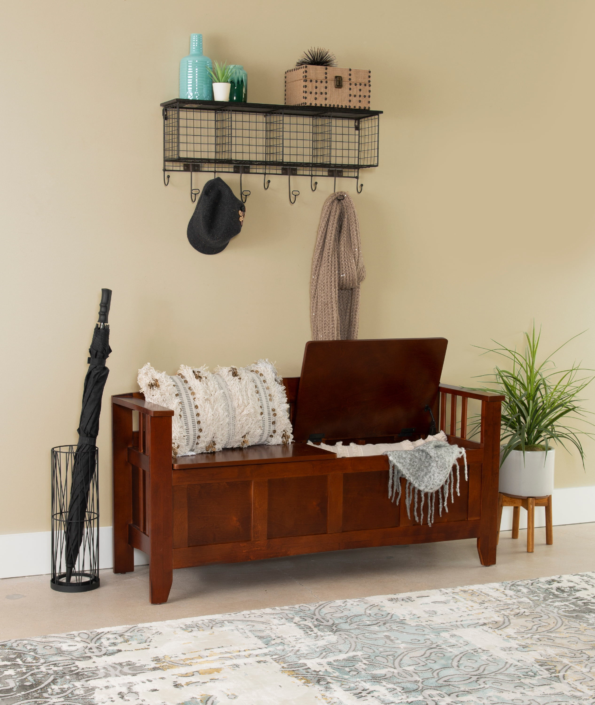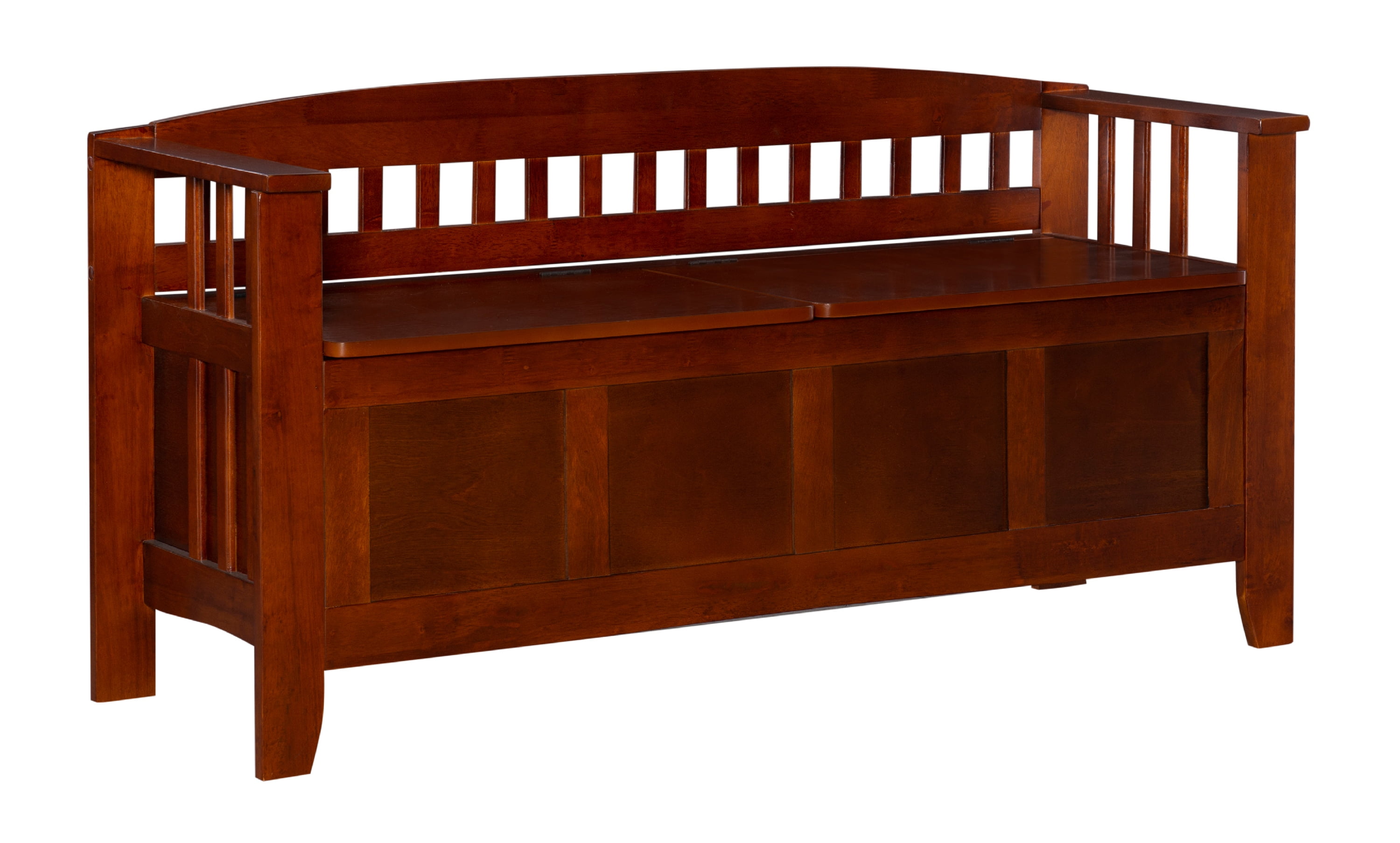 Create added seating and storage to your foyer or mudroom with this attractive and functional split seat storage bench. The bench features a split seat, allowing the user to rest on one side of the bench, while retrieving articles from the storage compartment on the opposite side. The slat designed low back and sides are enhanced by the warm walnut finish.