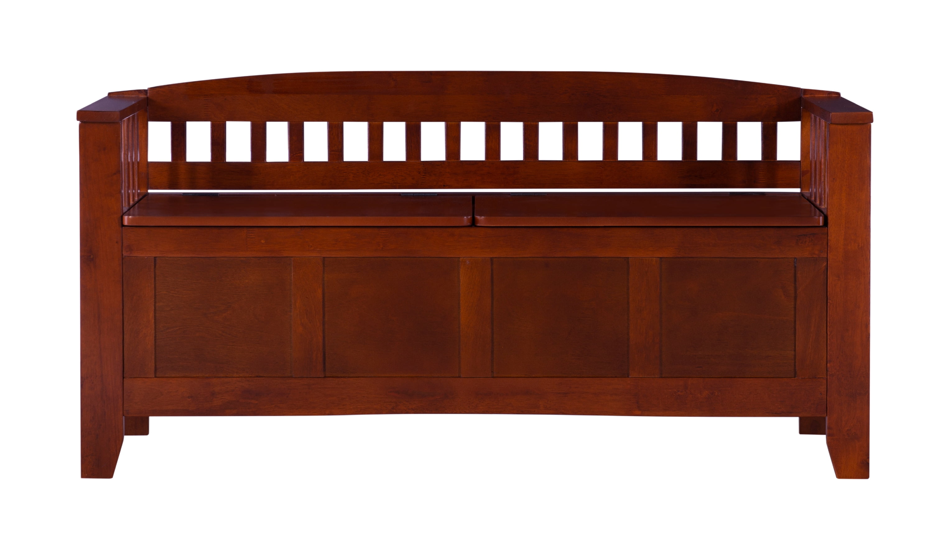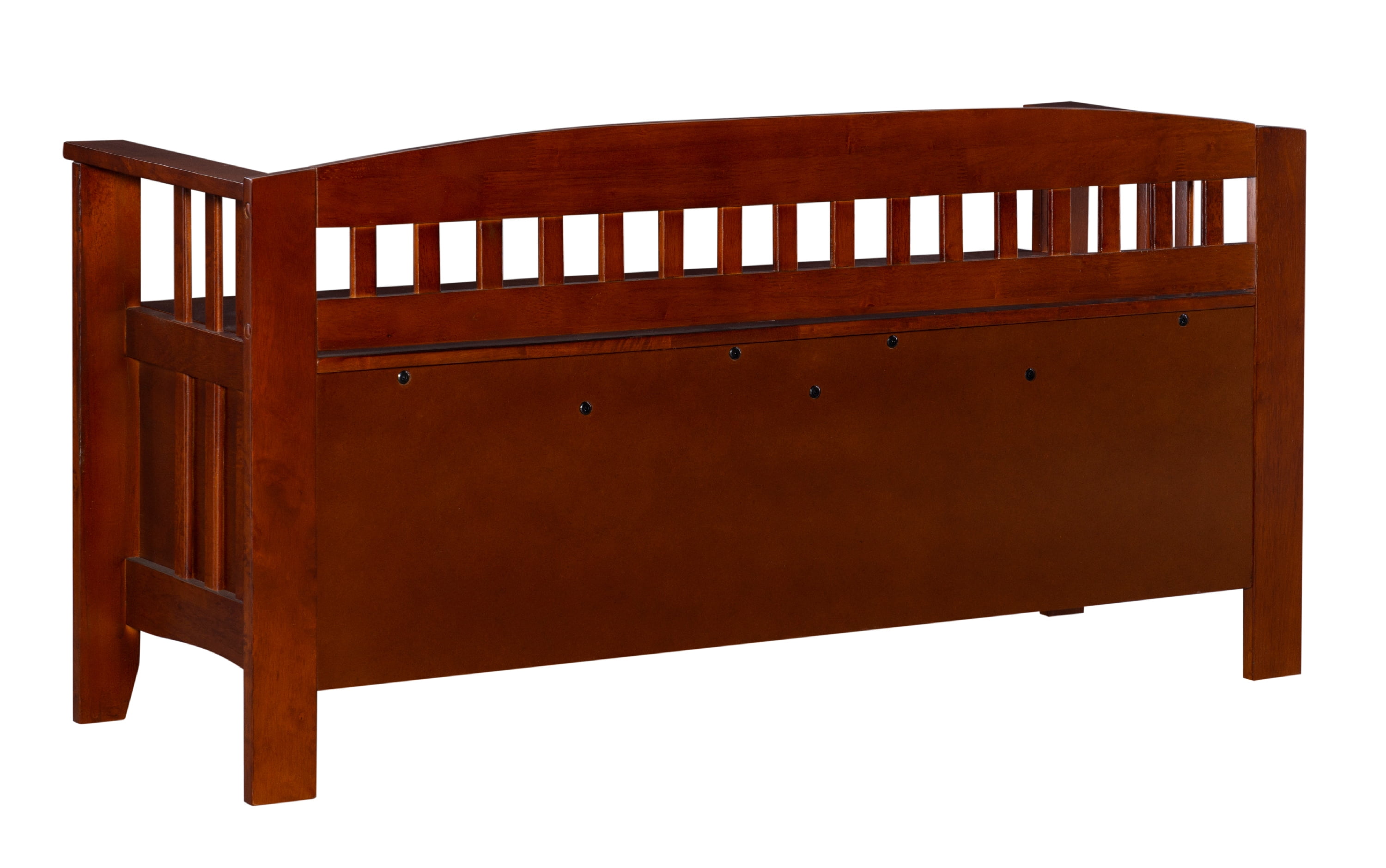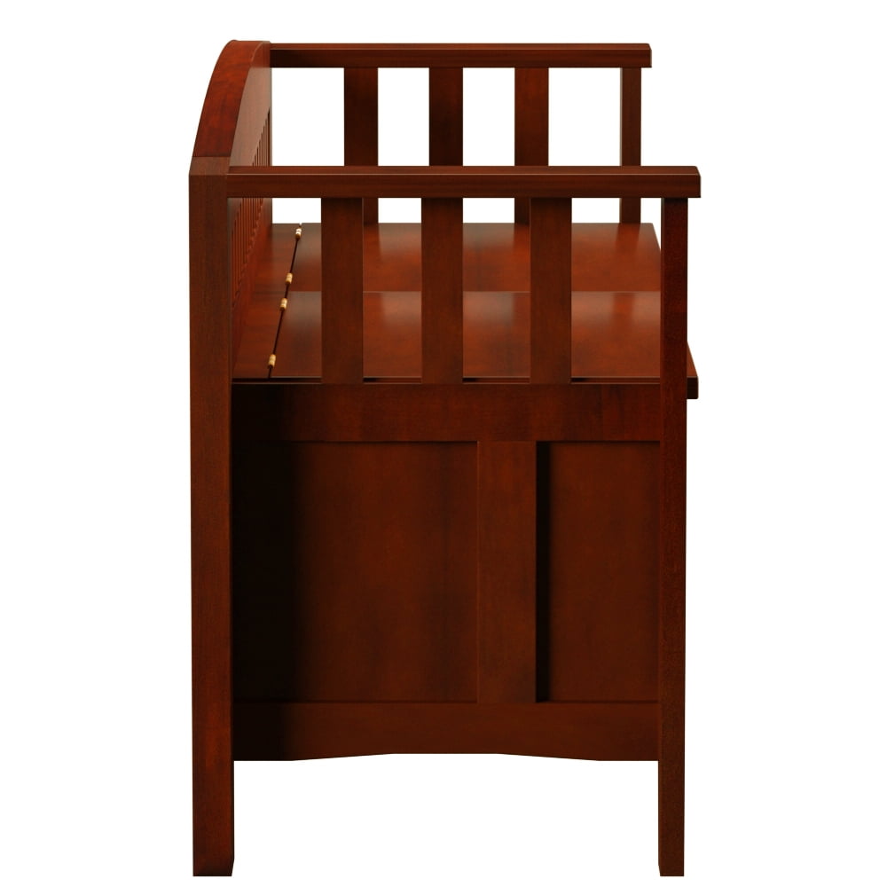 Walnut finish Features a split seat Slat designed low back and sides Solid and durable construction from rubberwood and rubberwood veneers over particleboard Easy to assembly Seat Dimensions: 17″ Seat Height, 21.93″ x 14.37″ x 0.59″ Storage Compartment Dimensions: 44.57″ x 14.45″ x 10.24″ Weight Limit: 275 lbs. Assembled Dimensions: 50″ w x 17″ d x 25.25″ h Ships in 1 box