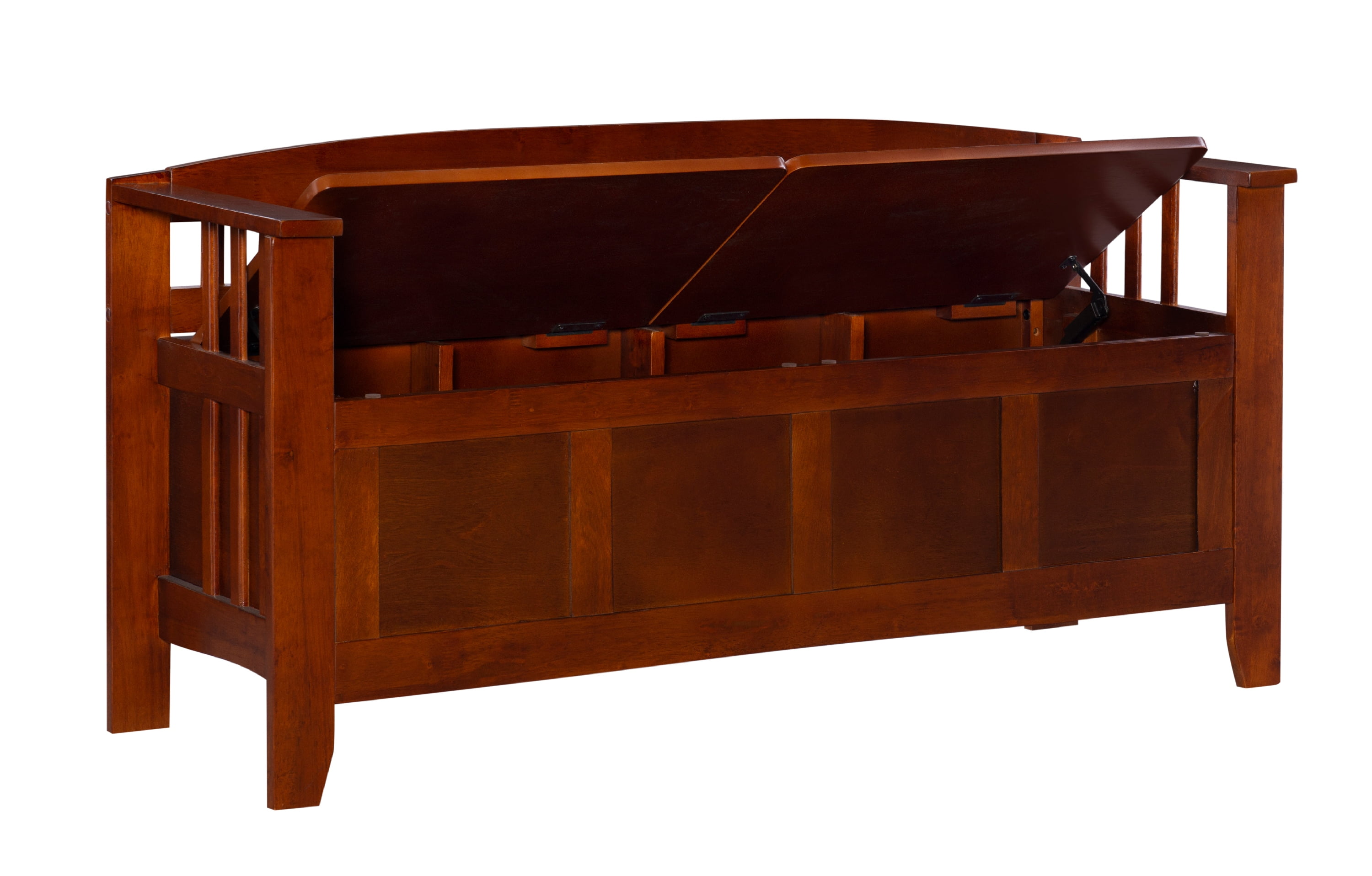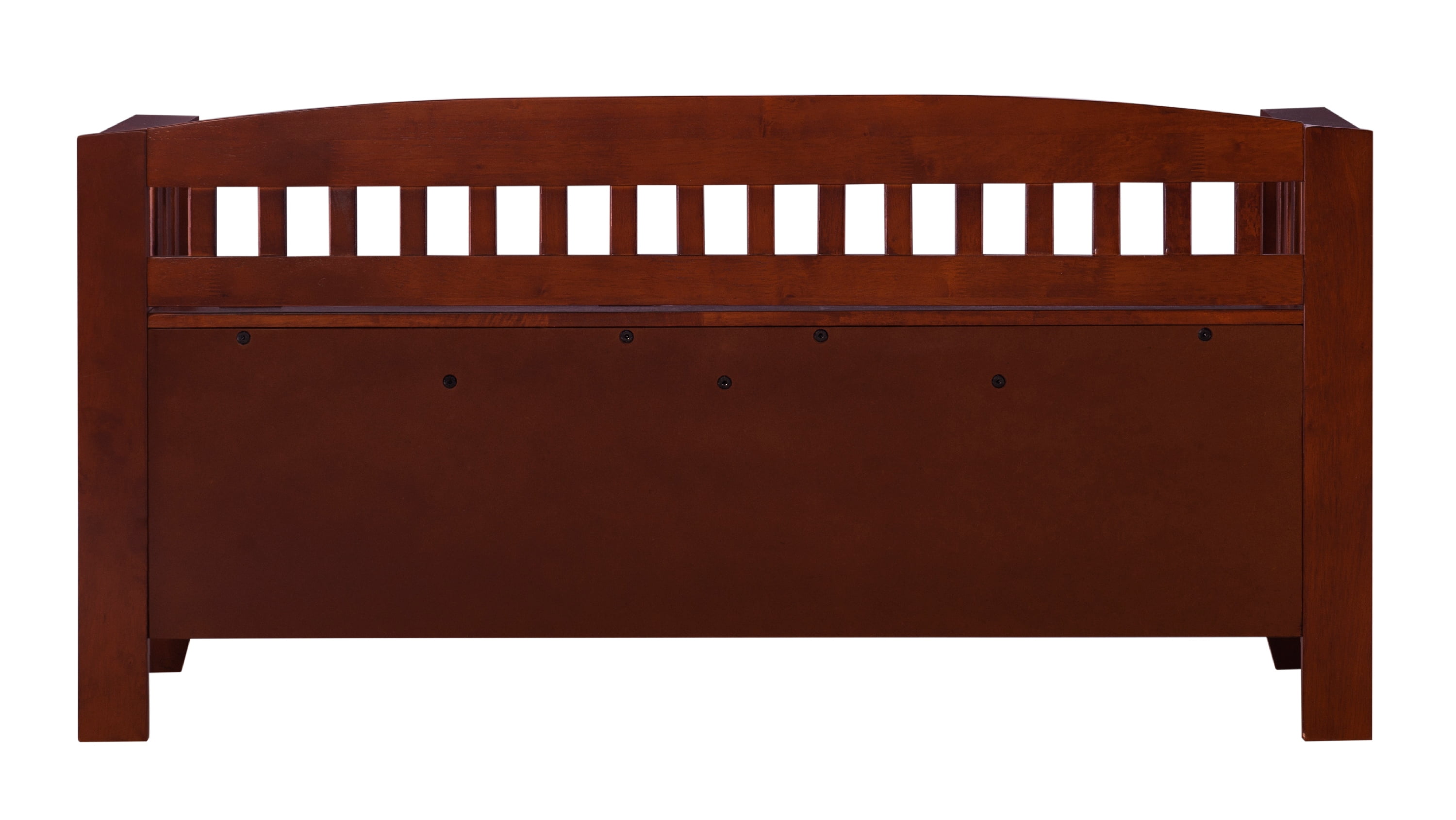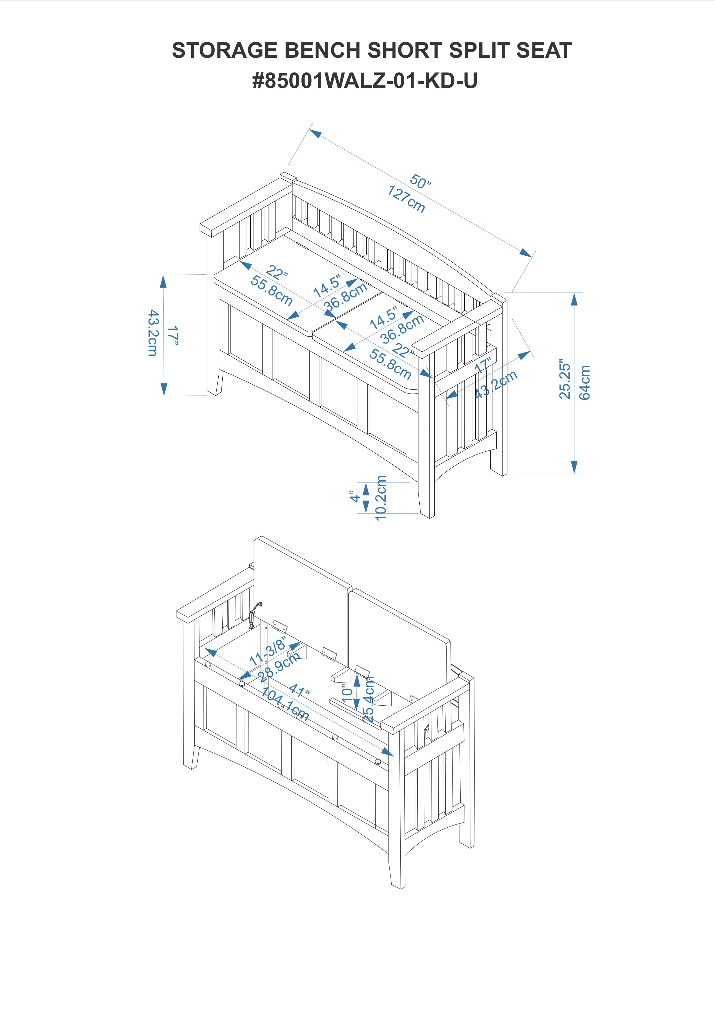 Walnut finish Features a split seat Slat designed low back and sides Solid and durable construction from rubberwood and rubberwood veneers over particleboard Easy to assembly Seat Dimensions: 17″ Seat Height, 21.93″ x 14.37″ x 0.59″ Storage Compartment Dimensions: 44.57″ x 14.45″ x 10.24″ Weight Limit: 275 lbs. Assembled Dimensions: 50″ w x 17″ d x 25.25″ h Ships in 1 box