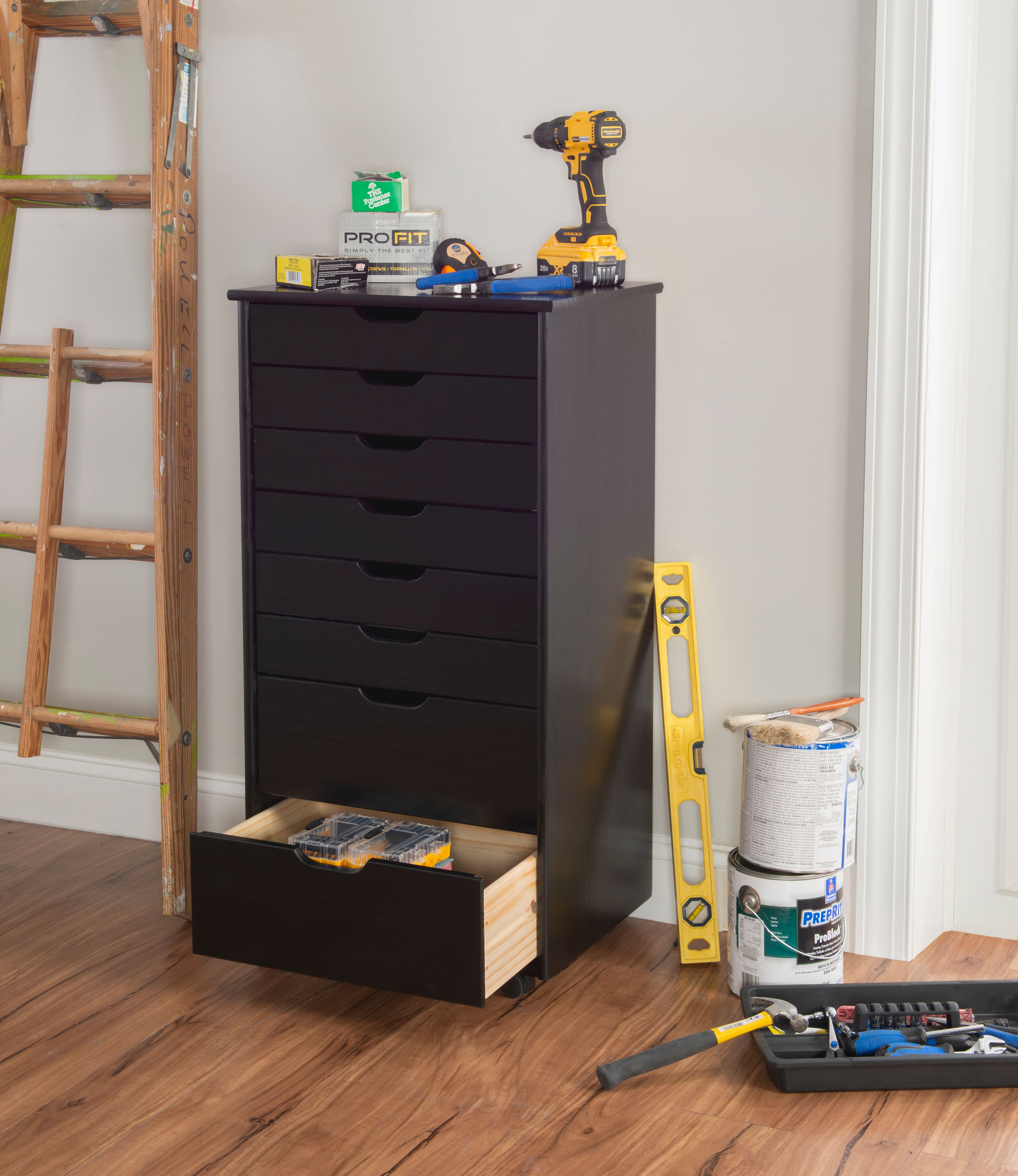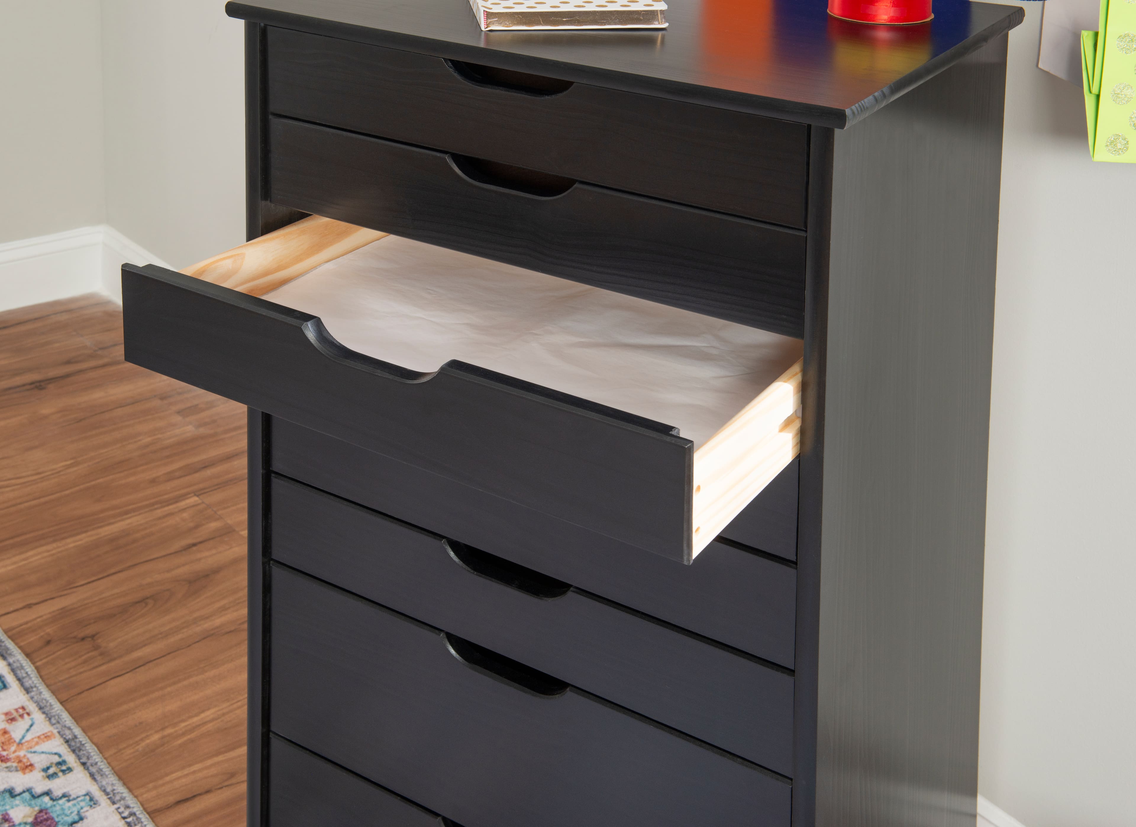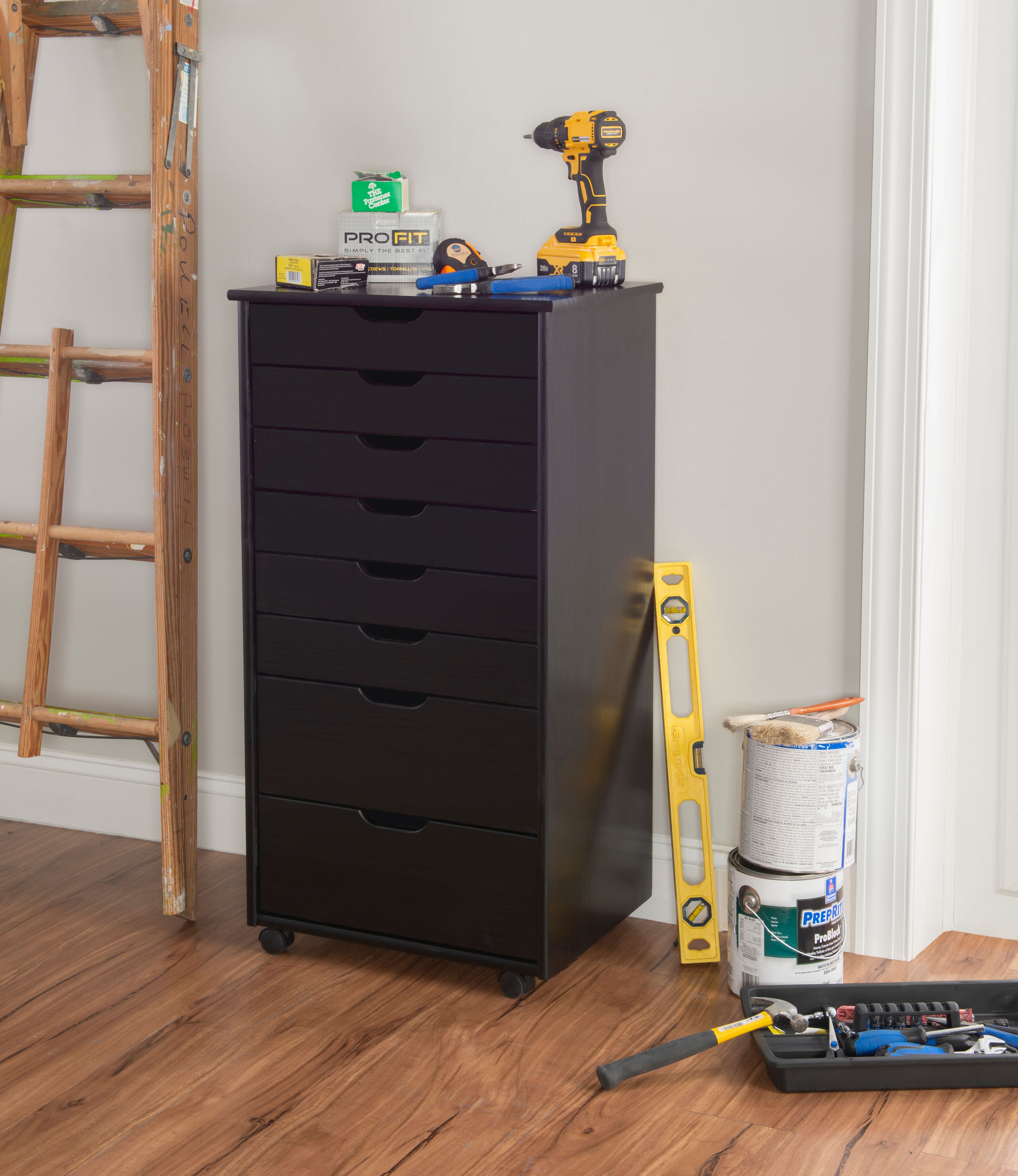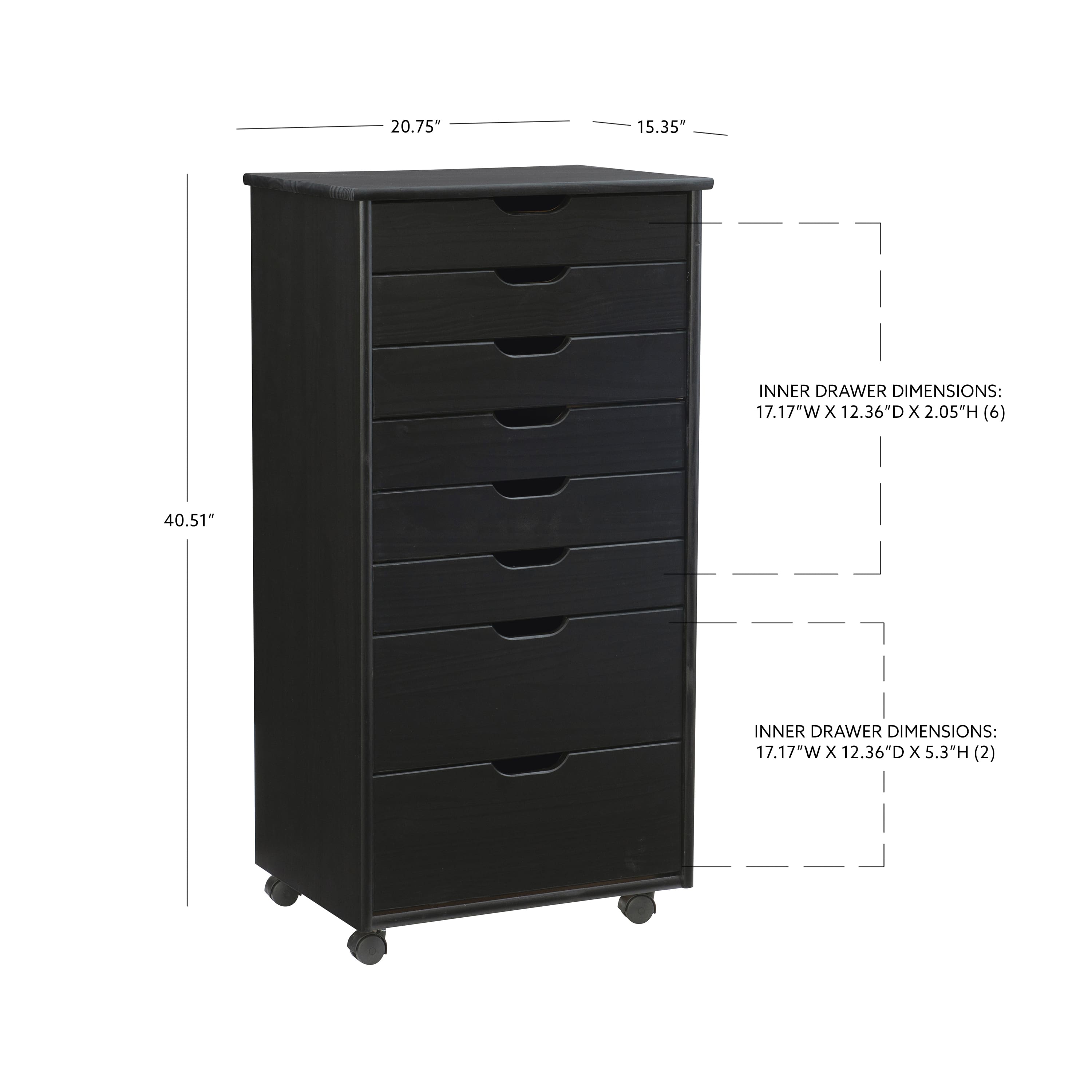 The Monte Eight-Drawer Rolling Storage Cart is a versatile storage solution for office, kitchen, bedroom or anywhere where organization is needed. This sturdy cart is solidly constructed from pine wood and finished in a handsome black. Six equal size and two deep drawers are finished off with an ample top that can go next to a desk or craft table to put items within reach. Soft contoured handle cut outs are easy on the hands and create a clean, modern look. Drawers can be easily removed and used as a tray to transport your items to your workspace. Casters make this piece mobile to go into any room easily.