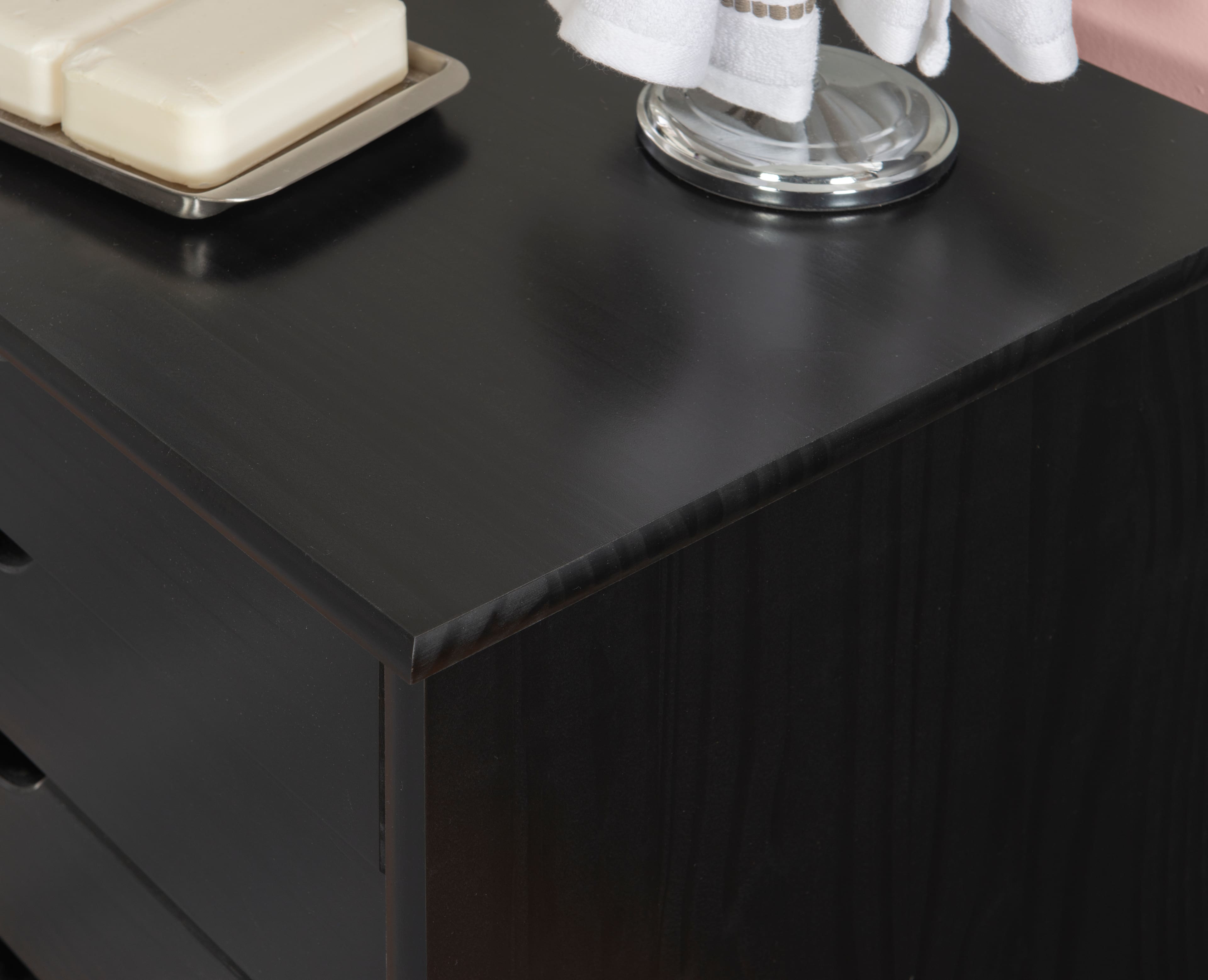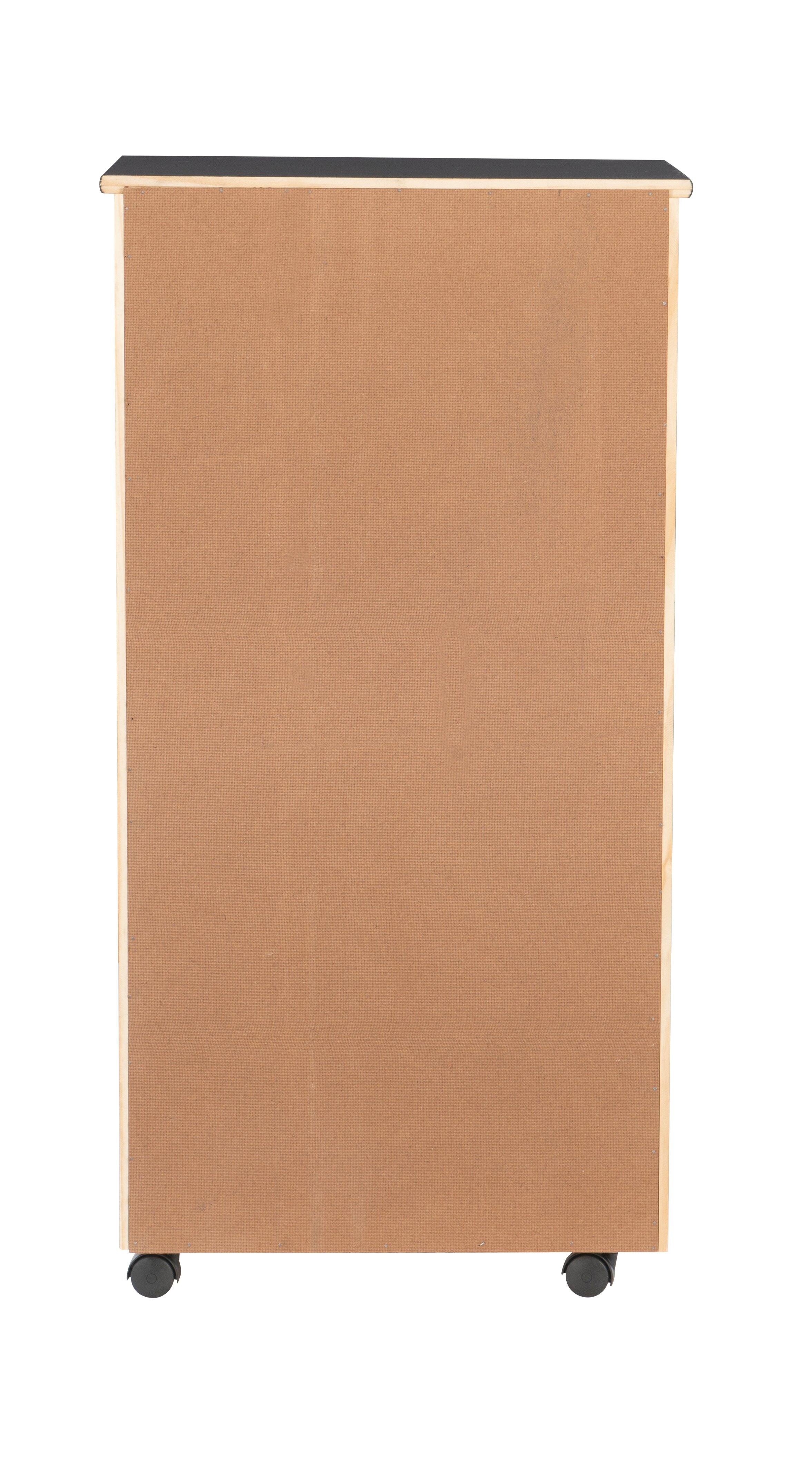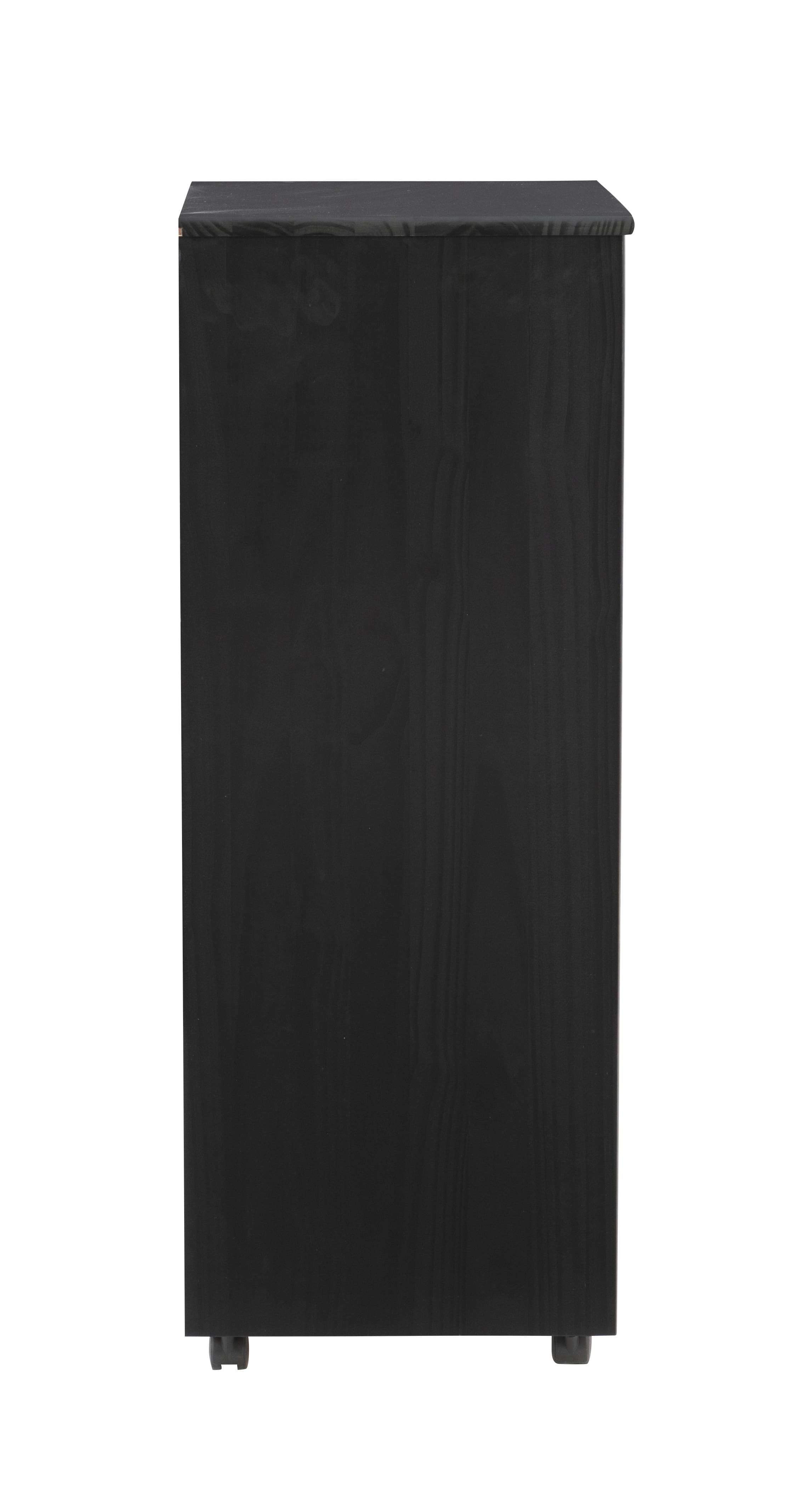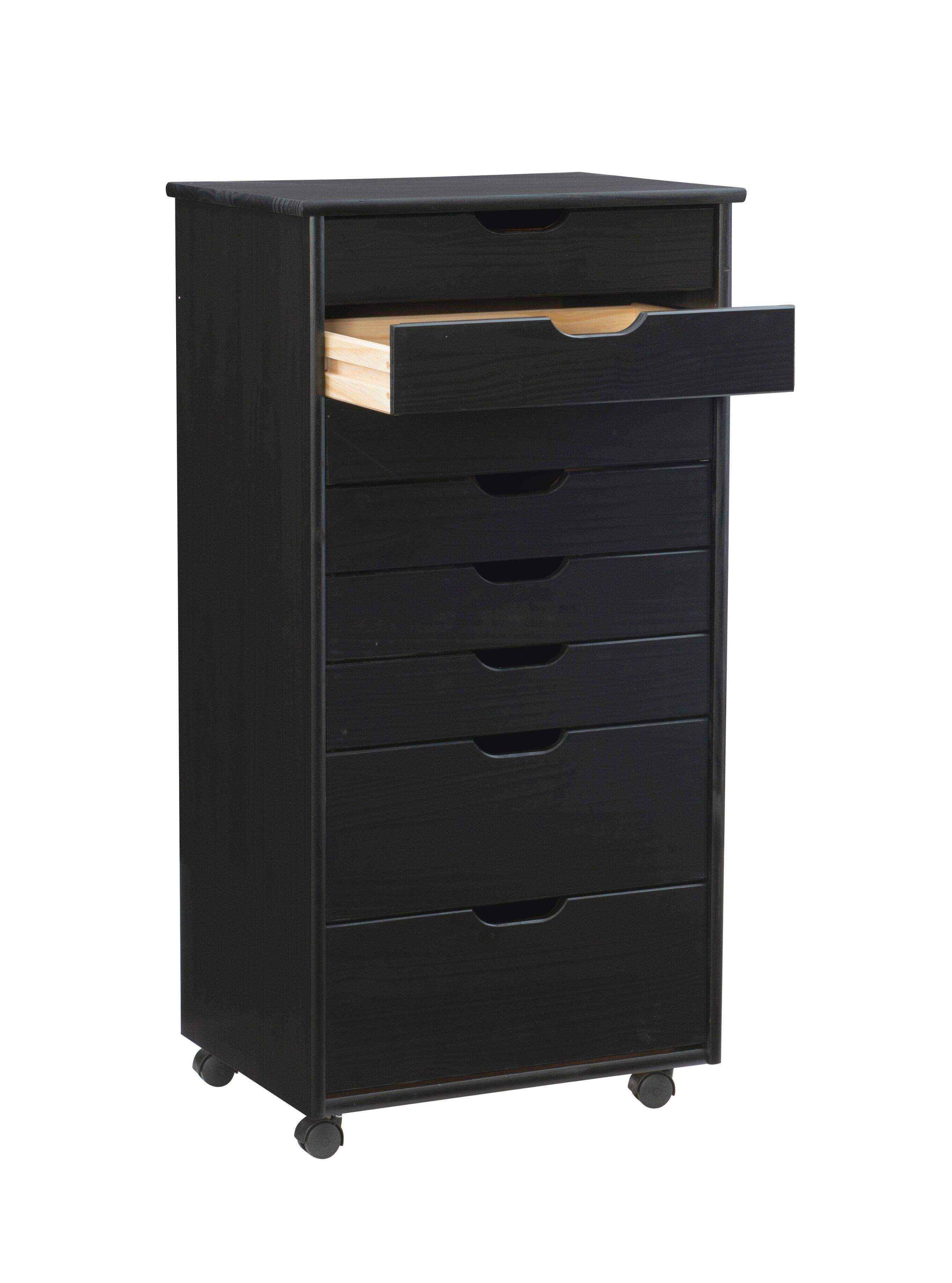 The Monte Eight-Drawer Rolling Storage Cart is a versatile storage solution for office, kitchen, bedroom or anywhere where organization is needed. This sturdy cart is solidly constructed from pine wood and finished in a handsome black. Six equal size and two deep drawers are finished off with an ample top that can go next to a desk or craft table to put items within reach. Soft contoured handle cut outs are easy on the hands and create a clean, modern look. Drawers can be easily removed and used as a tray to transport your items to your workspace. Casters make this piece mobile to go into any room easily.