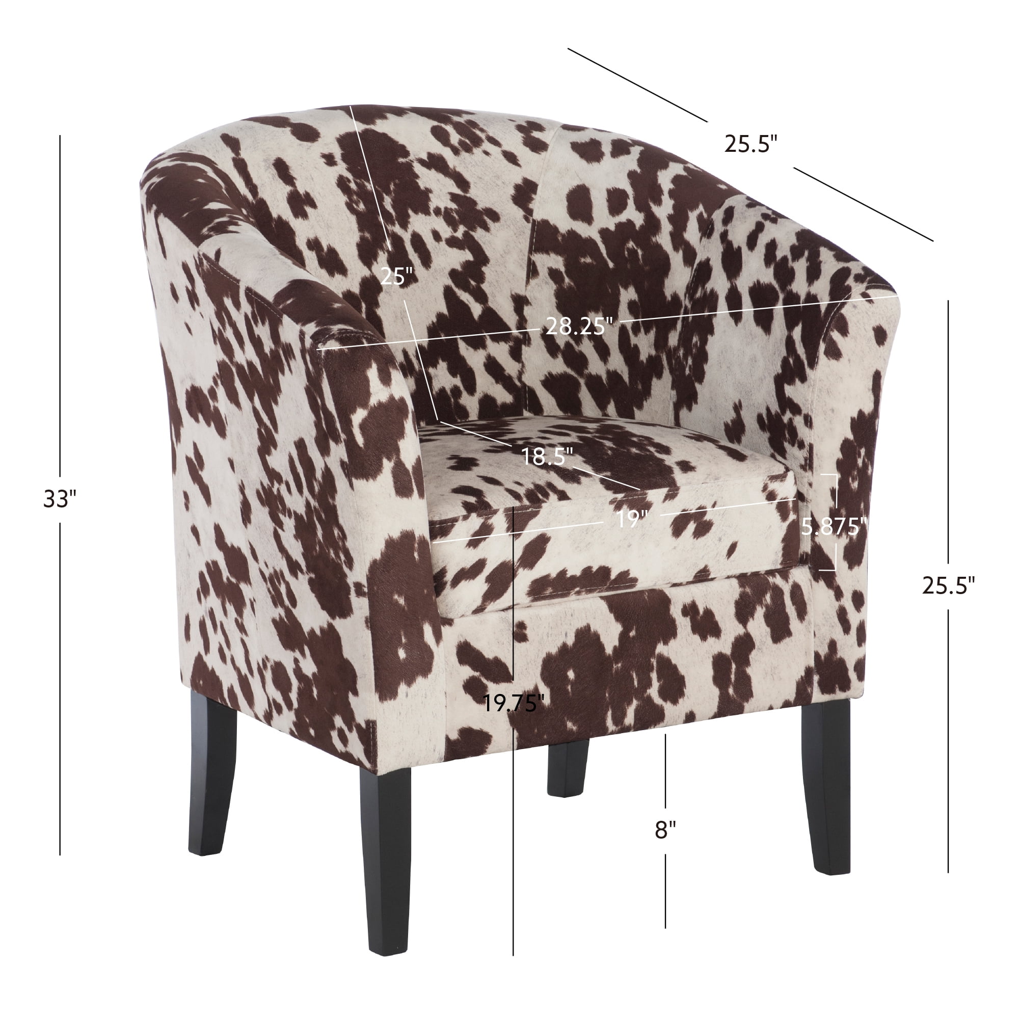 Enhance the look of any room with the bold Udder Madness Simon Club Chair. Perfect for adding a fun seating option to your space, the chair is upholstered in a brown cow print poly microfiber fabric. Sturdy and durable for lasting comfort. Features: Crafted from Wood, Foam and Fabric Dark Walnut Finish Brown Cowprint 100% Printed Polyester Microfiber Upholstery A bold, fun addition to any room Plush seat for comfort Flared armrests High arms and a deep seat Arching backrest Specifications: Assembly Required: Some Assembly Required Product Dimensions: 28.25″w x 25.5″d x 33″h Product Weight: 37.49 lbs Seat Height: 19.75″ Seat Dimensions: 18.5″ x 18″ x 5.88″ Weight Capacity: 300 lbs
