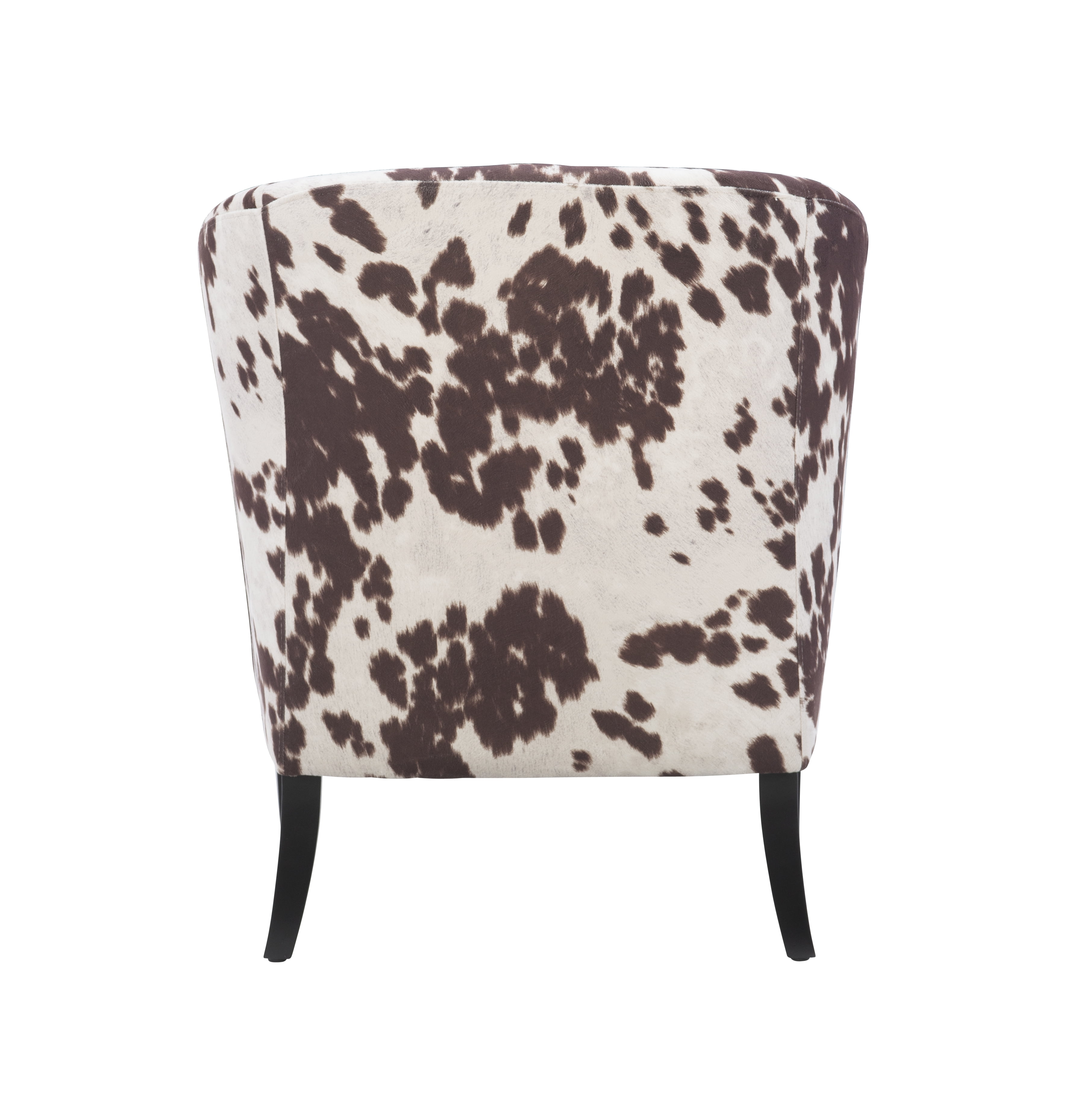 Crafted from Wood, Foam and Fabric Dark Walnut Finish Brown Cowprint 100% Printed Polyester Microfiber Upholstery A bold, fun addition to any room Plush seat for comfort Flared armrests High arms and a deep seat Arching backrest