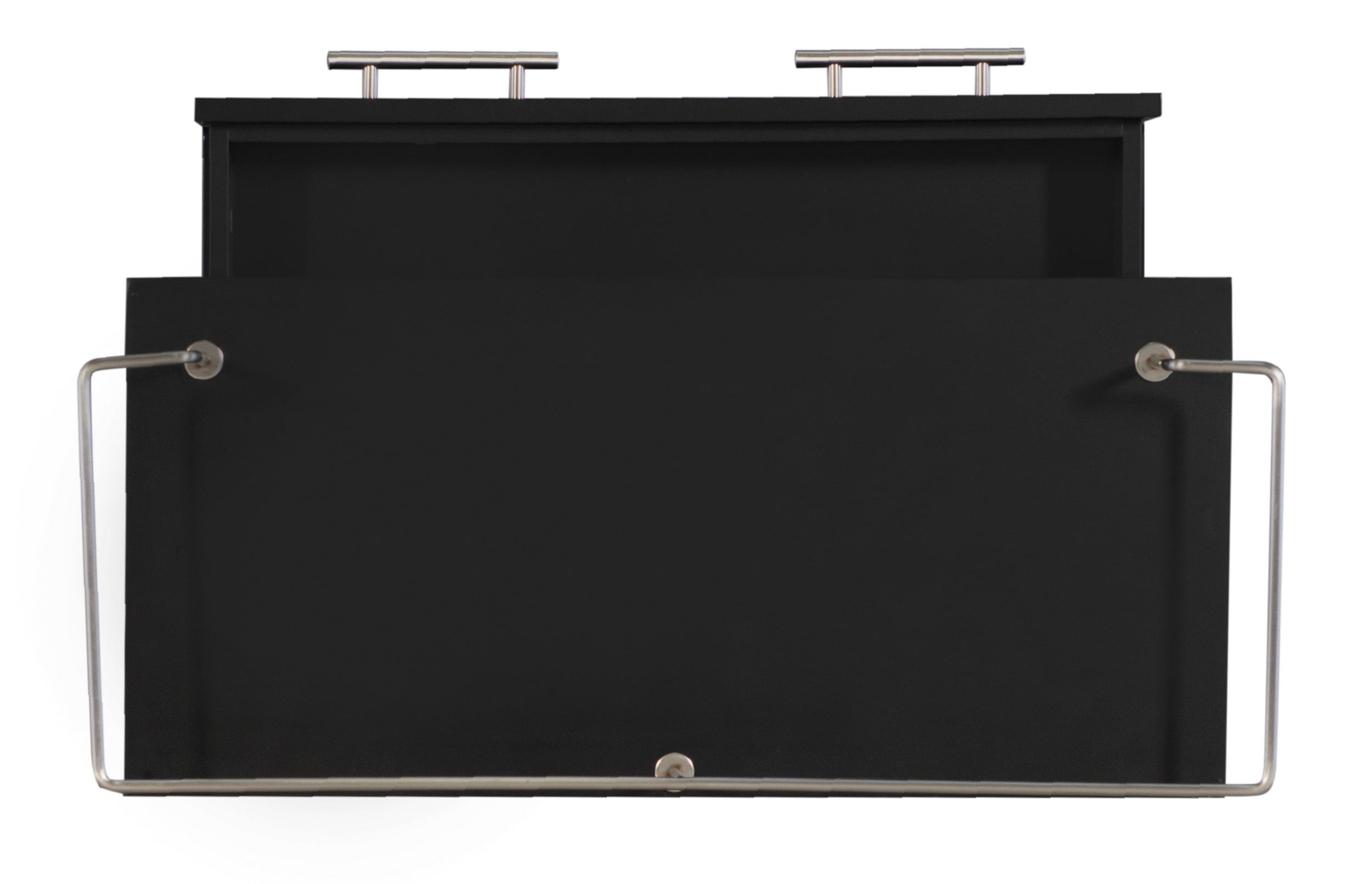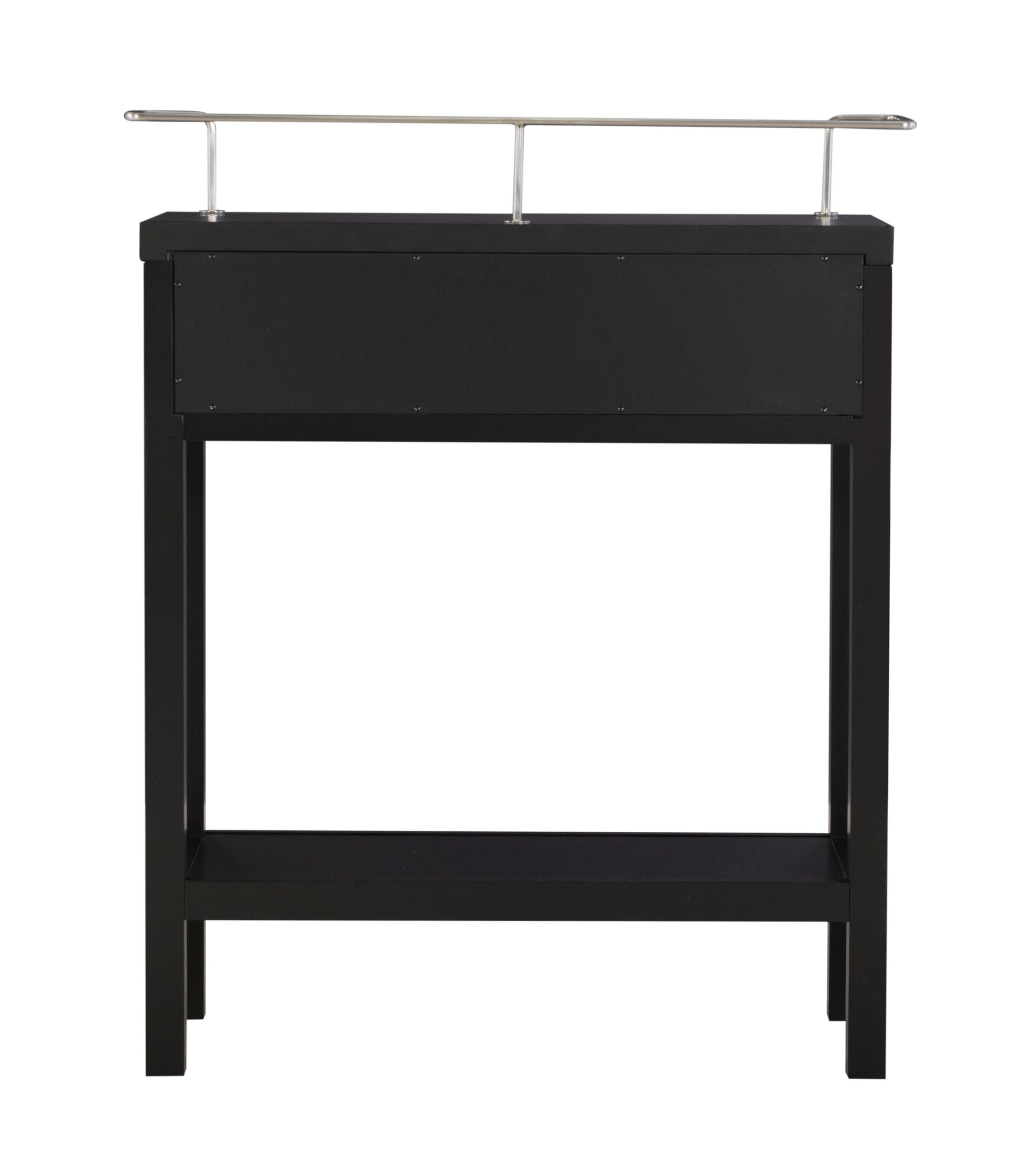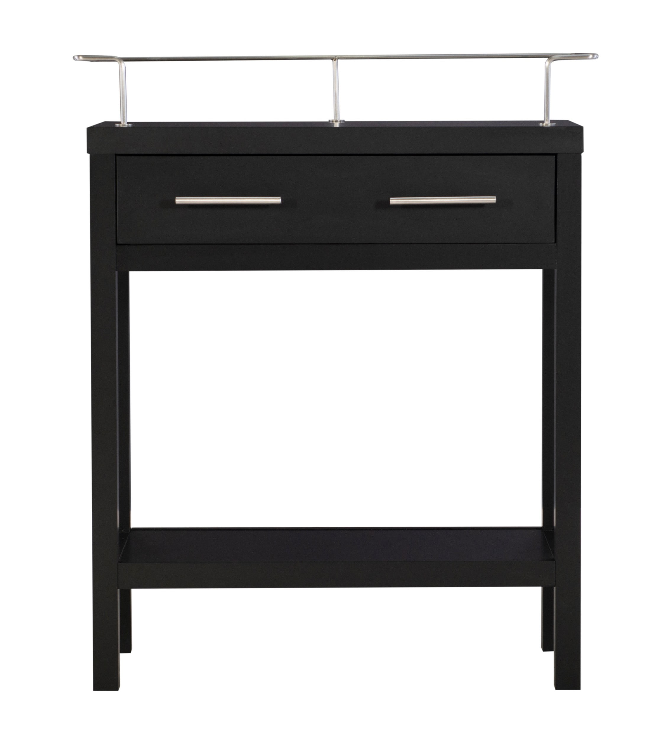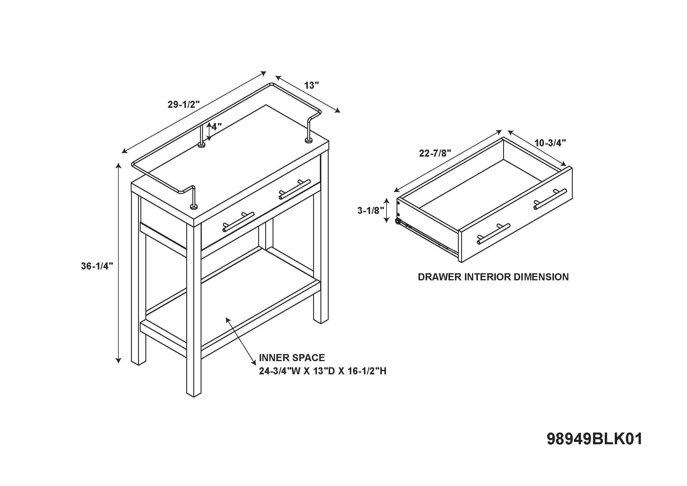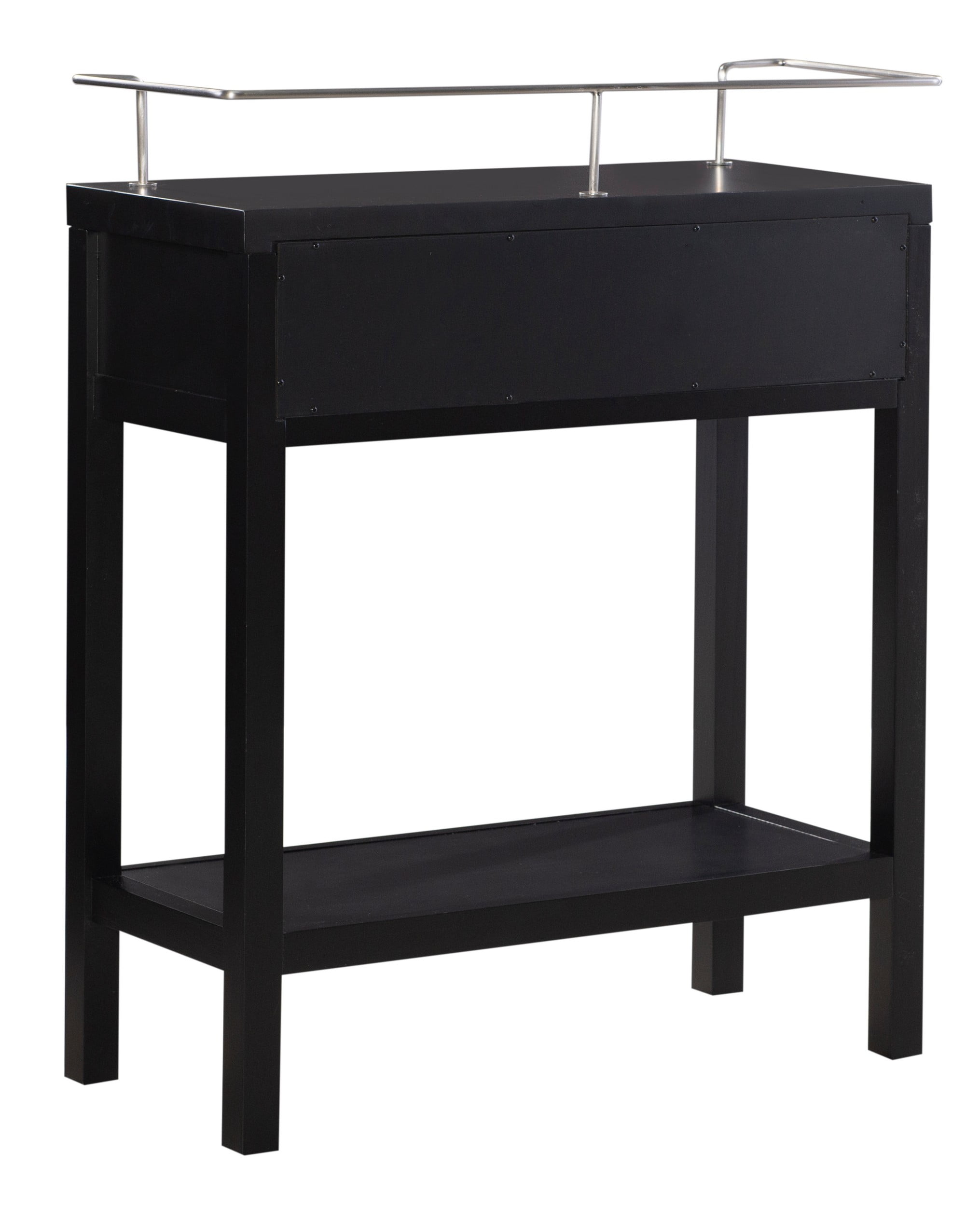 Linon Hoover Console, Black, 1 Drawer, 2 Shelves: Black Finish Modern Style One Drawer with Top and Bottom Shelf Storage Silver Metal Hardware Durable and Sturdy Materials: Pine Wood, MDF, Hardware Dimensions: 28″w x 13″d x 32-36″h Carton Dimensions: 16.5″w x 10.8″d x 34.75″h Some Assembly Required Sku: BA007BLK01