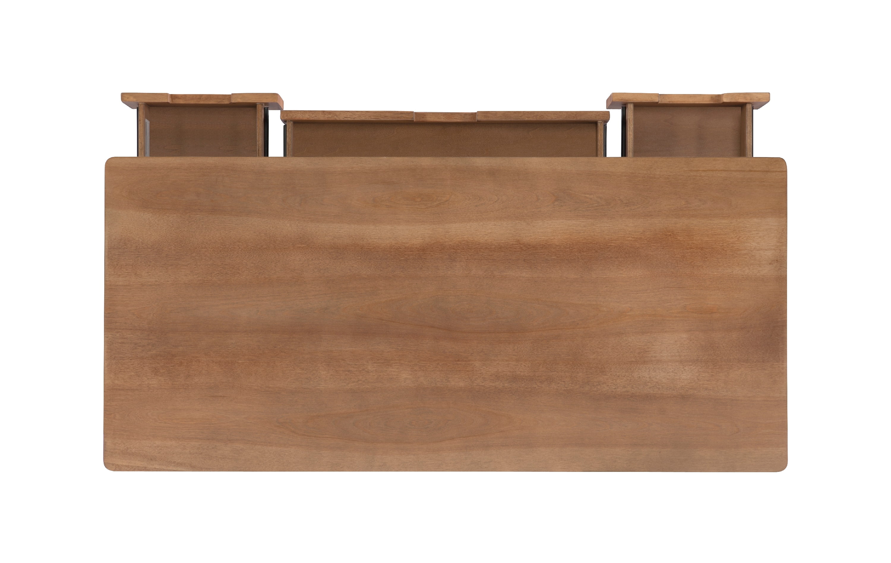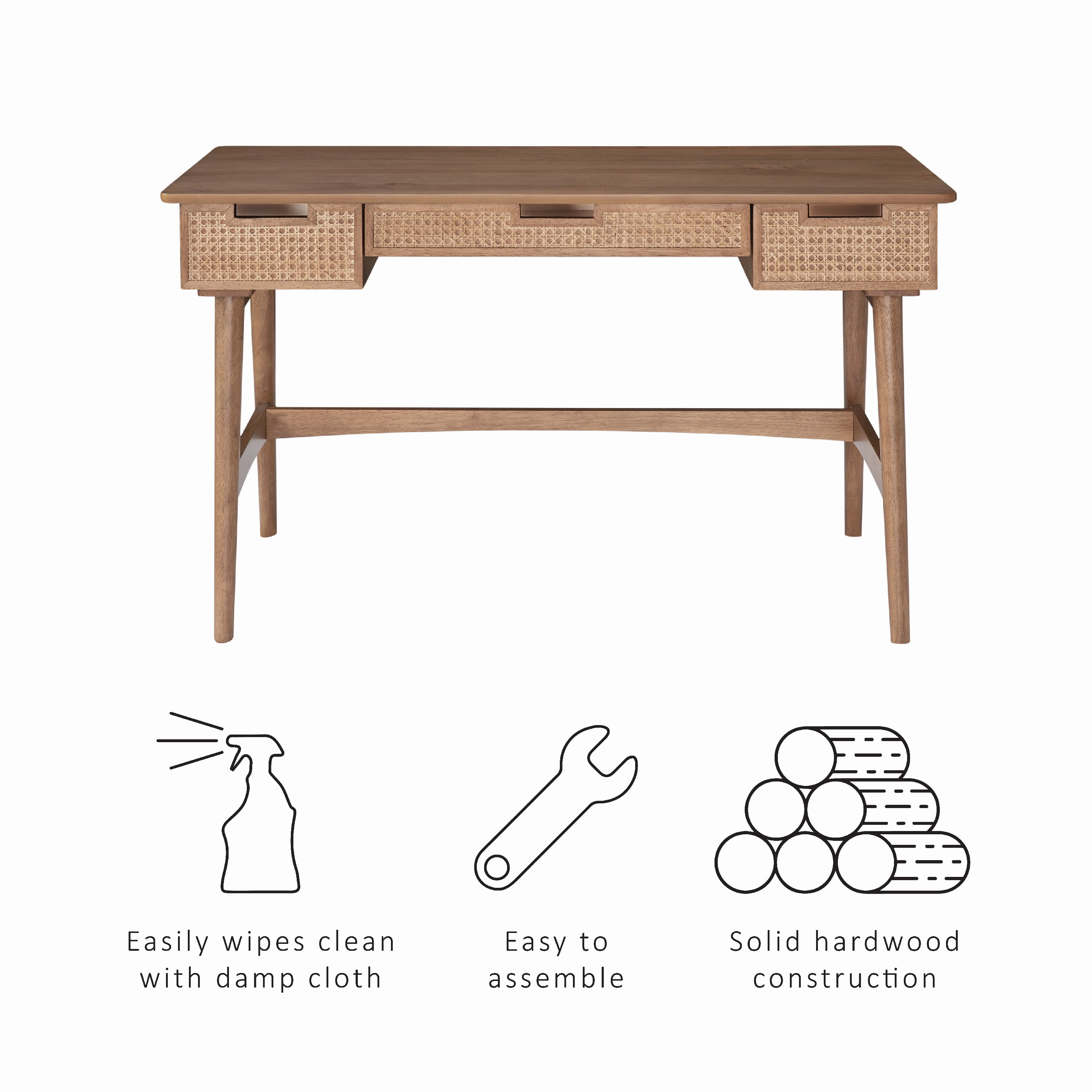 51″ x 23.5″ tabletop offers ample workspace 3 drawers with woven rattan front panels provide stylish storage Sturdy base is made of solid wood Top, side, and back panels are coated with beautiful birch veneer Glides on feet of base protect floors from damage Easily wipes clean with a damp cloth Easy assembly Assembled Dimensions: 50.94″ W x 23.5″ D x 30.51″ H Ships in 1 box