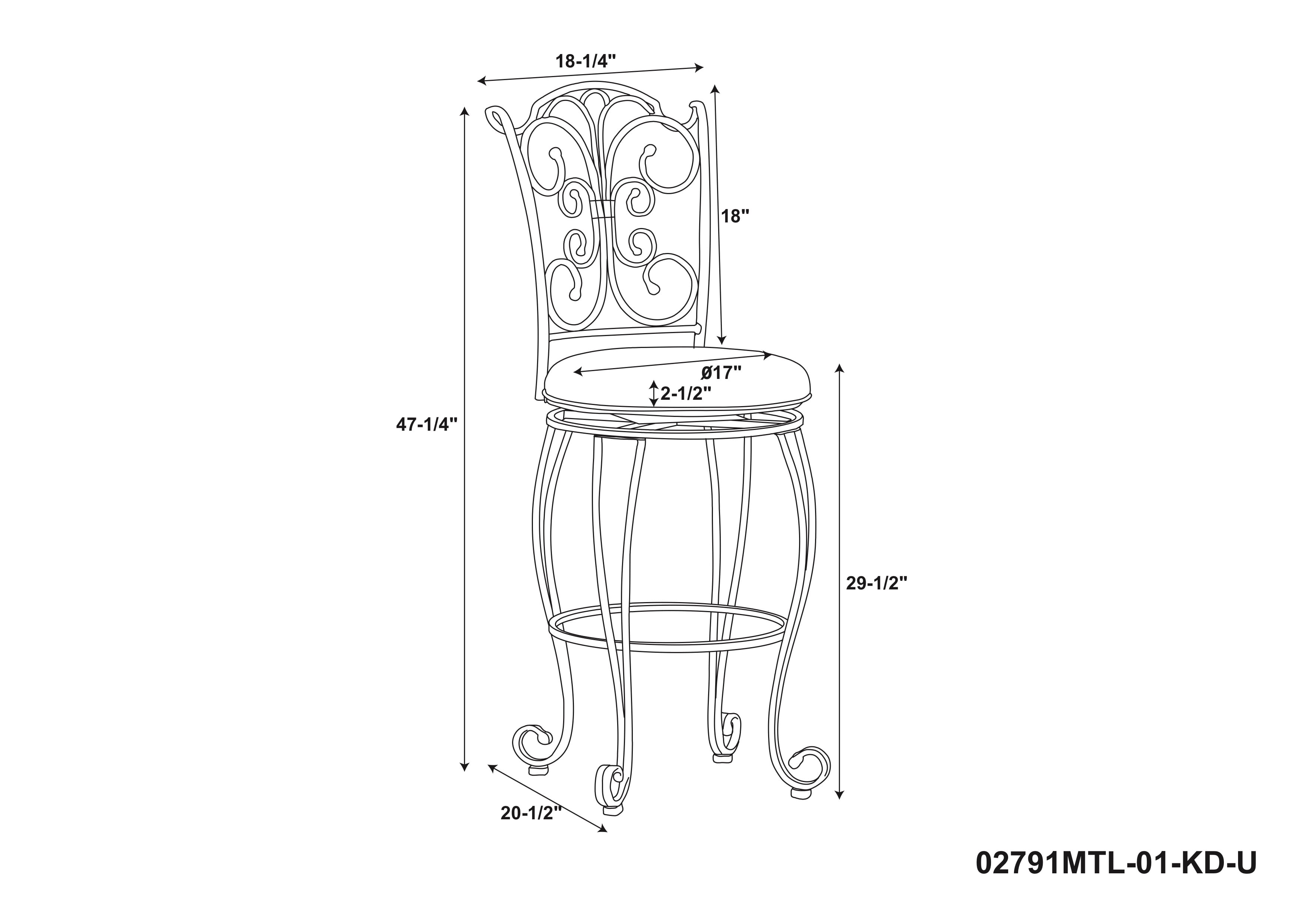 Swivel seat Light brown/caramel polyester seat cover Crafted of metal and highlighted with subtle curves and a distinctive back The cushion is piled high for extra comfort Seat Dimensions: 29″ seat height, 17.7″x17.7″x2.35″ Weight Limit: 275 lbs Assembled Dimensions: 18″w x 19.62″d x 46.5″h Ships in 1 box