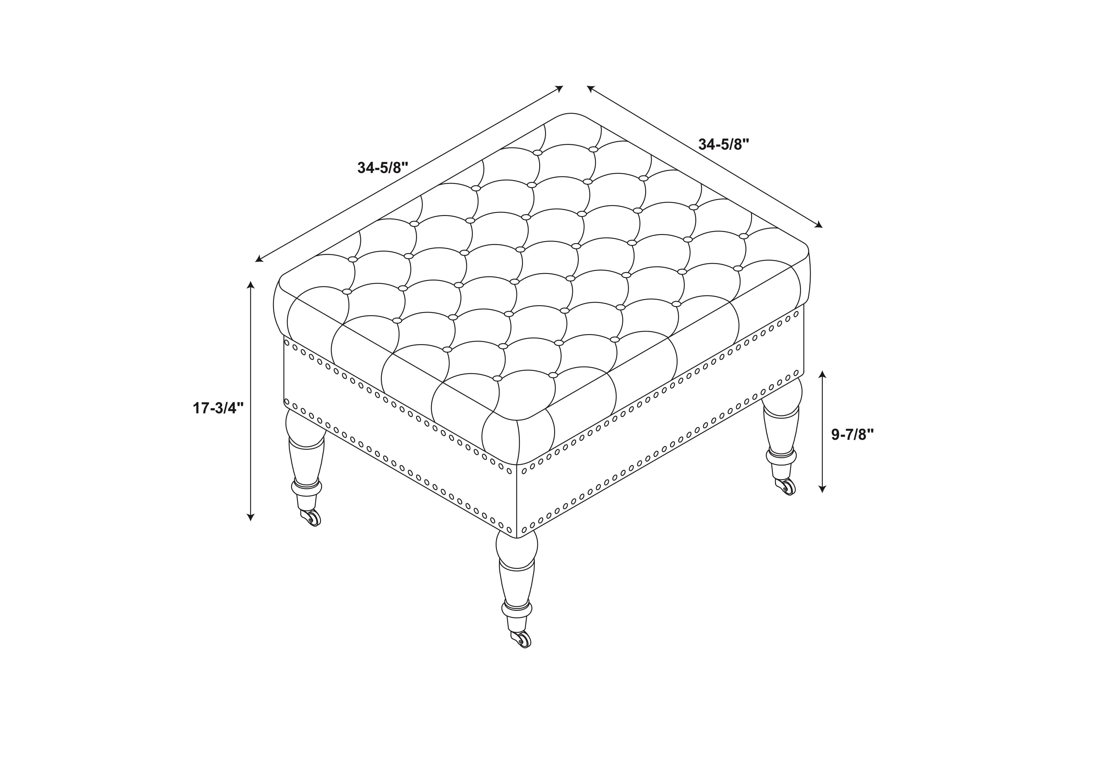 Crafted from Birch, Fabric, CA Firefoam and Metal Casters Dark Espresso Finish Natural Linen Beige Upholstery (100% Polyester) Burnished Bronze Nailheads Chic, sophisticated square design Tufted Top