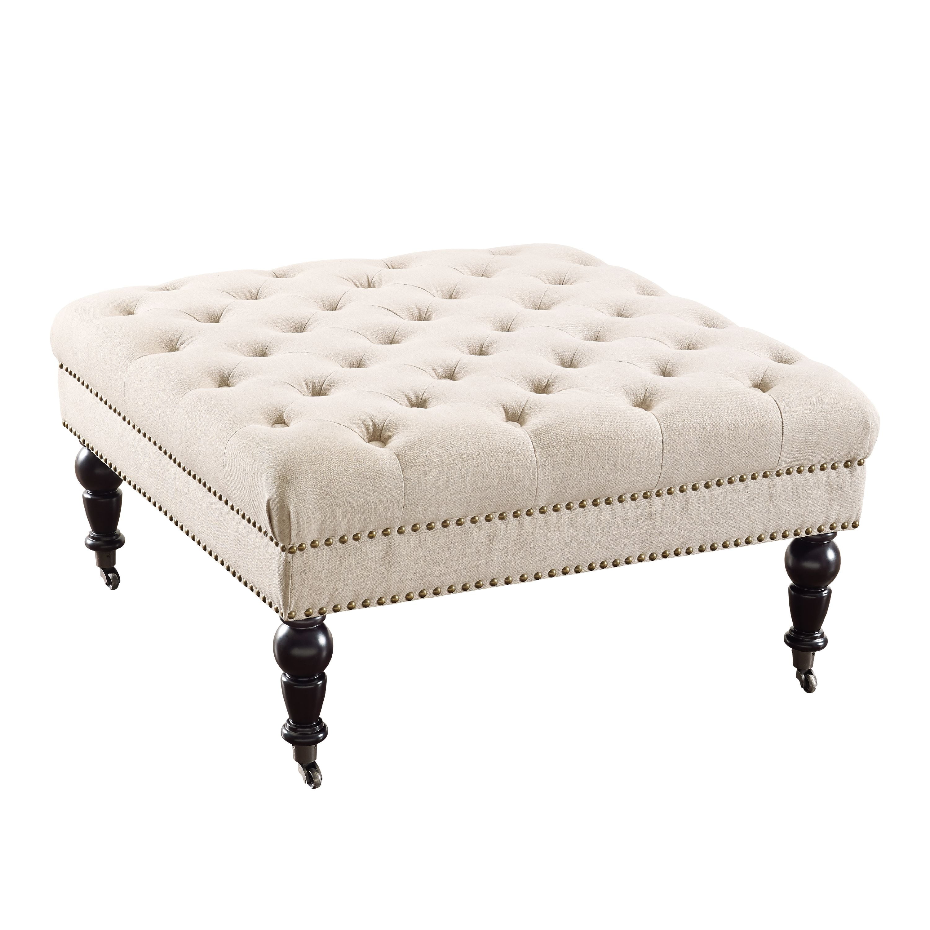The Isabelle Square Ottoman is a stylish and versatile addition to your home’s décor. Perfect for use as an ottoman or coffee table, the piece has a tufted top upholstered in a natural linen fabric. Burnished Bronze nailheads accent the side, while turned dark espresso finished legs complete the piece. Features: Crafted from Birch, Fabric, CA Firefoam and Metal Casters Dark Espresso Finish Natural Linen Beige Upholstery (100% Polyester) Burnished Bronze Nailheads Chic, sophisticated square design Tufted Top Specifications: Assembly Required: Some Assembly Required Product Dimensions: 34.63″w x 34.63″d x 17.72″h Product Weight: 30.87 lbs Seat Height: 17.72″ Seat Dimensions: 34.63″ x 34.63″ Weight Capacity: 275 lbs