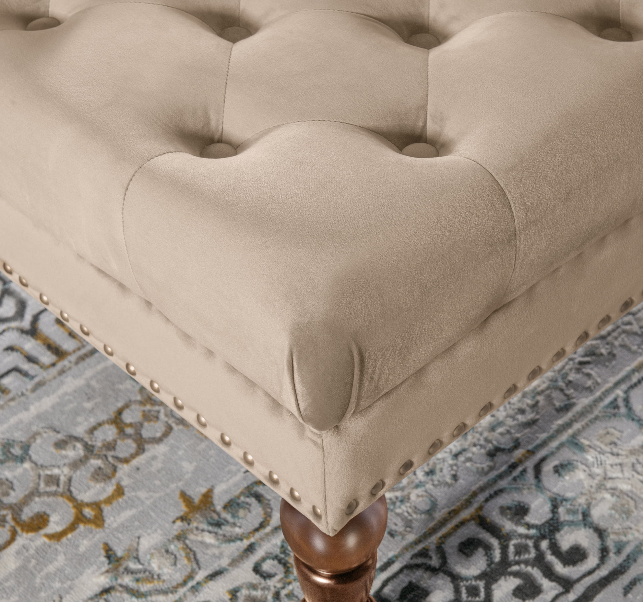 Chic, sophisticated square design Tufted Top Antique Brass Nailheads Dark Walnut Tan Velvet 100% Polyester Some Assembly Required
