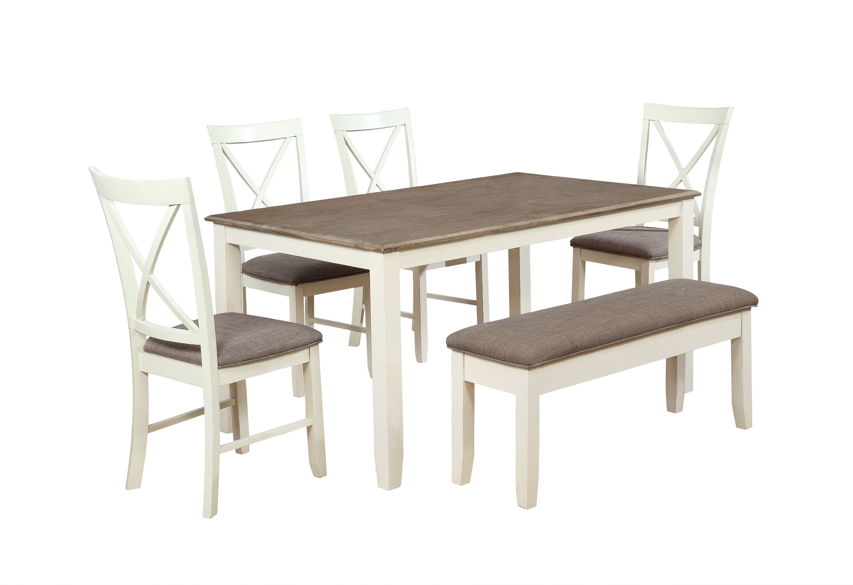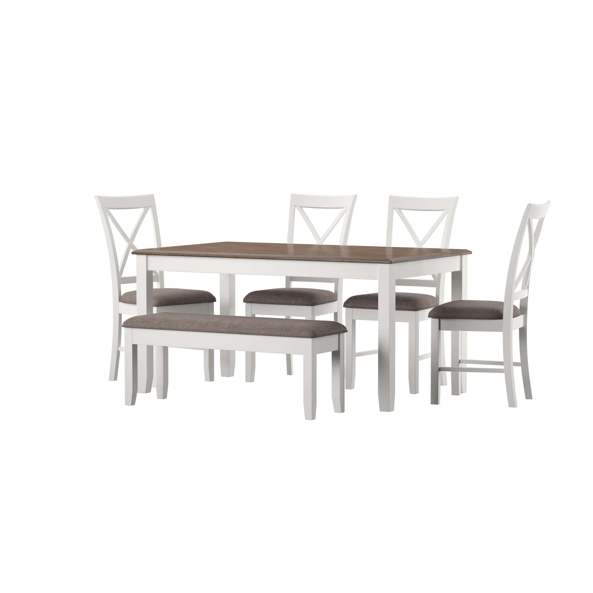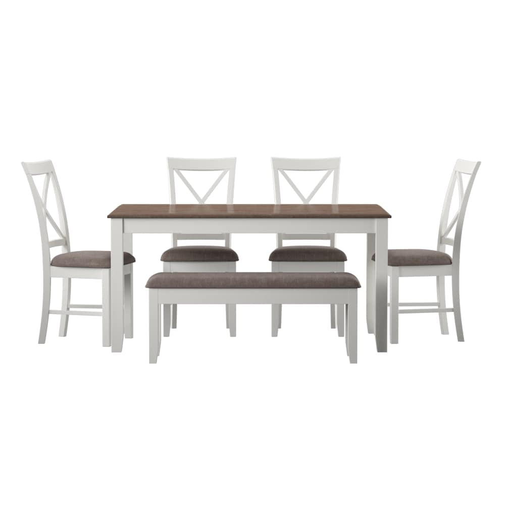 Gather around this handsome six-piece dining set featuring a timeless four post table, four matching chairs, and one bench. Comfortably accommodates six adults. Constructed from rubberwood with an ash wood veneer in a rustic taupe and vanilla white finish, the table offers a natural warmth complemented by the crisp chair upholstery. Neutral hues suit any color scheme while the padded stain resistant upholstery ensures premium comfort. By balancing durability with style, this set offers long-lasting beauty for years to come. Features: Crafted from Rubberwood and MDF Vanilla White and Rustic Taupe Finish Rustic Taupe 100% Polyester Upholstery Six piece dining set includes four chairs, one bench and one table Chairs feature an X-back design Bench opens for storage. Interior dimensions: 35″ x 10.4″ x 3.7″ Table comfortably seats 4-6 people This item will ship in multiple cartons. Cartons may arrive separately Interior storage dimensions for bench: 35″ x 10.4″ x 3.7″ Specifications: Assembly Required: Some Assembly Required Product Dimensions: Table: 60″w x 36″d x 30.5″h, Chairs: 7.5″w x 22″d x 40″h, Bench: 44″w x 14″d x 19.25″h Product Weight: Table: 74.97 lbs, Chair: 17.5 lbs, Bench: 28.6 lbs Seat Height: Chair: 19.5″, Bench: 19.5″ Seat Dimensions: Chair: 14.75″w x 16.75″d, Bench: 45″w x 14″w Weight Capacity: Table: 150 lbs, Chair: 350 lbs, Bench: 400 lbs