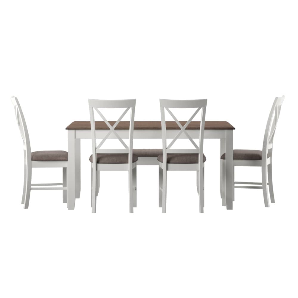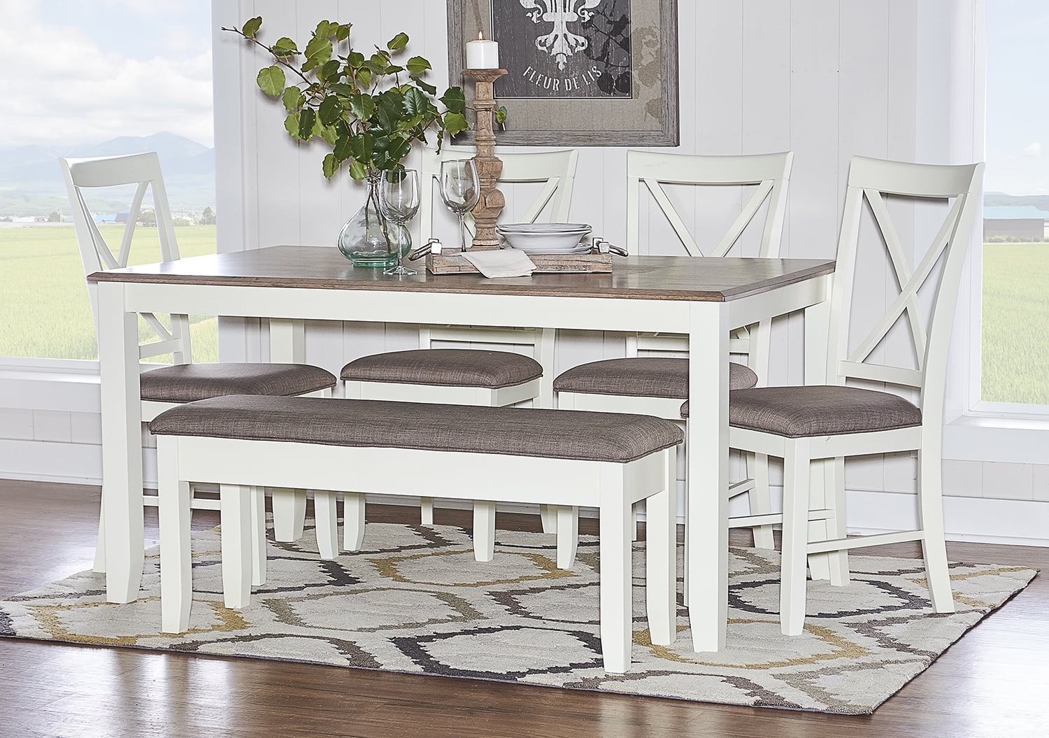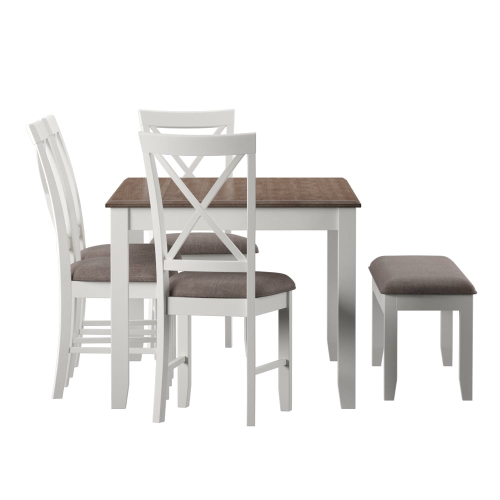 Gather around this handsome six-piece dining set featuring a timeless four post table, four matching chairs, and one bench. Comfortably accommodates six adults. Constructed from rubberwood with an ash wood veneer in a rustic taupe and vanilla white finish, the table offers a natural warmth complemented by the crisp chair upholstery. Neutral hues suit any color scheme while the padded stain resistant upholstery ensures premium comfort. By balancing durability with style, this set offers long-lasting beauty for years to come. Features: Crafted from Rubberwood and MDF Vanilla White and Rustic Taupe Finish Rustic Taupe 100% Polyester Upholstery Six piece dining set includes four chairs, one bench and one table Chairs feature an X-back design Bench opens for storage. Interior dimensions: 35″ x 10.4″ x 3.7″ Table comfortably seats 4-6 people This item will ship in multiple cartons. Cartons may arrive separately Interior storage dimensions for bench: 35″ x 10.4″ x 3.7″ Specifications: Assembly Required: Some Assembly Required Product Dimensions: Table: 60″w x 36″d x 30.5″h, Chairs: 7.5″w x 22″d x 40″h, Bench: 44″w x 14″d x 19.25″h Product Weight: Table: 74.97 lbs, Chair: 17.5 lbs, Bench: 28.6 lbs Seat Height: Chair: 19.5″, Bench: 19.5″ Seat Dimensions: Chair: 14.75″w x 16.75″d, Bench: 45″w x 14″w Weight Capacity: Table: 150 lbs, Chair: 350 lbs, Bench: 400 lbs