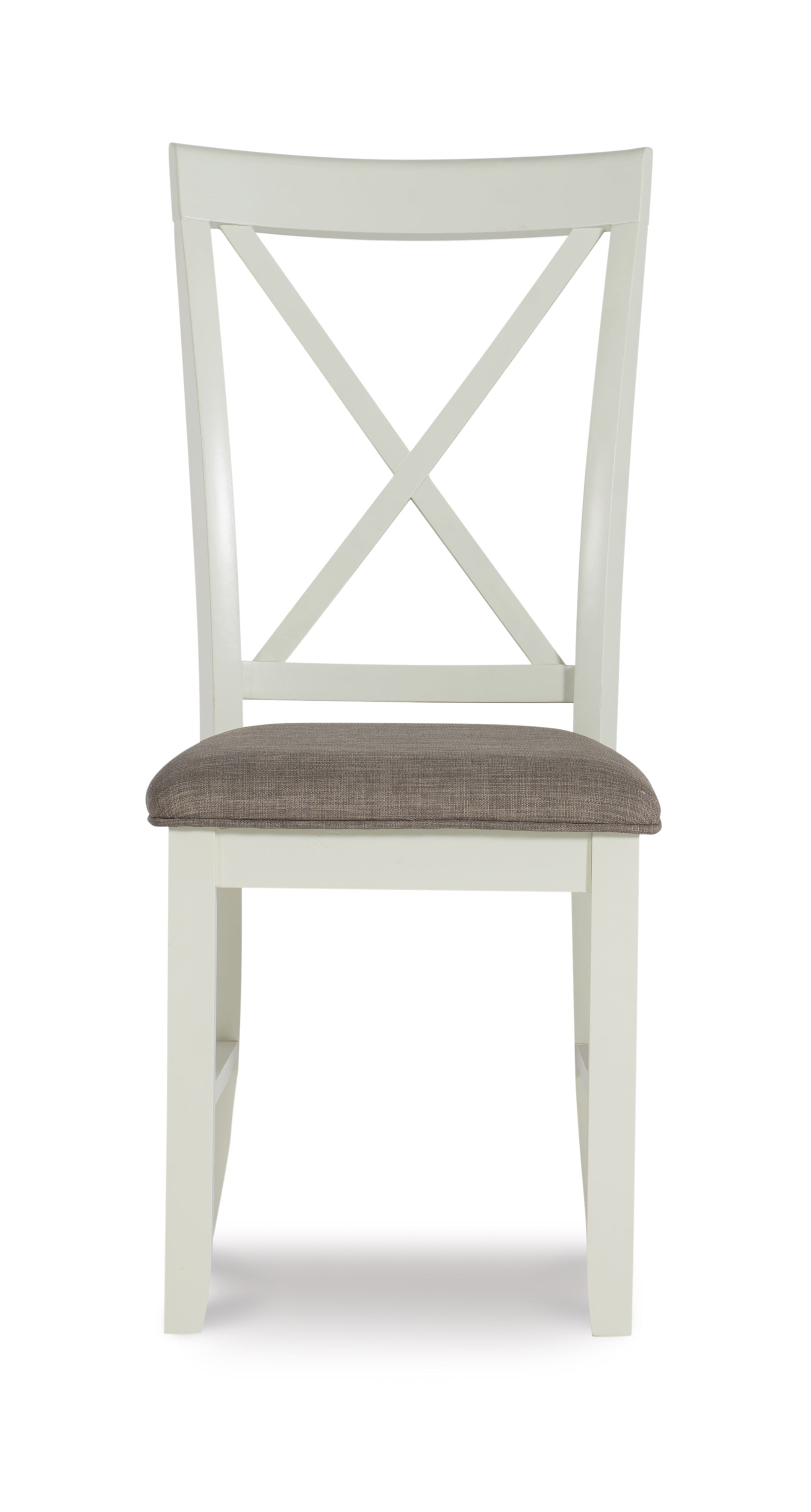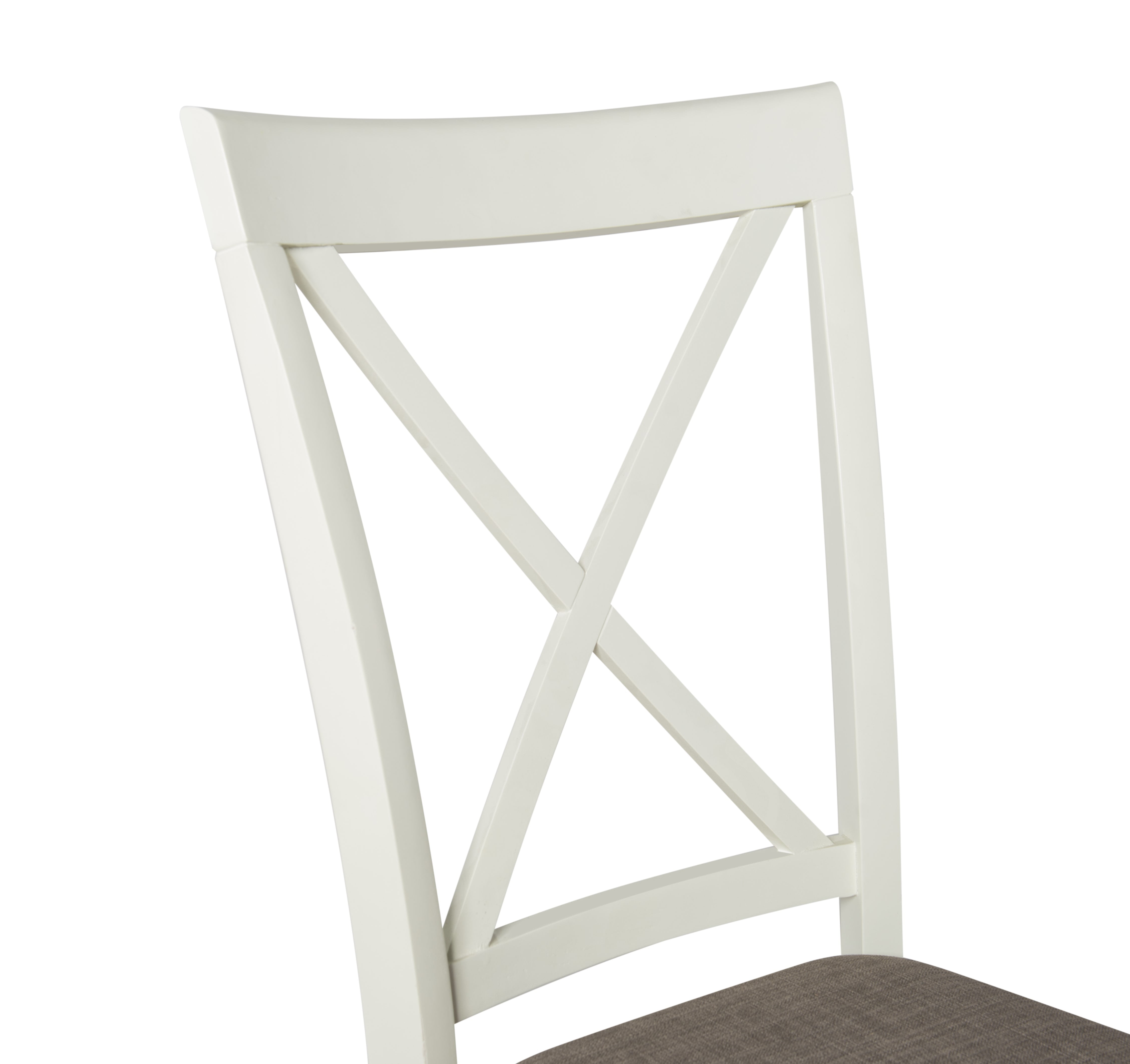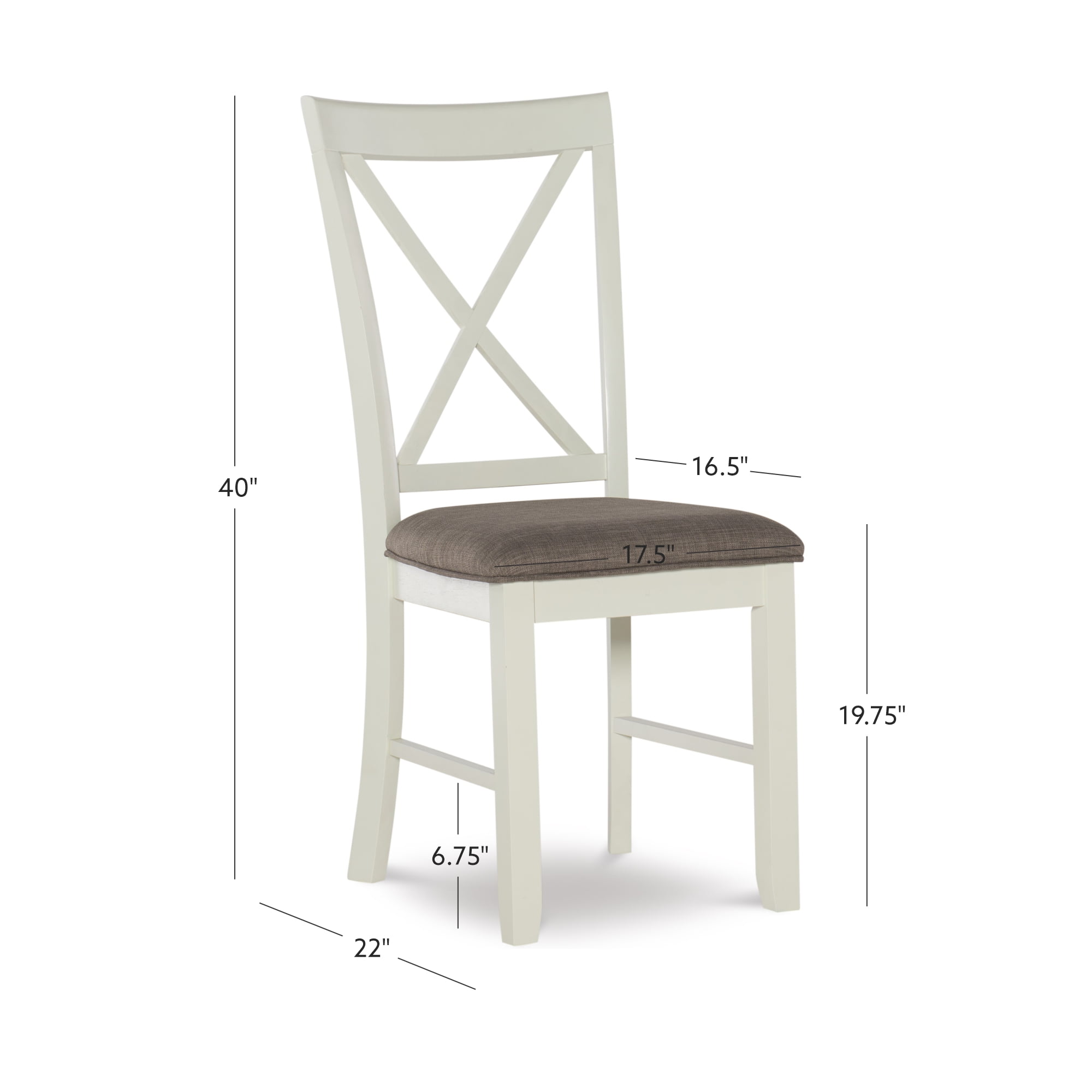 Elegant Design & Lasting Comfort: The Emma Farmhouse side chair showcases a timeless X-back design, adding a refined touch to your dining space. The taupe stain-resistant padded fabric seat enhances both aesthetics and comfort, ensuring a cozy experience for every meal. Exceptional Durability & Stability: Expertly crafted from solid rubberwood with a sturdy plywood back and reinforced with ash veneer, this chair is built to withstand daily use while maintaining its structural integrity for years to come. Farmhouse-Inspired Charm: Featuring a smoky white painted frame complemented by a soft vanilla white finish, this chair embodies rustic elegance, effortlessly creating a warm and welcoming dining atmosphere. Hassle-Free Maintenance: Upholstered in premium Nice N Clean® performance fabric, the light silver-gray seat repels spills from coffee, wine, ketchup, and more, allowing for quick and easy cleanup while preserving its pristine look. Thoughtfully Designed for Everyday Use: With a comfortable 19.5-inch seat height, a spacious seating area measuring 17.75 inches wide by 16.5 inches deep, and a sturdy 275 lb weight capacity, this chair offers both style and reliable support. Sold in a set of two, it pairs perfectly with the matching table and storage dining bench for a cohesive dining ensemble.