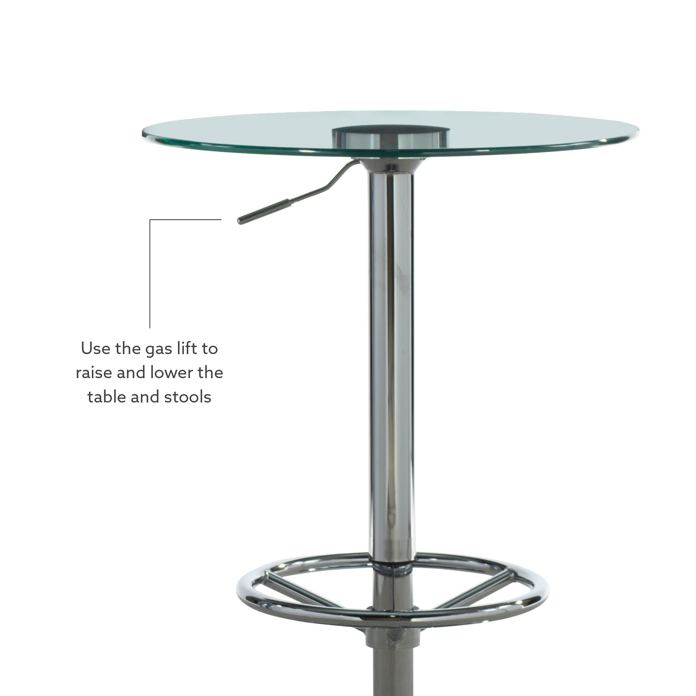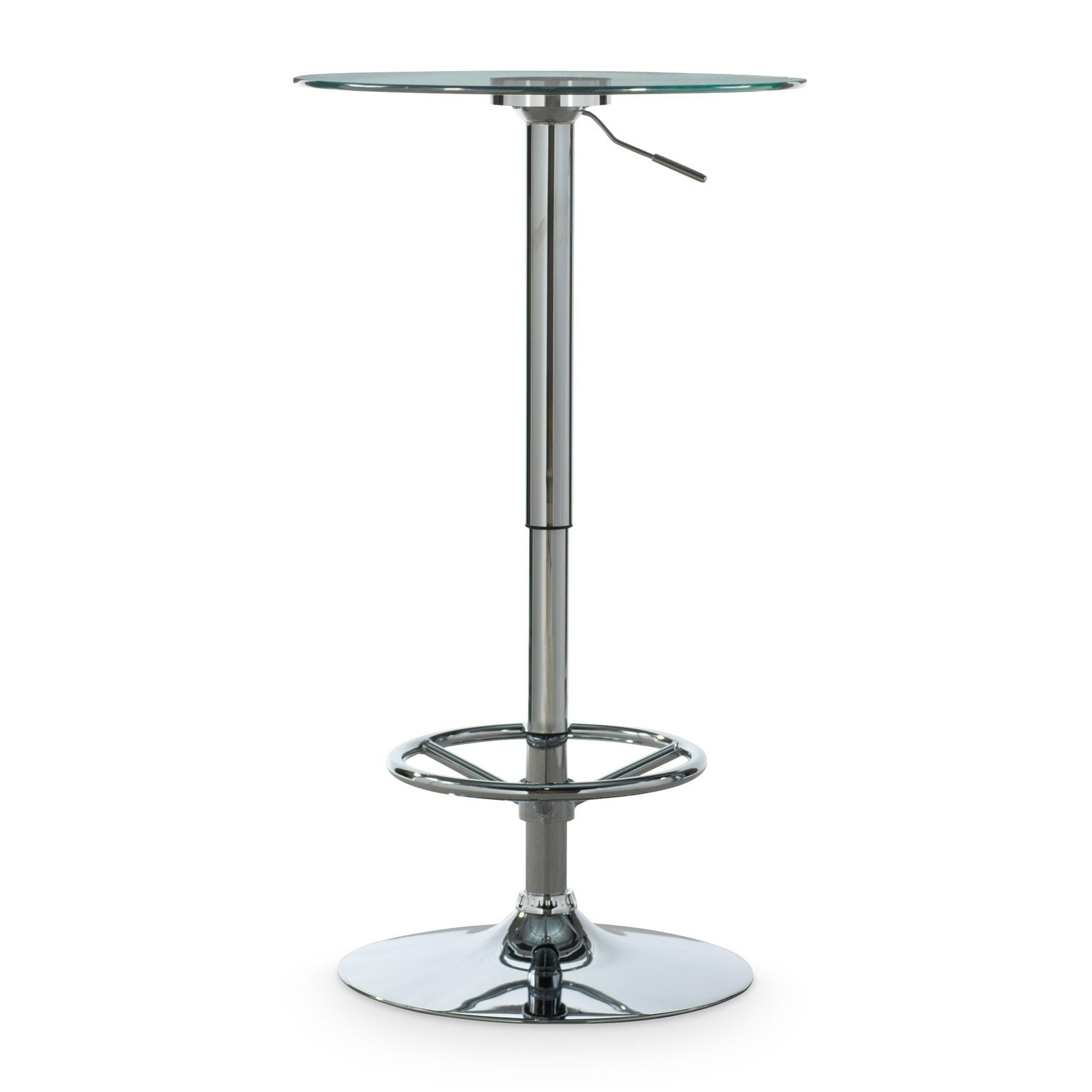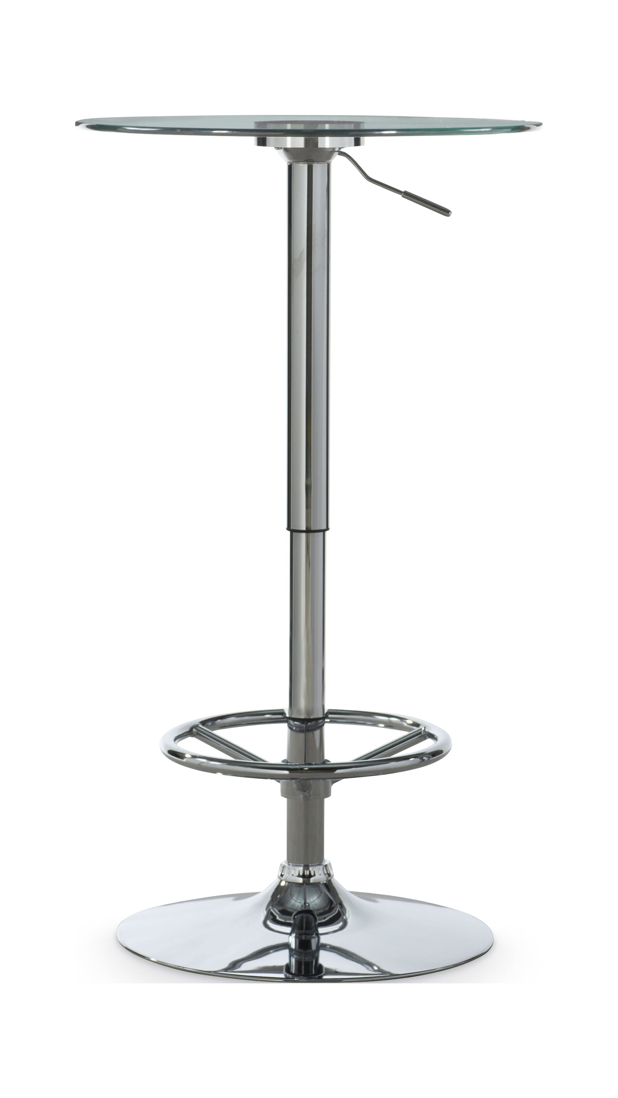 Craft a casual entertaining space in any corner of your home with this chic, modern pub table. Perfect for dressing up or down, it pairs a round glass top with a circular metal pedestal base finished in polished chrome. Designed to meet your styling needs, use the gas lift to raise and lower this accent table as it comfortably seats two. Foot rest is stationary, always in the right place. Make your next festive event even more marvelous by using this pub table as a high style beverage station, or use it to build a stylish spot for weeknight family dinners. Features: Crafted from Steel, Glass and Plastic High gloss chrome finish Tempered Glass Top Glass top is 10 mm or 0.39″ thick Table height adjust a full 9.25 inches, from 33.5″ to 42.75″ Foot rest is stationary Protective Ring on Bottom of Base to Prevent Scratching Specifications: Assembly Required: Some Assembly Required Product Dimensions: 23.63″w x 23.63″d x 33″ – 43″h Product Weight: 30.87 lbs Weight Capacity: 100 lbs