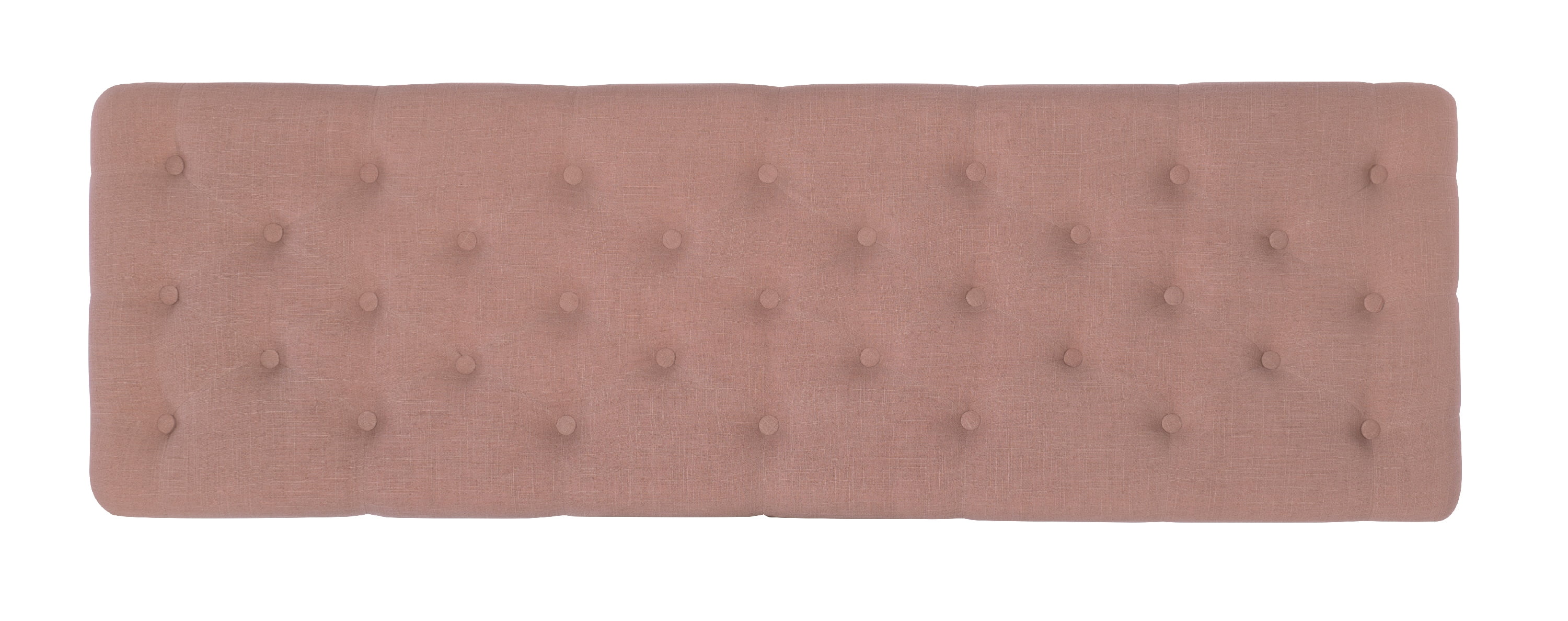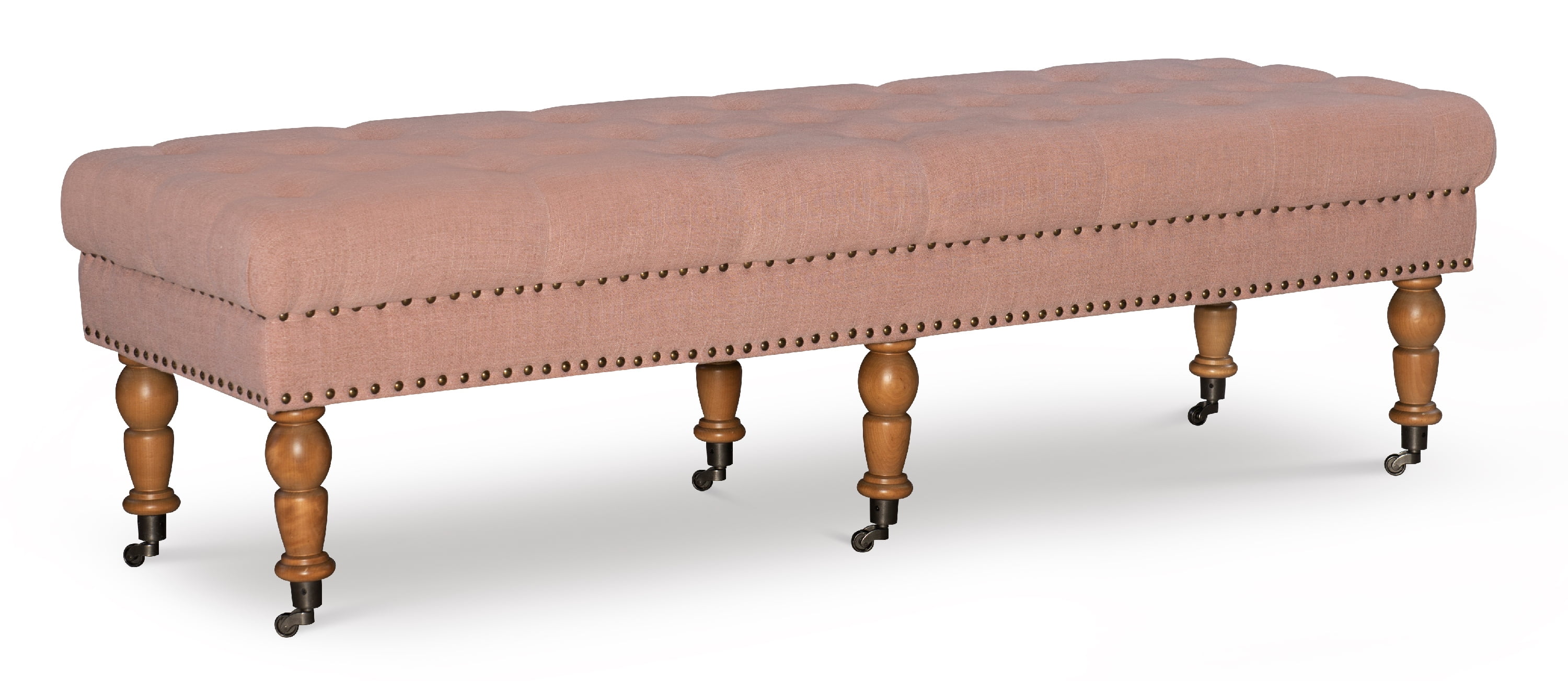 Chic, sophisticated design Burnished Bronze Nailheads Distressed Gray Legs Washed Pink Linen (45% Viscose, 55% Linen) 62″ long Seat Dimensions: 17.72″ Seat Height, 62″ wide, 16.69″ deep Weight Limit: 275 lbs Assembled Dimensions: 62″ W x 19.69″ D x 17.72″ H Ships in 1 box