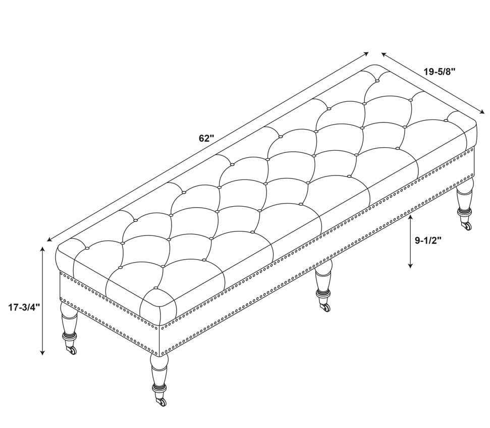 Chic, sophisticated design Burnished Bronze Nailheads Dark Espresso Finish Natural Linen; 62″ long Seat Dimensions: 17.72″ Seat Height, 62″wide, 16.69″deep Weight Limit: 275 lbs Assembled Dimensions: 62″w x 19.69″d x 17.72″h Ships in 1 box