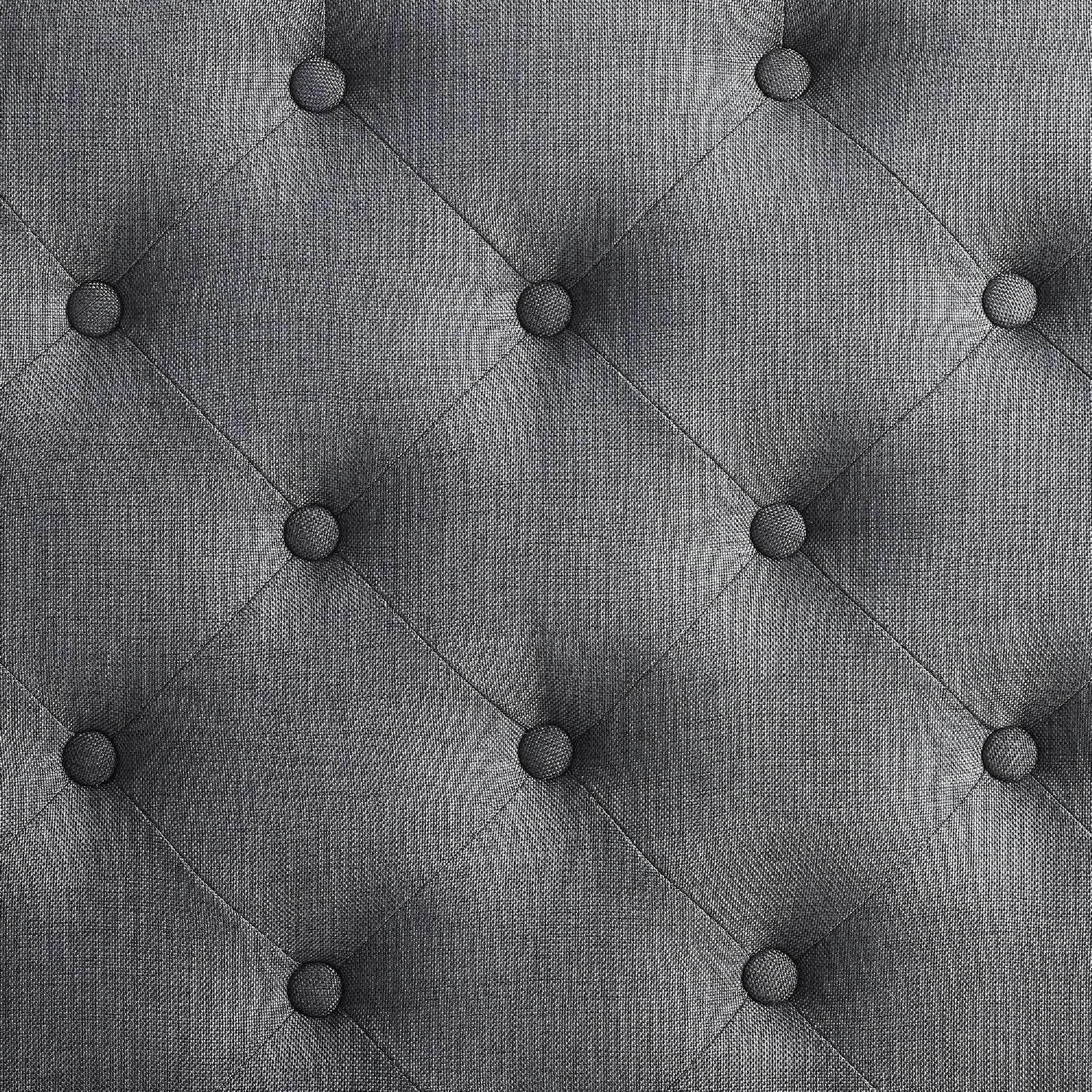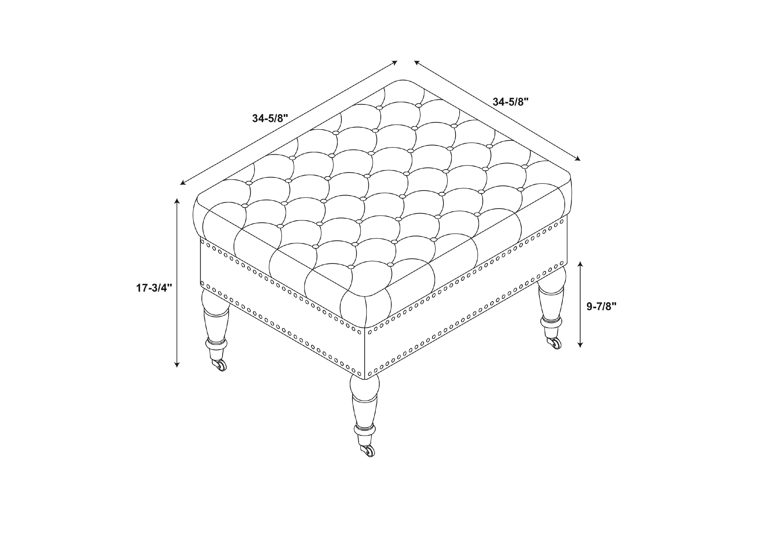 Chic, vintage, sophisticated square design Tufted Top Silver Nailheads Charcoal Linen Upholstery Black Finished Legs Seat Height: 17.72″ Weight Limit: 275 lbs. Assembled Dimensions: 34.63″ w x 34.63″ d x 17.72″ h Ships in 1 box Age Group: Adult