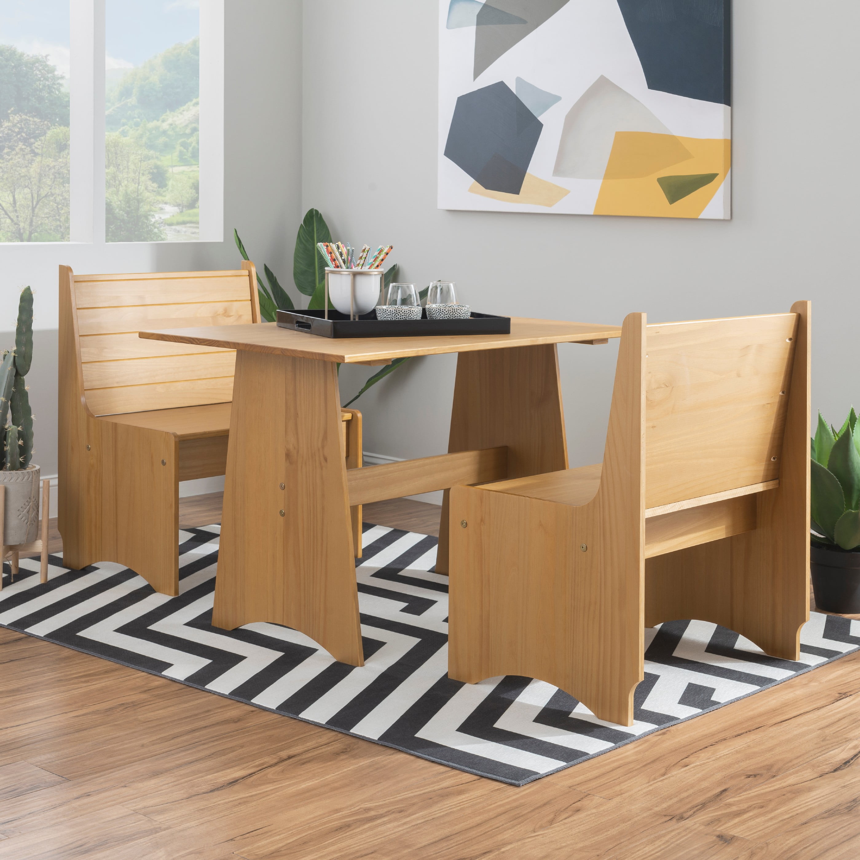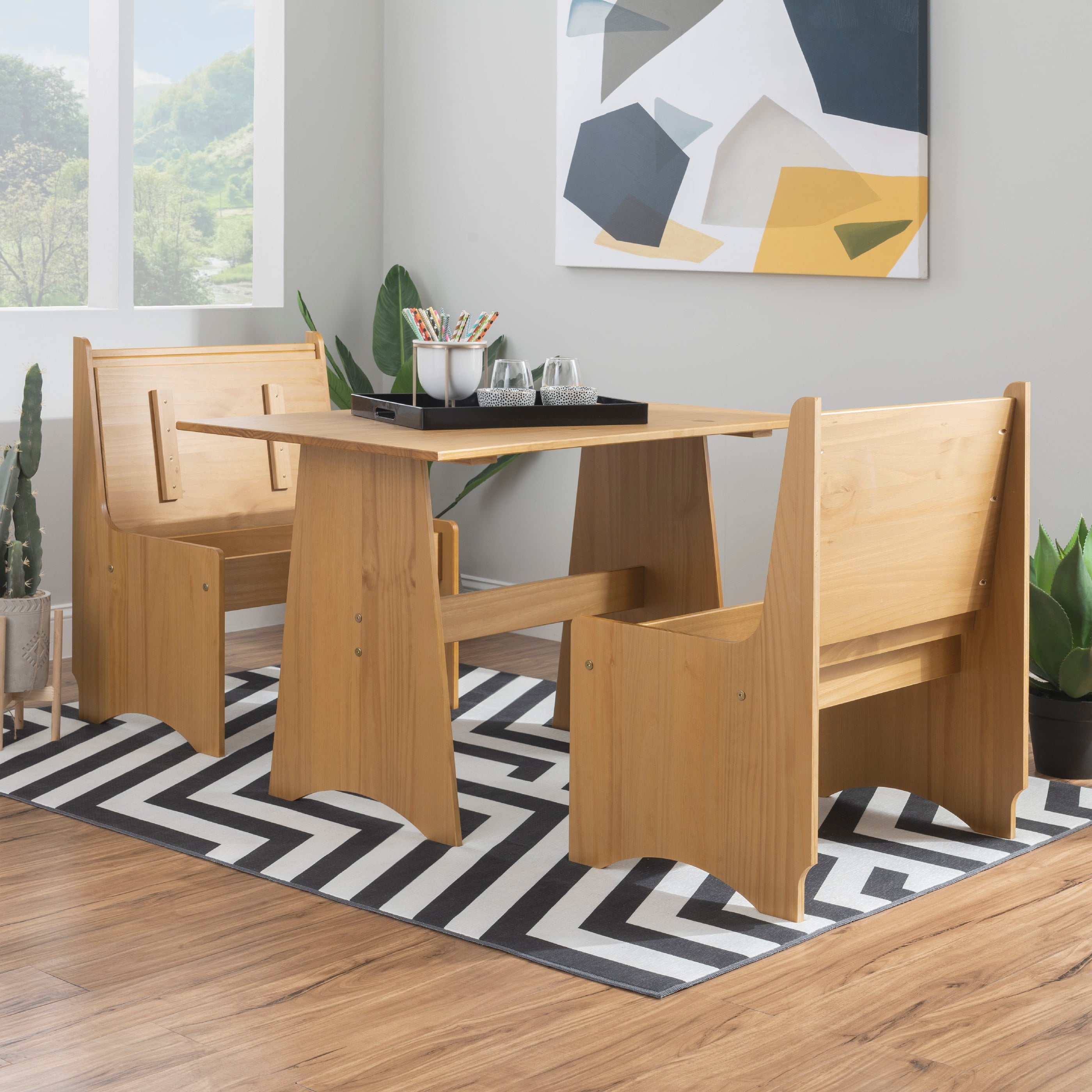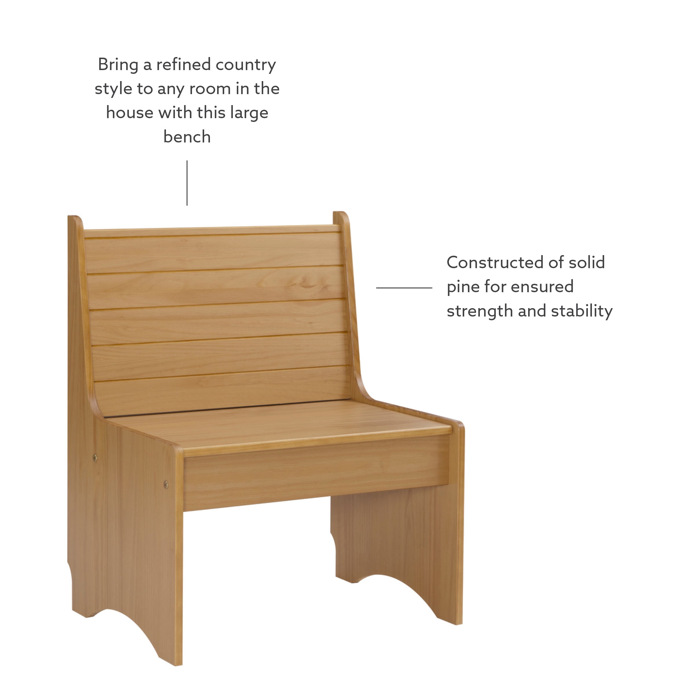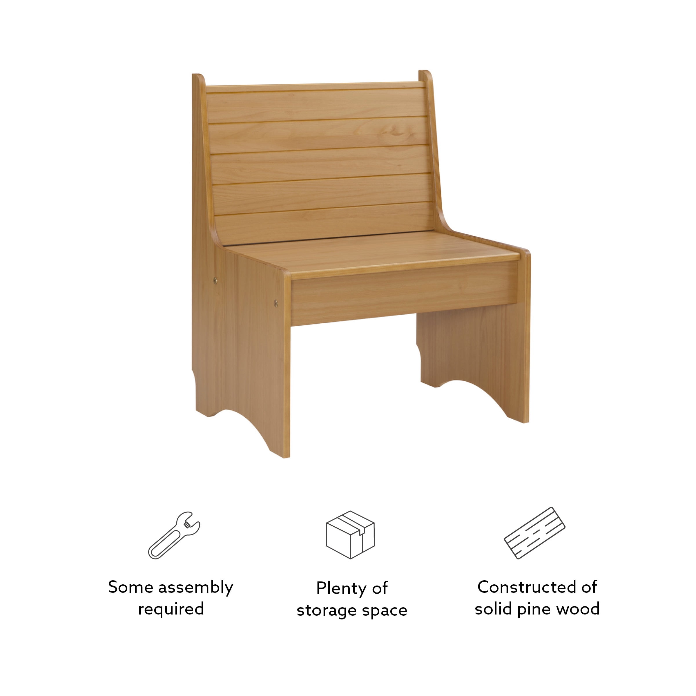 Dimensions: 27 W x 19.75 D x 33.63 H inches Available in multiple finishes Constructed Of Solid Pine For Ensured Strength And Stability Backrest Accented With Horizontal Slats Offers Comfortably Support Benchtop Flips Open To Reveal Hidden Storage Compartment Compact Design Great For Tight Spaces Natural Finish Highlights Knots And Patterns In The Woodgrain Matching Pieces Available To Make A Complete Corner Nook Set Arrives With Some Assembly Required Seat Height: 17 in. Ships in 1 box