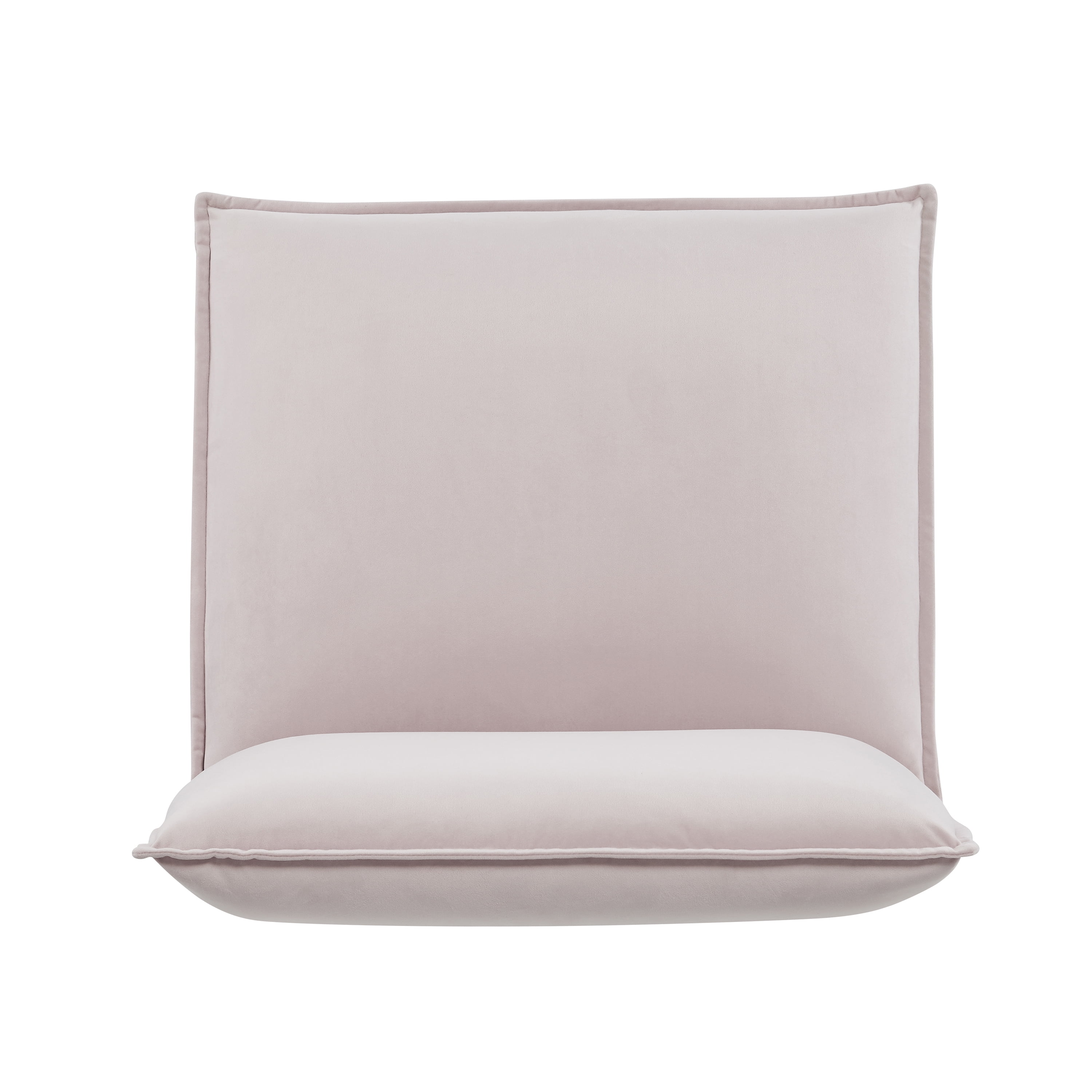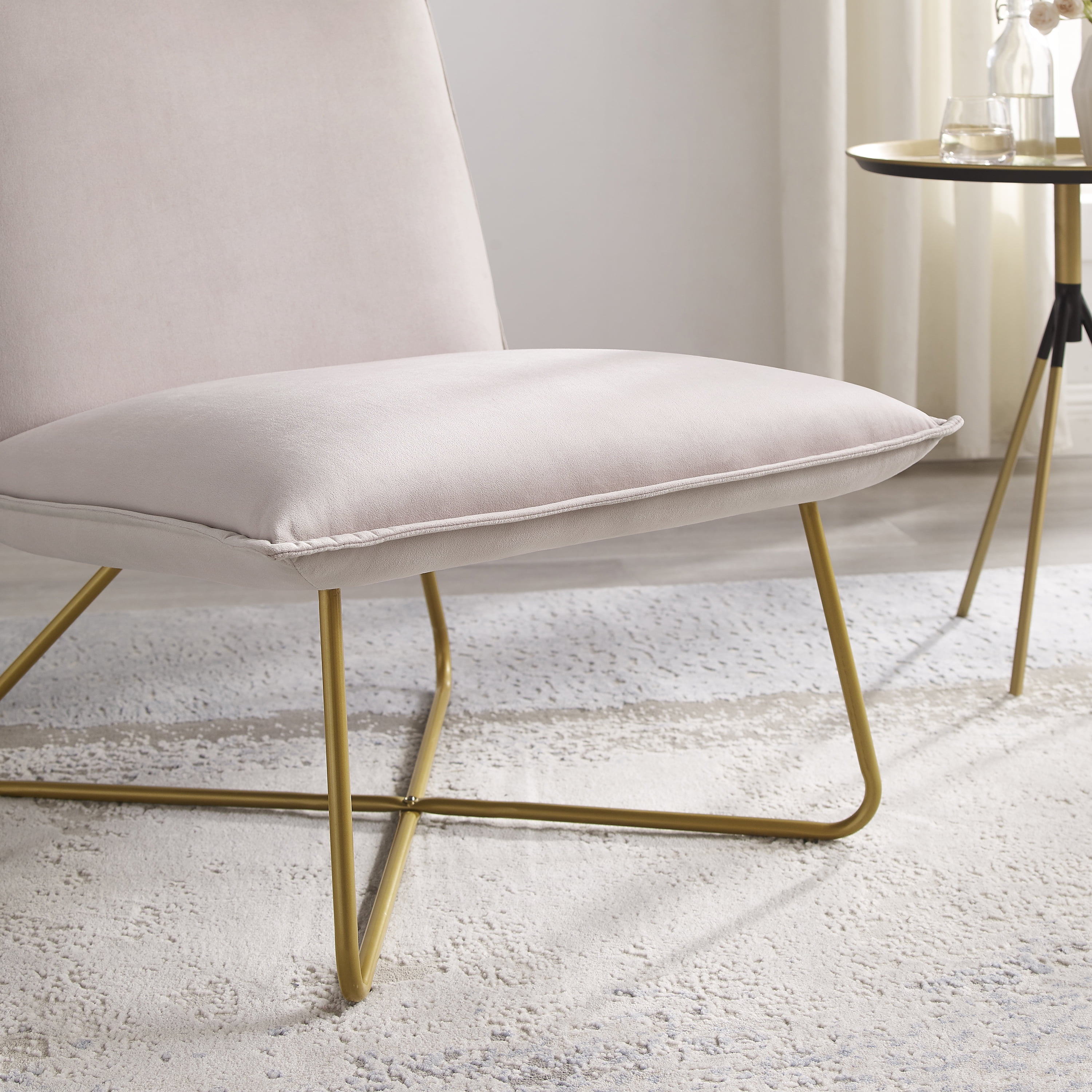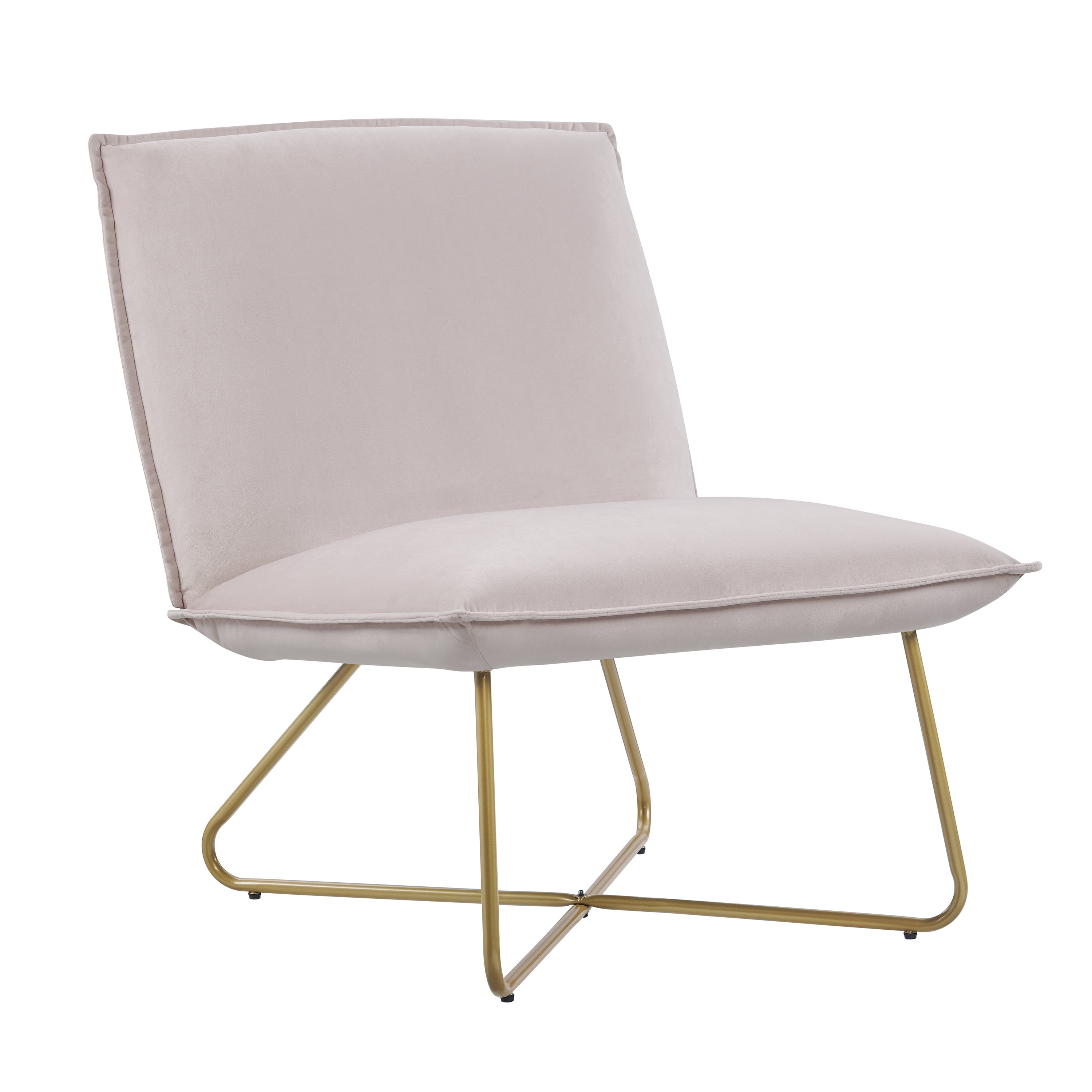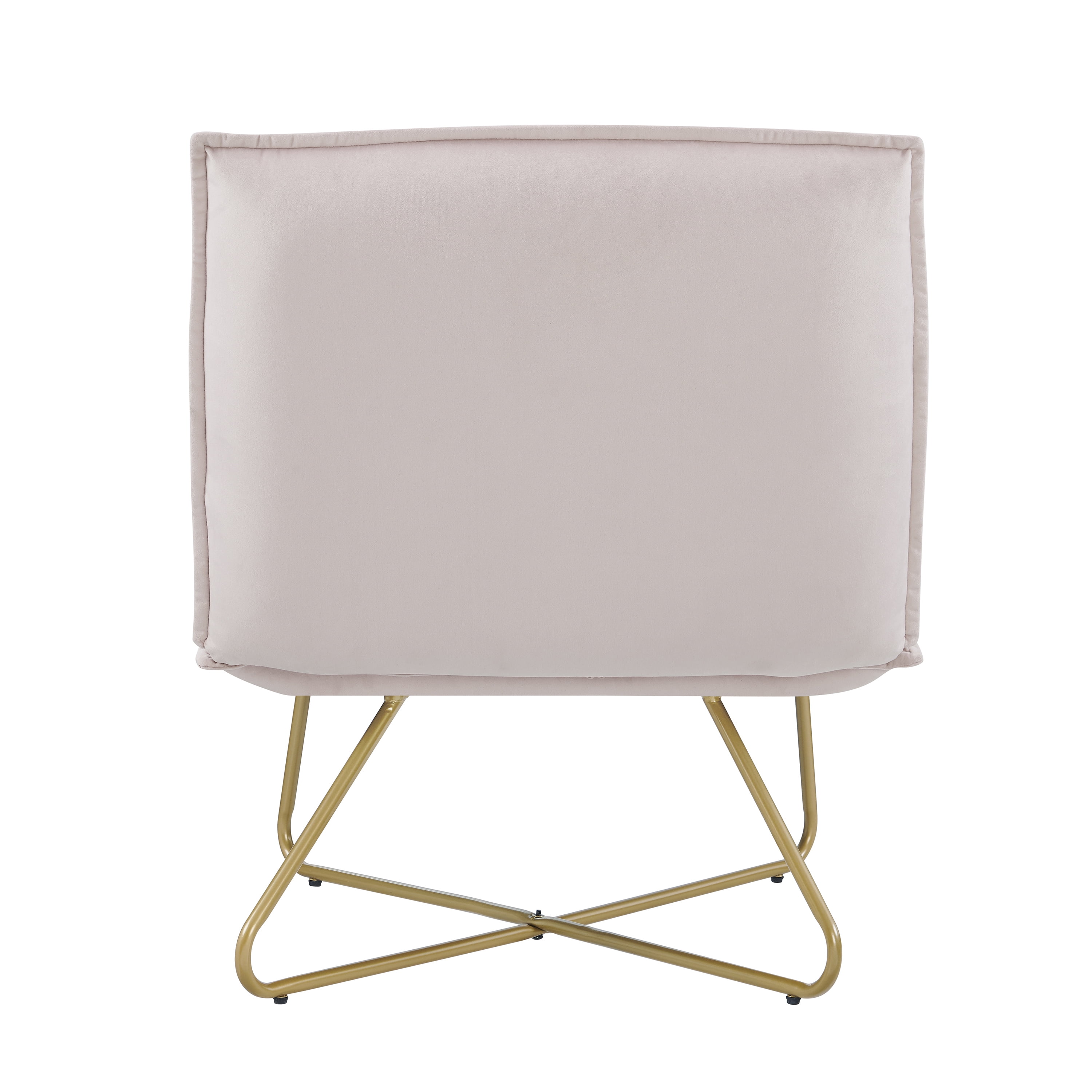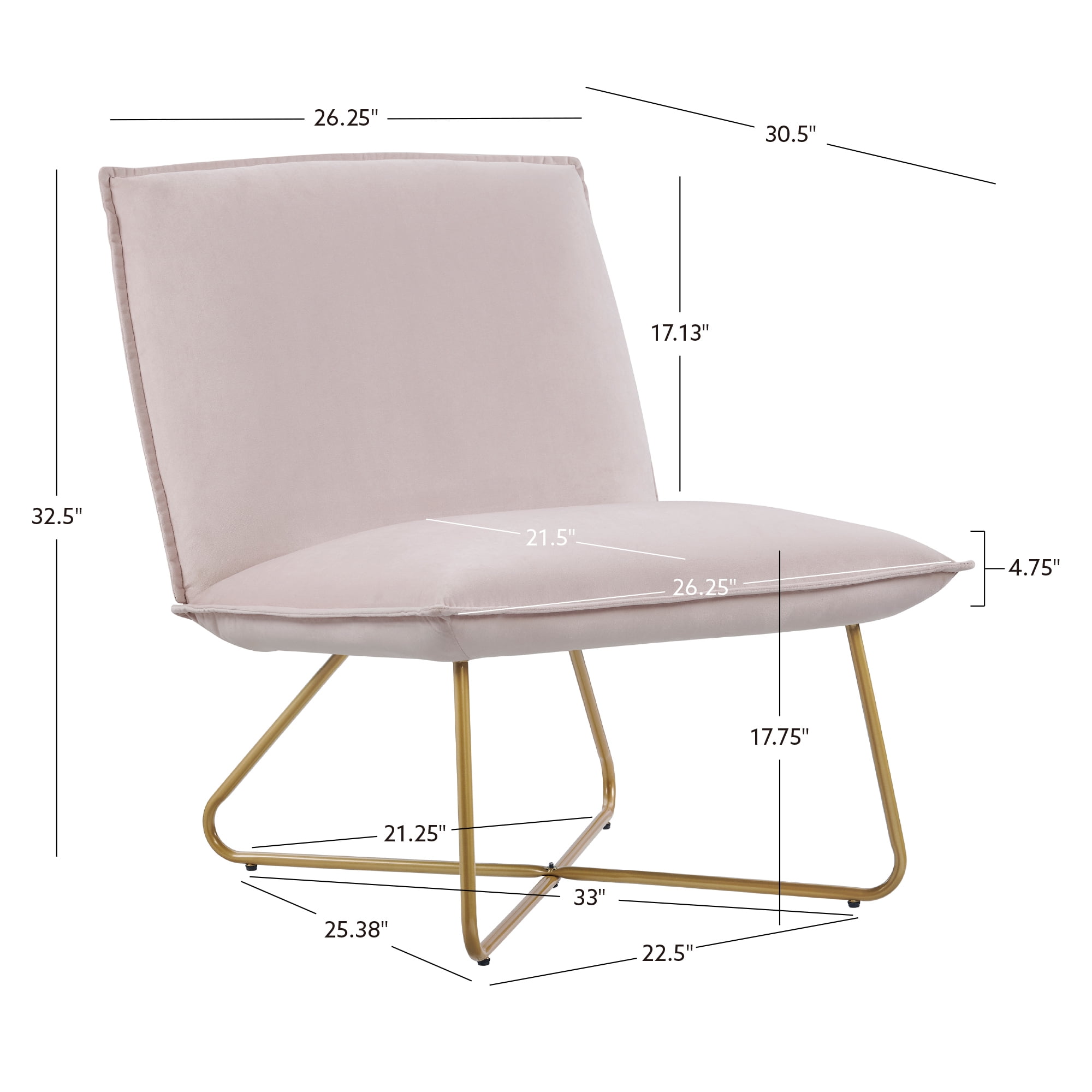 Light pink 100 percent polyester velvet fabric is cozy and easy to clean Metal legs are powder coated in gold Flanged edge upholstery style provides a big pillow look Seat floats above airy metal base Large seat is 26.5in w x 20in d Seat is 17.75in from the floor chair back is 33in tall Perfect for use in a bedroom youth bedroom or family room Legs feature floor saving pads Seat Dimensions: 26.25”w x 20“d Assembled Dimensions: 26.5 L X 30 D X 33 H Assembly Required Weight Capacity: 275 Lbs Ships in 1 box