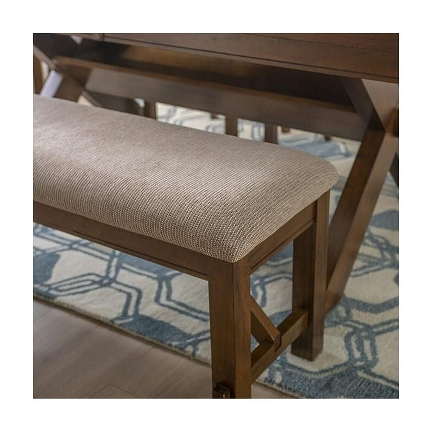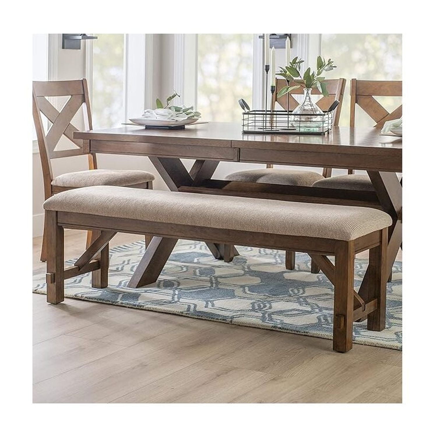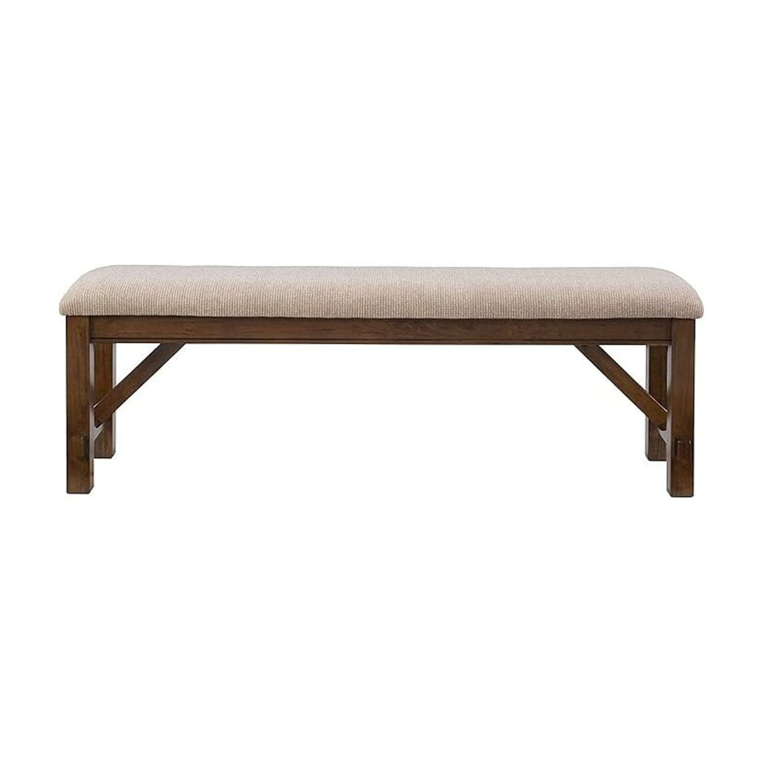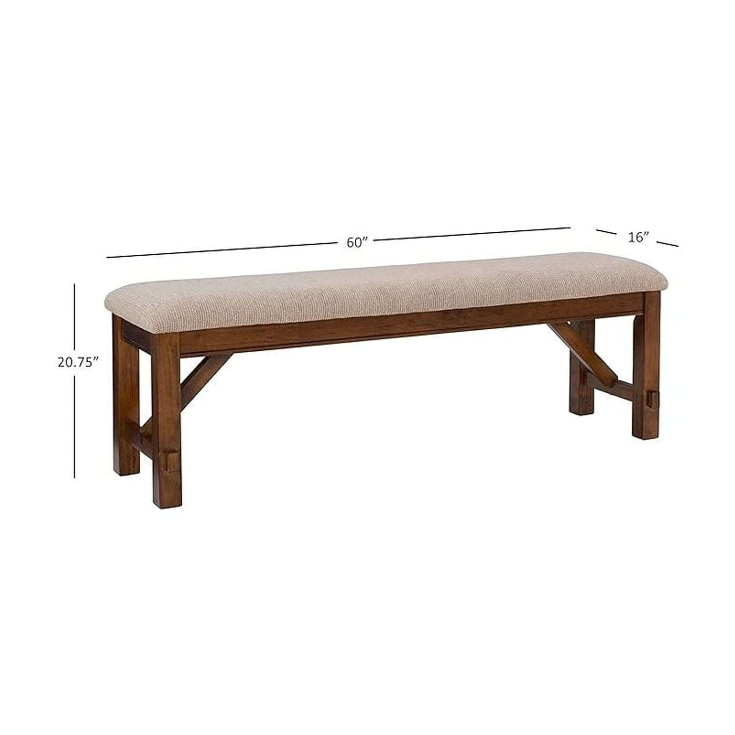 This acacia bench is a great addition to the Kraven dining table. Featuring thick, sturdy, straight legs and a plush 100% polyester upholstered tan seats, the frame is finished in a dark hazelnut. Some assembly required. Features: Crafted from 60% Rubberwood, 20% MDF, 15% Cushion and 5% Hardware Dark Hazelnut Finish Tan 100% Polyester Upholstery Thick, sturdy, straight legs A great addition to the Kraven Dining Table Dining Height Some assembly required Leg Height: 14.75″ Specifications: Assembly Required: Some Assembly Required Product Dimensions: 60″w x 16.5″d x 20.75″h Product Weight: 33.58 lbs Seat Height: 20″ Weight Capacity: 400 lbs Seat Dimensions: 60″ x 16″ x 6.69″