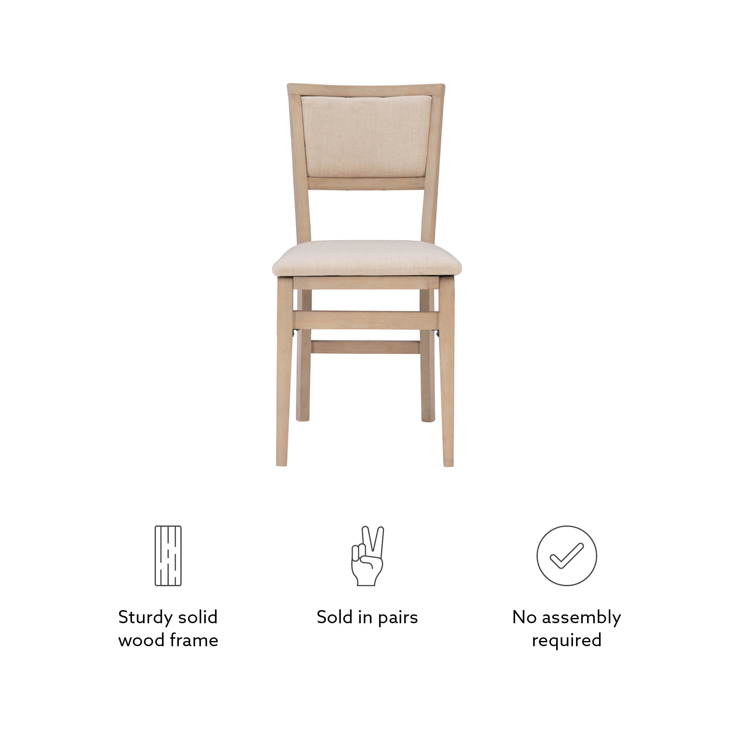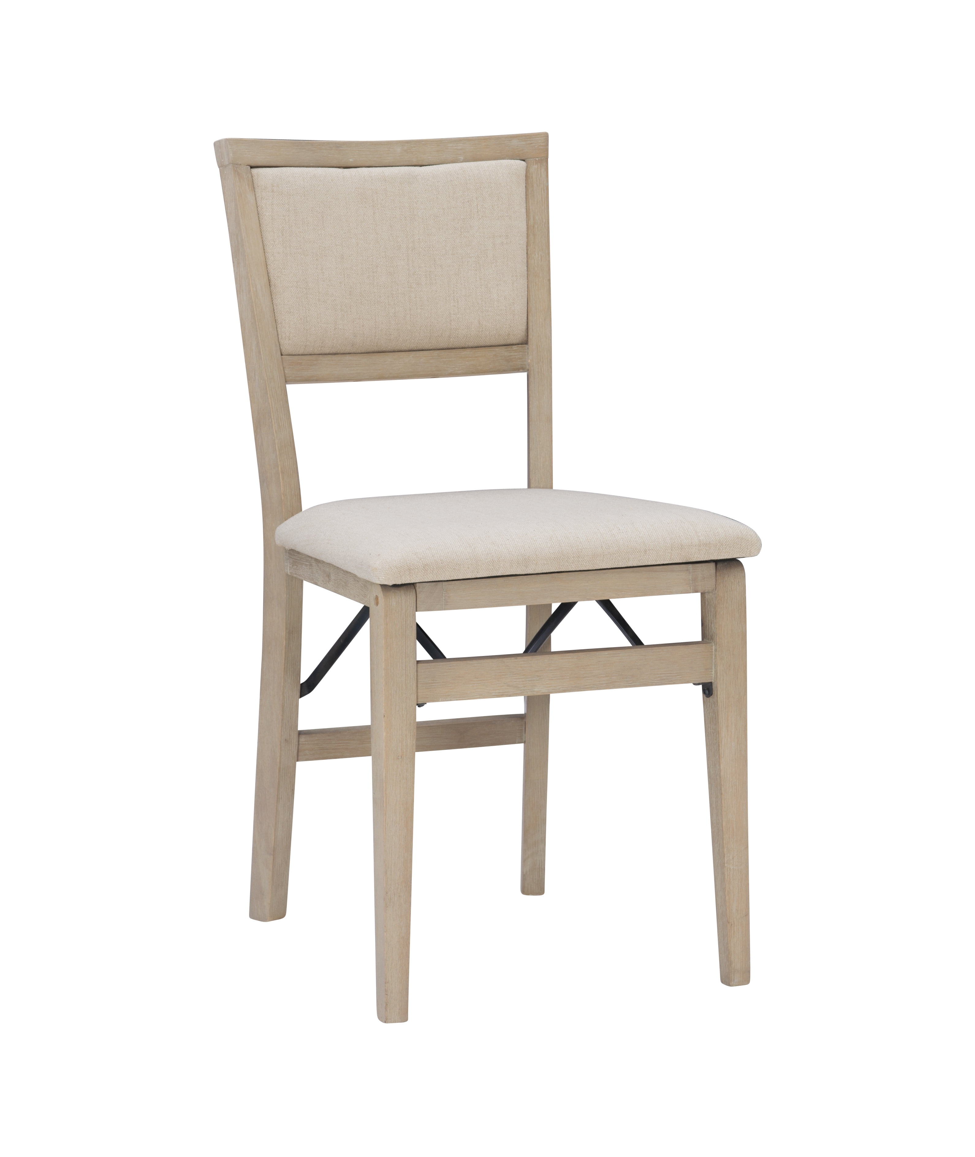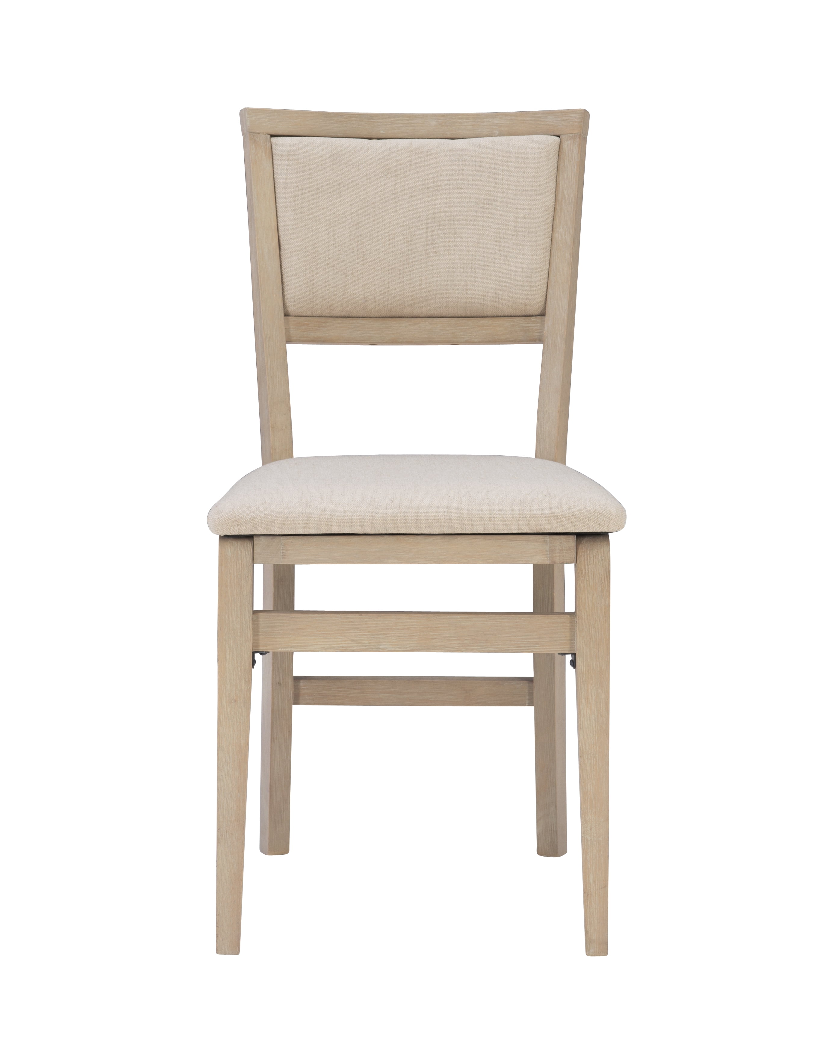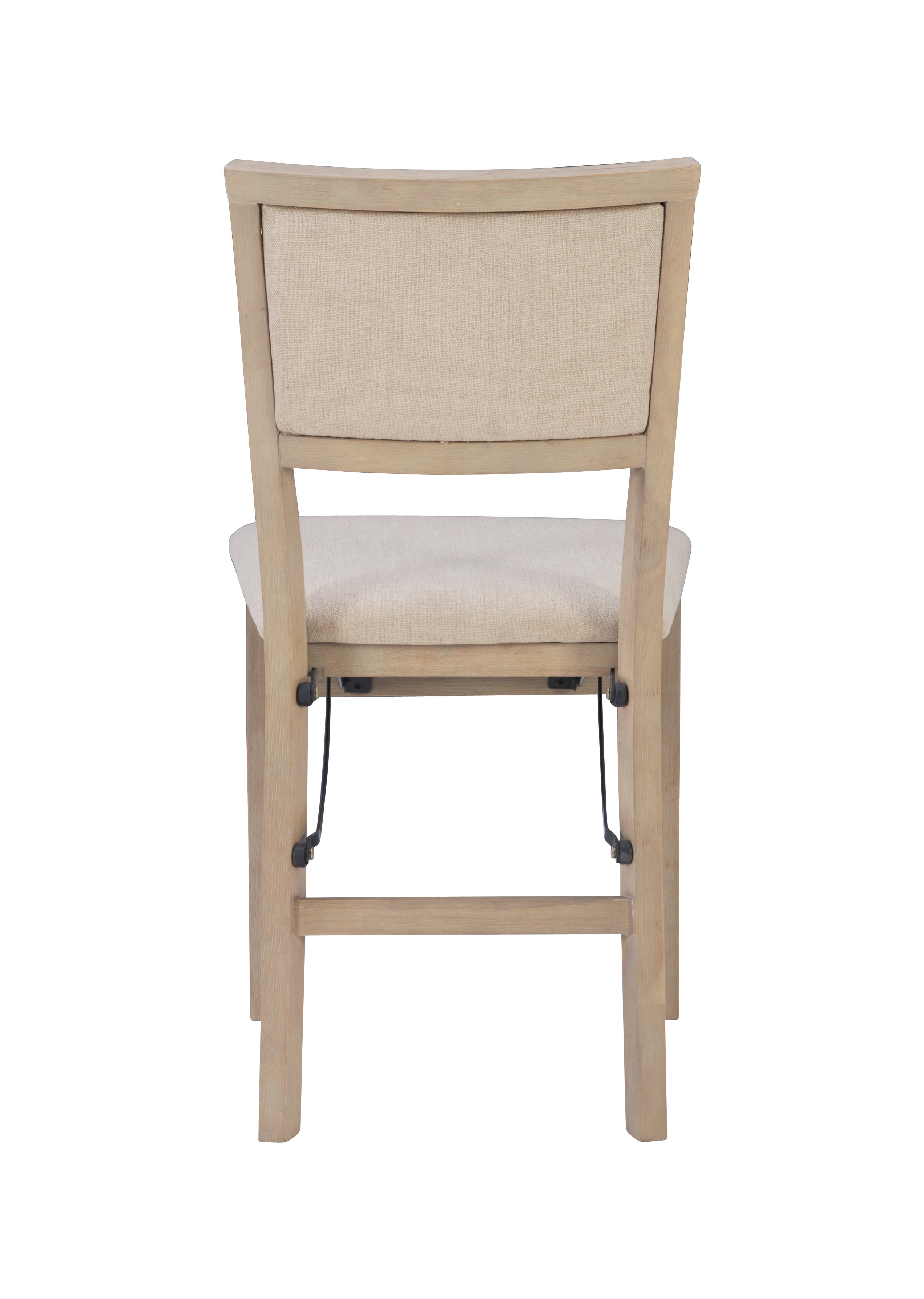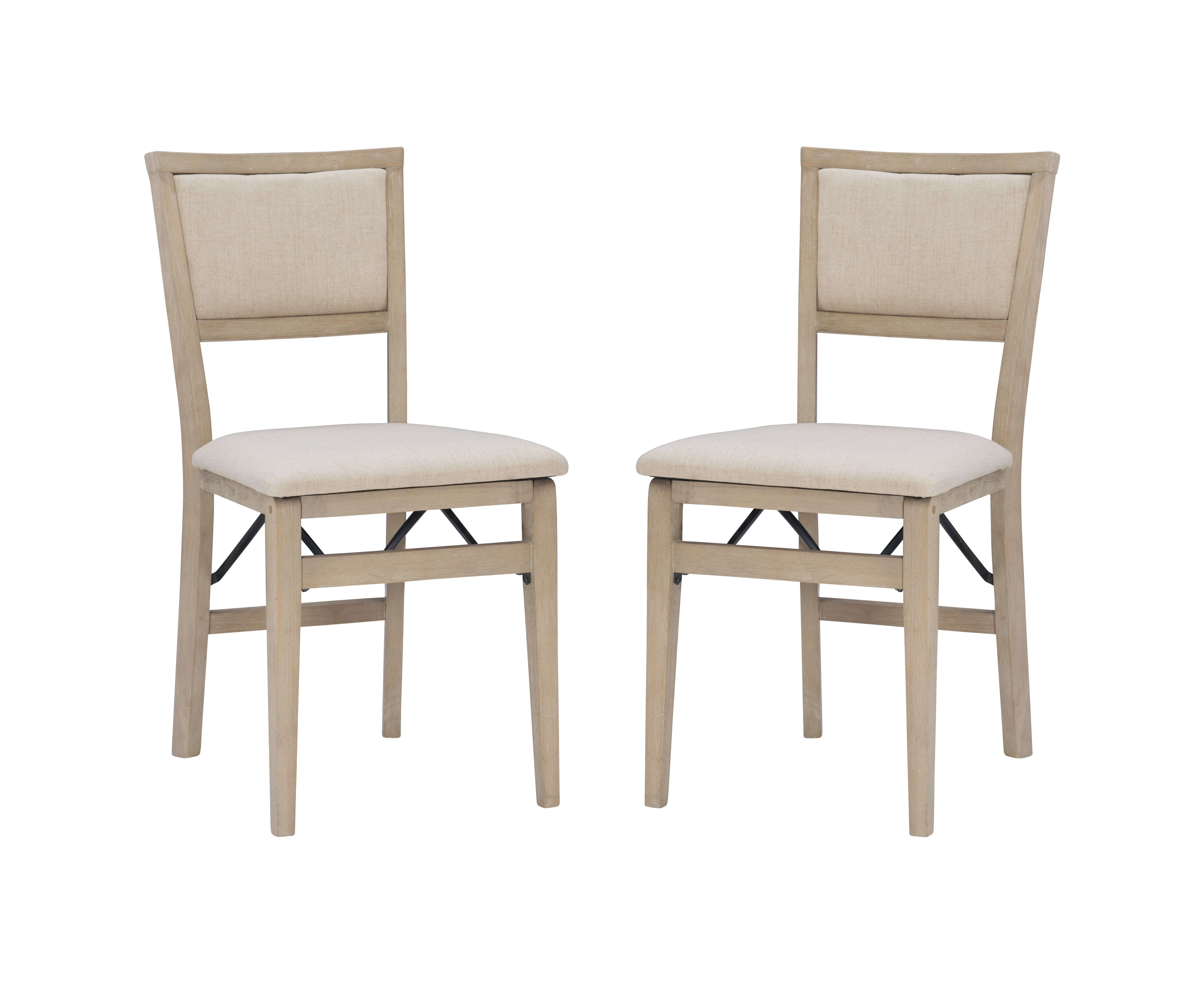 Folding chairs have never looked so stylish. But the good looks of these chairs are only the beginning. The classic design in a natural rustic finish has a comfortably padded seat and back, both covered in a neutral beige easy to clean fabric. This pair of folding chairs is the perfect extra seating alternative for game nights, holidays and unexpected company. Constructed with solid wood and a sturdy steel folding mechanism, these folding chairs come fully assembled making them a breeze to setup and store.