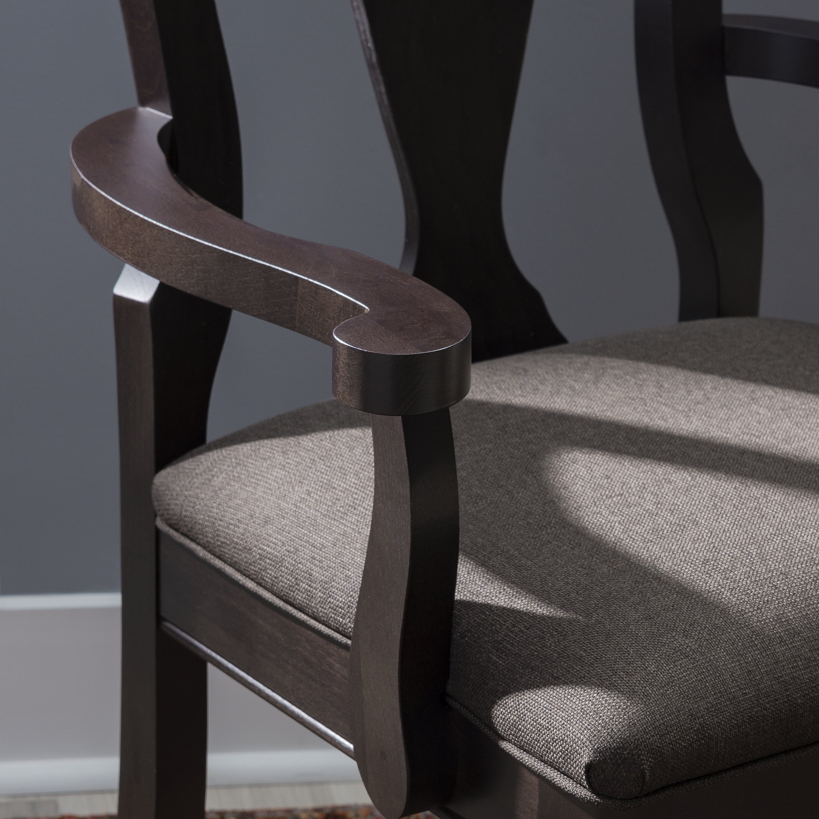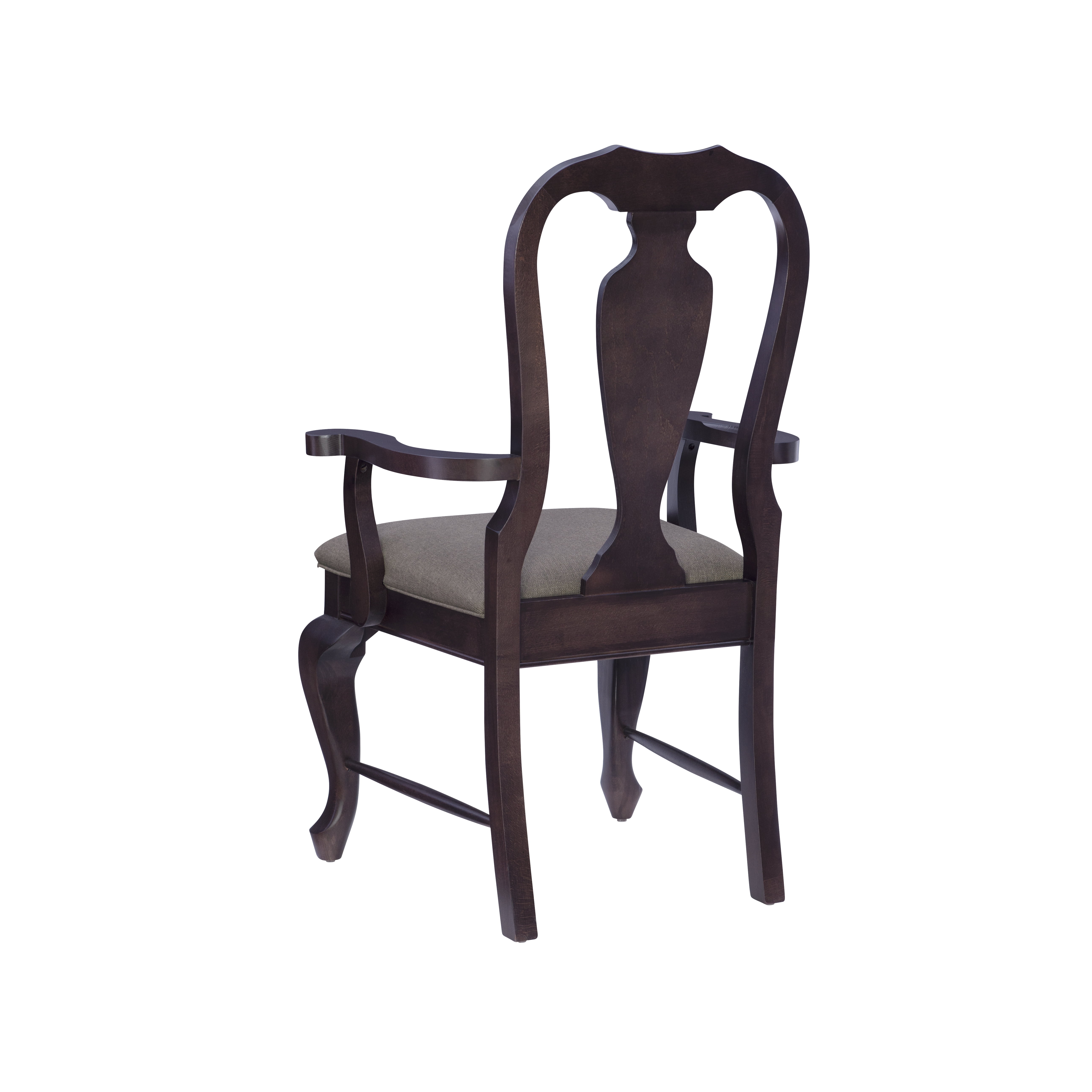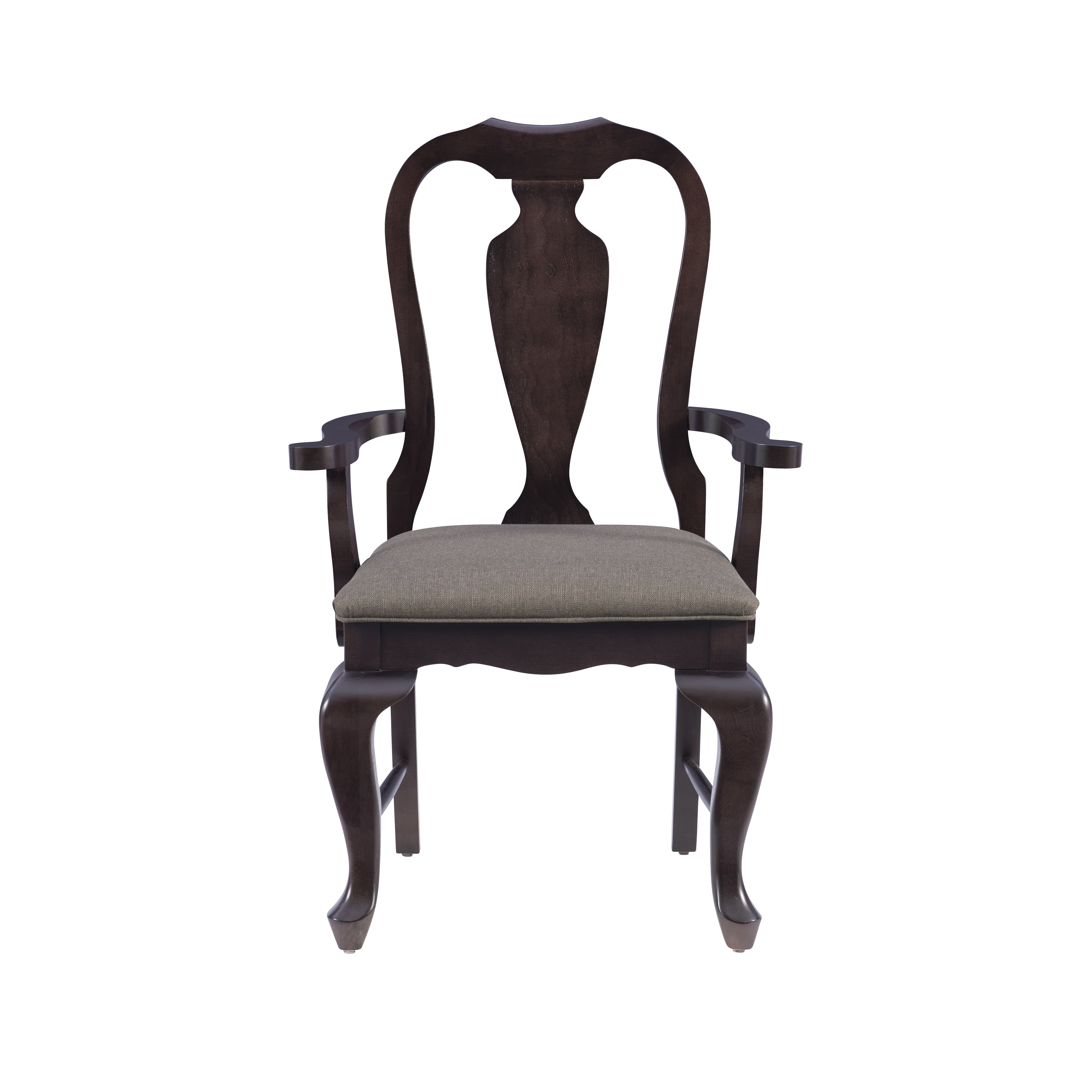 Linon Kuras Accent Armchair, Brown Solid beechwood construction provides stability and durability Charcoal linen look polyester upholstery fitted over plush cushion offers easy cleaning and enhanced comfort Dark brown finish fits seamlessly in a variety of settings Ornate splat back design and turned legs offer a traditional aesthetic 18in seat height is perfect match with most dining tables a Comes outfitted with foot glides to protect your floors Supports up to 300 lbs each seat Assembled Dimensions: 25.375″ L x 21″ D x 40.375″ H Ships in 1 box