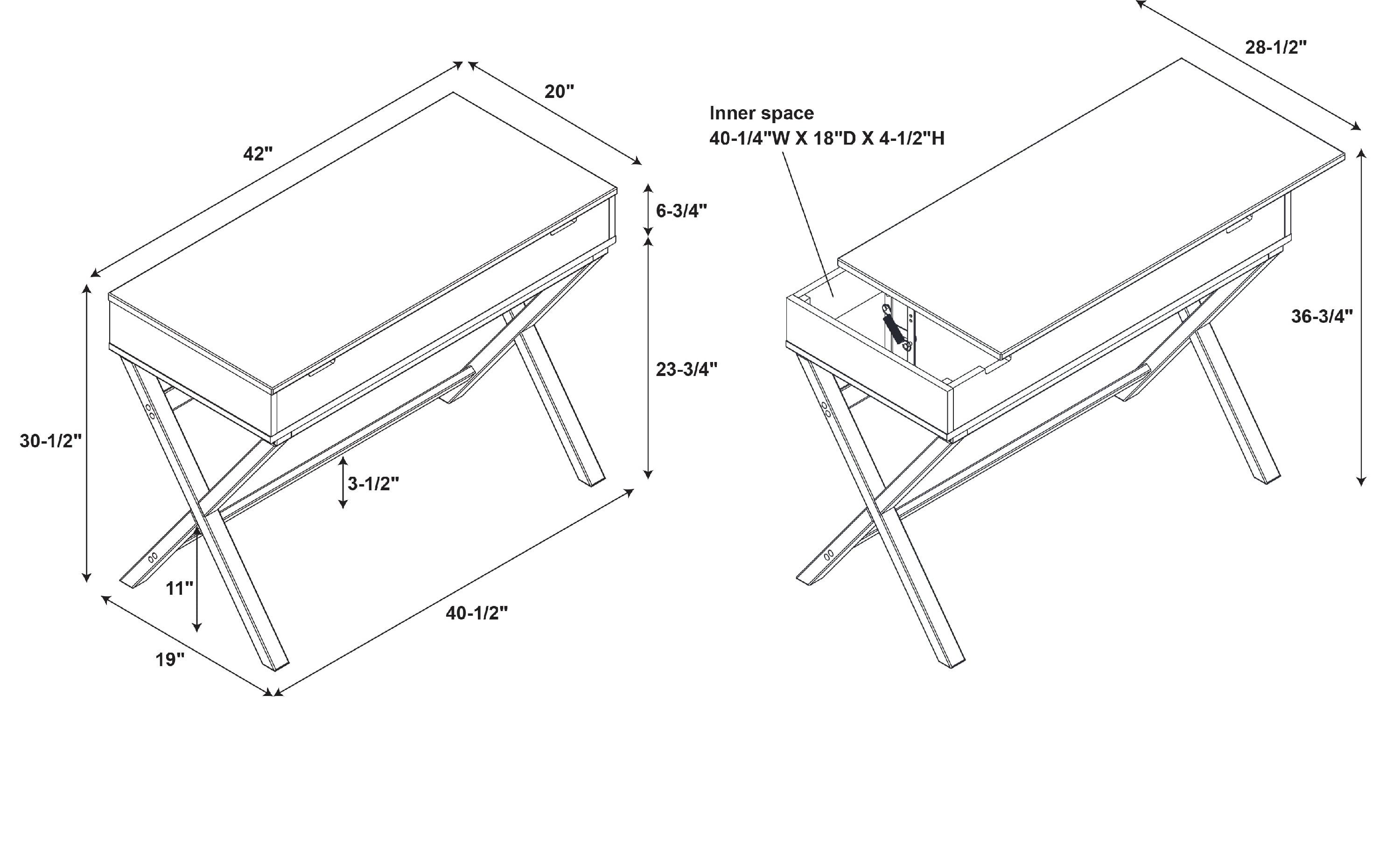 Painted Black Finish Plenty of workspace on top while the lift-top provides extra storage space Simple assembly required The unique lift-top design keeps office supplies organized Painted finish Weight Limit: 200 lbs Assembled Dimensions: 42″ W x 20″ D x 30.25″ H Ships in 1 box