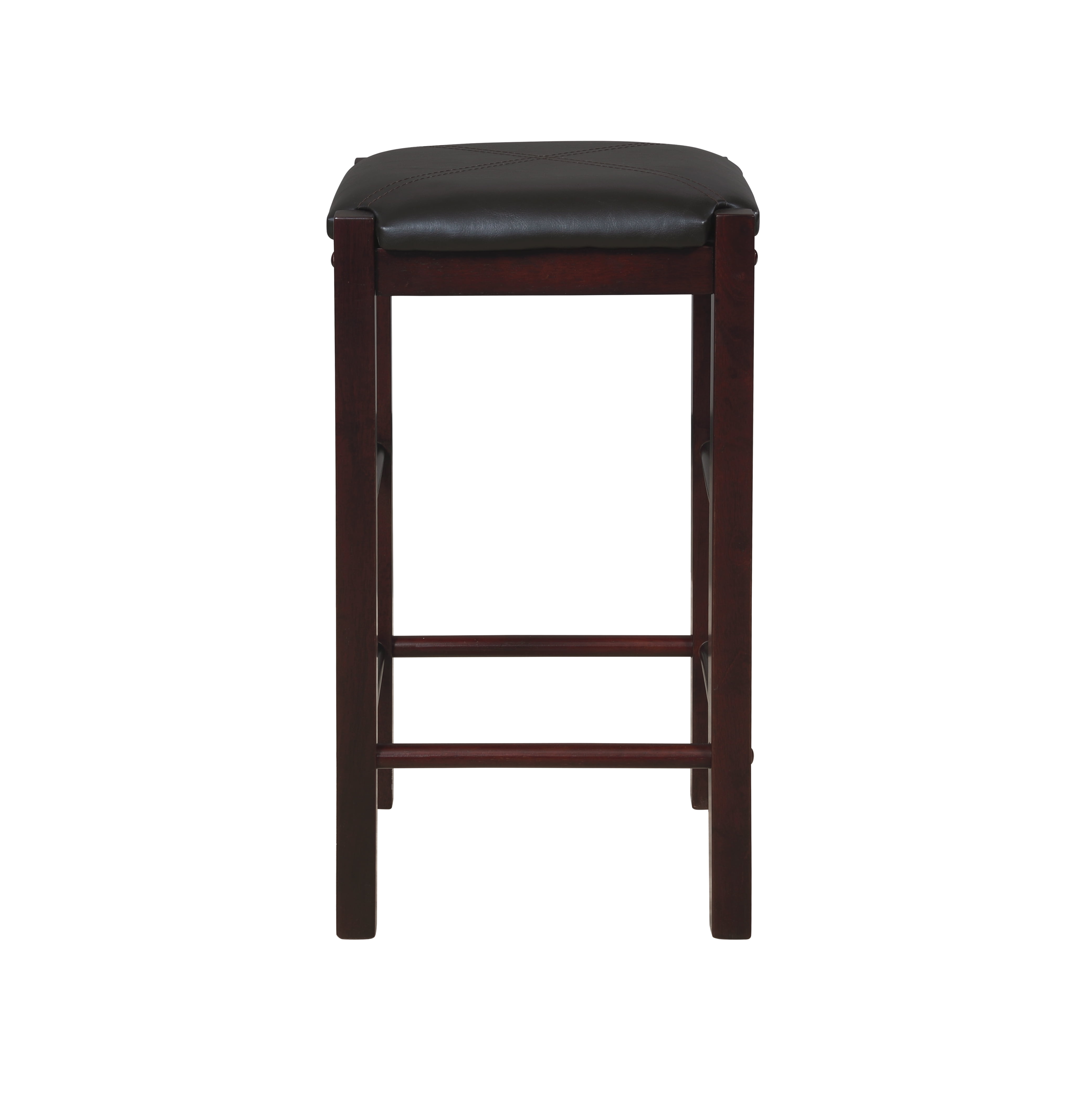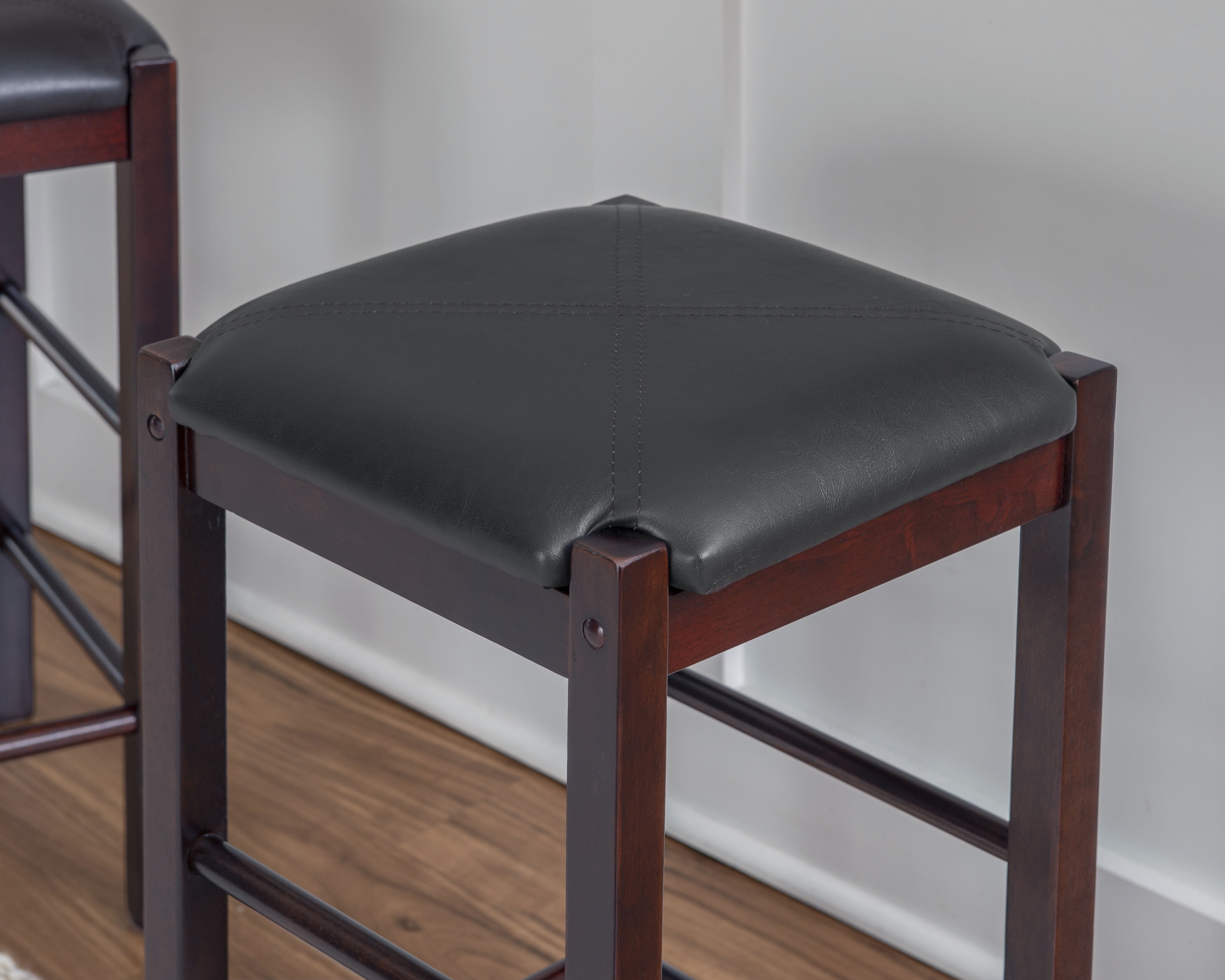 Padded Black faux leather seat Two stools included with purchase Add seating to popular 3 pc Tavern Sets Seat height is 25″; allow 8 to 12 inches for leg room under counter Multi step black finish process applied to solid wood base and legs Seat Dimensions: 13.75″w x 13.75″d Weight tested to 275 lbs Assembly Required Assembled Size: 13.75″w x 13.75″d x 24.5″h Ships in one box