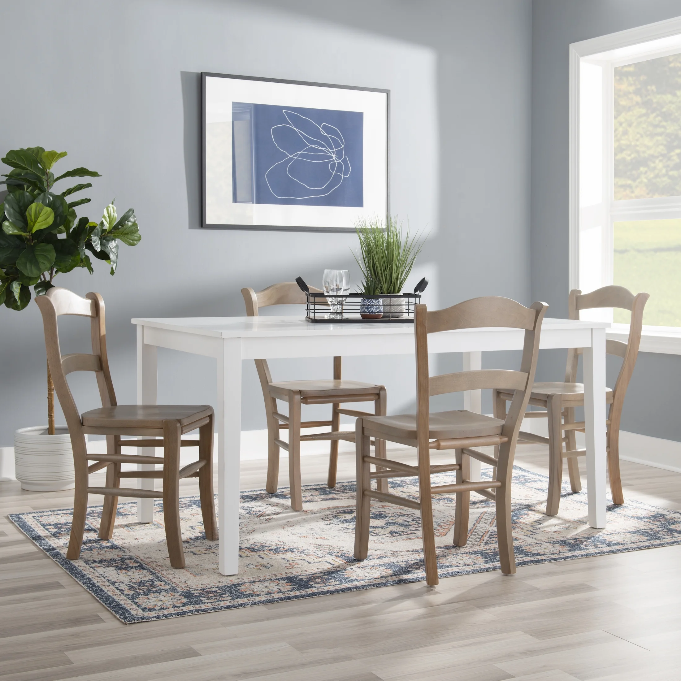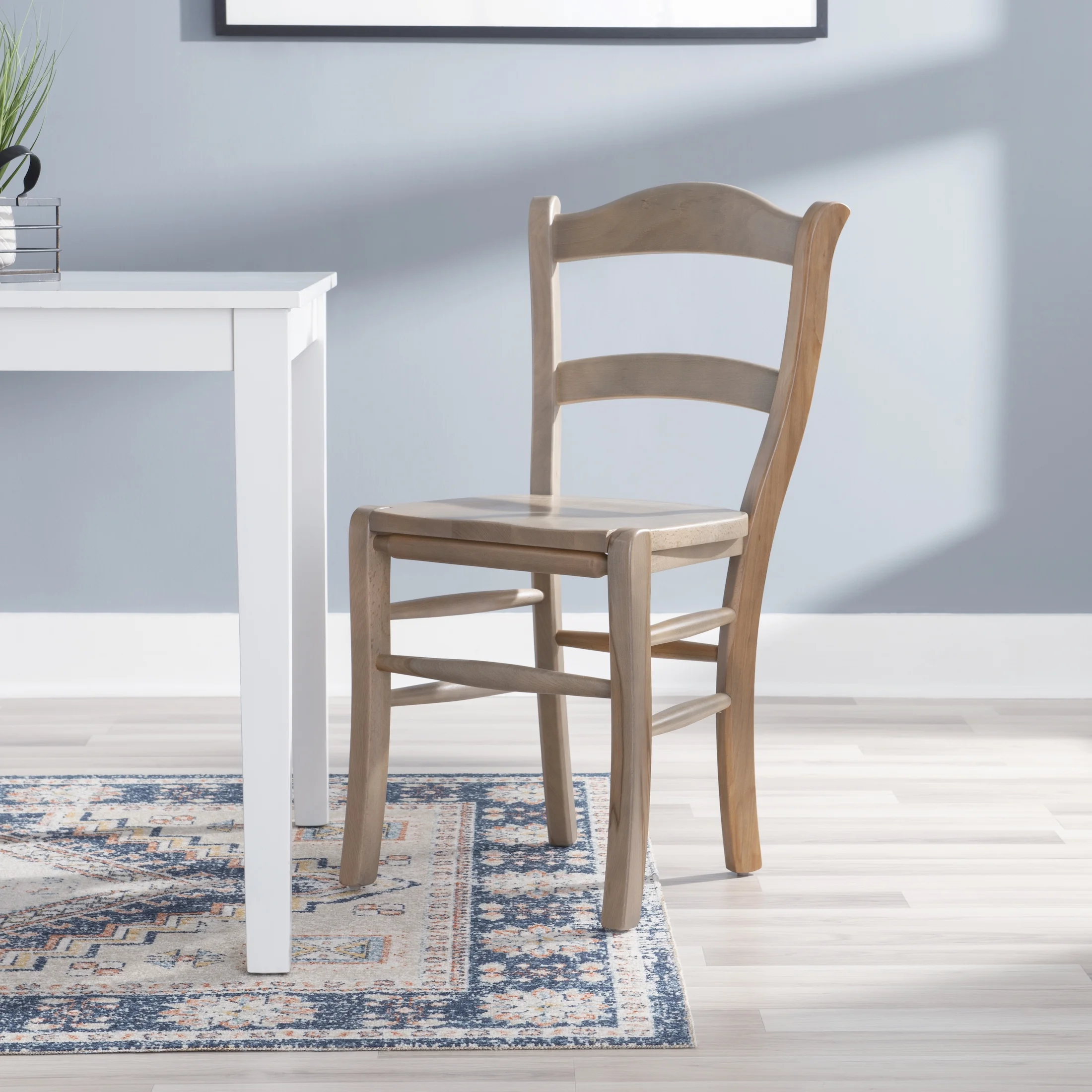 Arrives in a set of 2 Solid beechwood construction provides stability and durability Classic ladder back design lends itself to a modern farmhouse aesthetic Glowing natural finish pairs seamlessly in a variety of decor settings 18.5in seat height is perfect for tables 28in to 31in high Pre catalyzed glossy coating provides long lasting protection and shine Arrives fully assembled Assembled Dimensions: 18.75″ L x 19.50″ D x 34.75″ H Weight Capacity: 300 lbs. Ships in 1 box