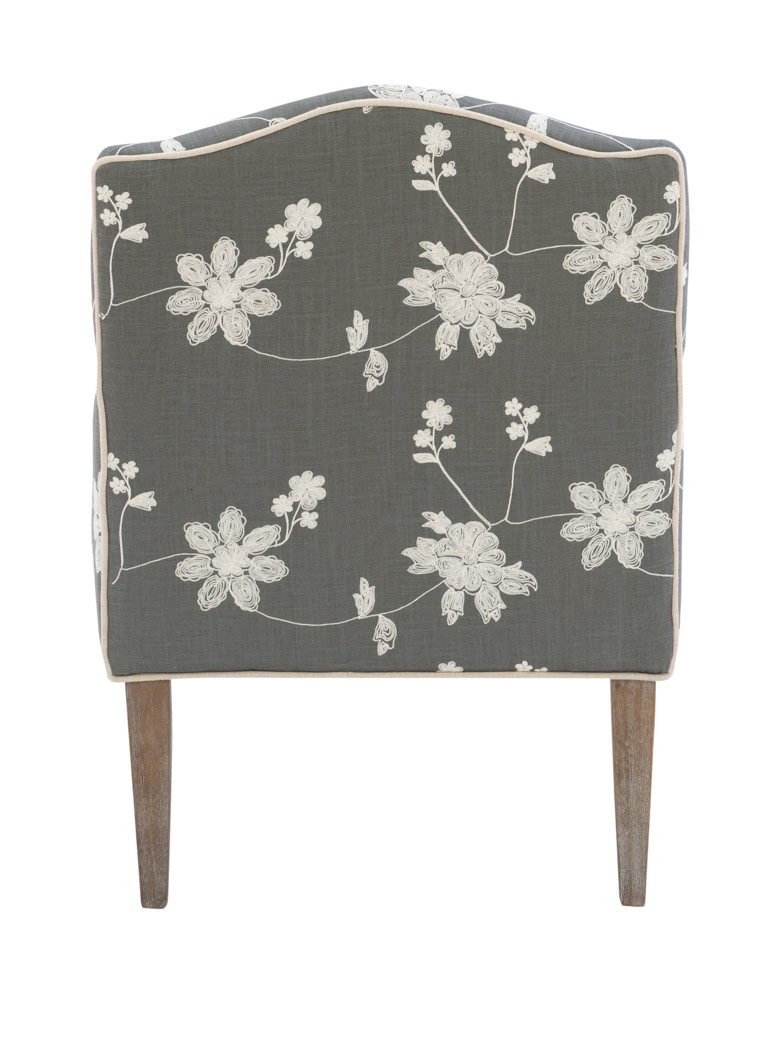 Crafted from Plywood, Rubberwood, Fabric and Foam Gray Wash Finish Gray Embroidered Linen Upholstery (70% Viscose, 30% Linen) Feminine style and charming design Includes matching pillow Seat Width Within Chair Arms: 21″, Seat Depth: 22.75″, Seat Height: 18″ Curvy Gray Wash Finished Legs