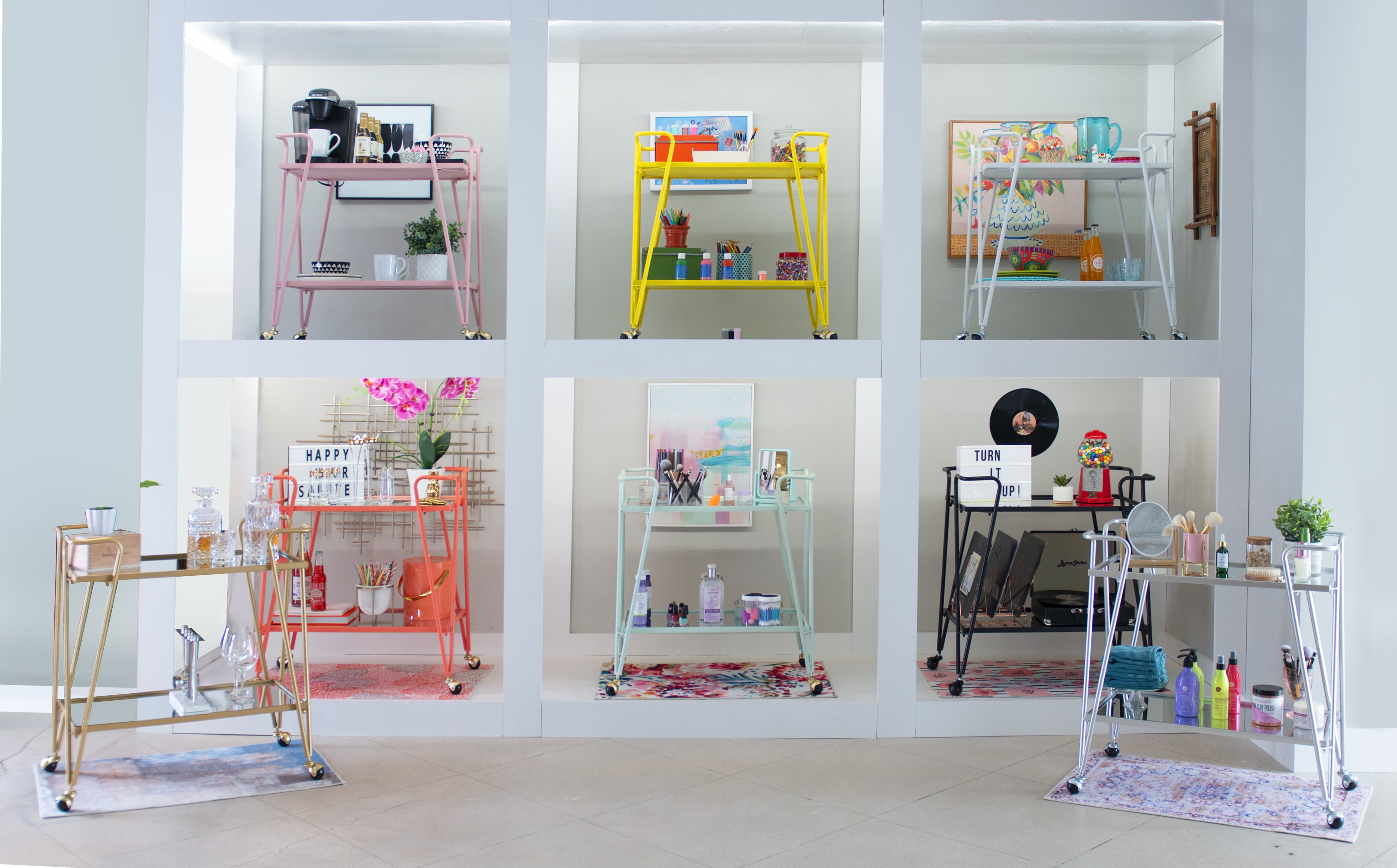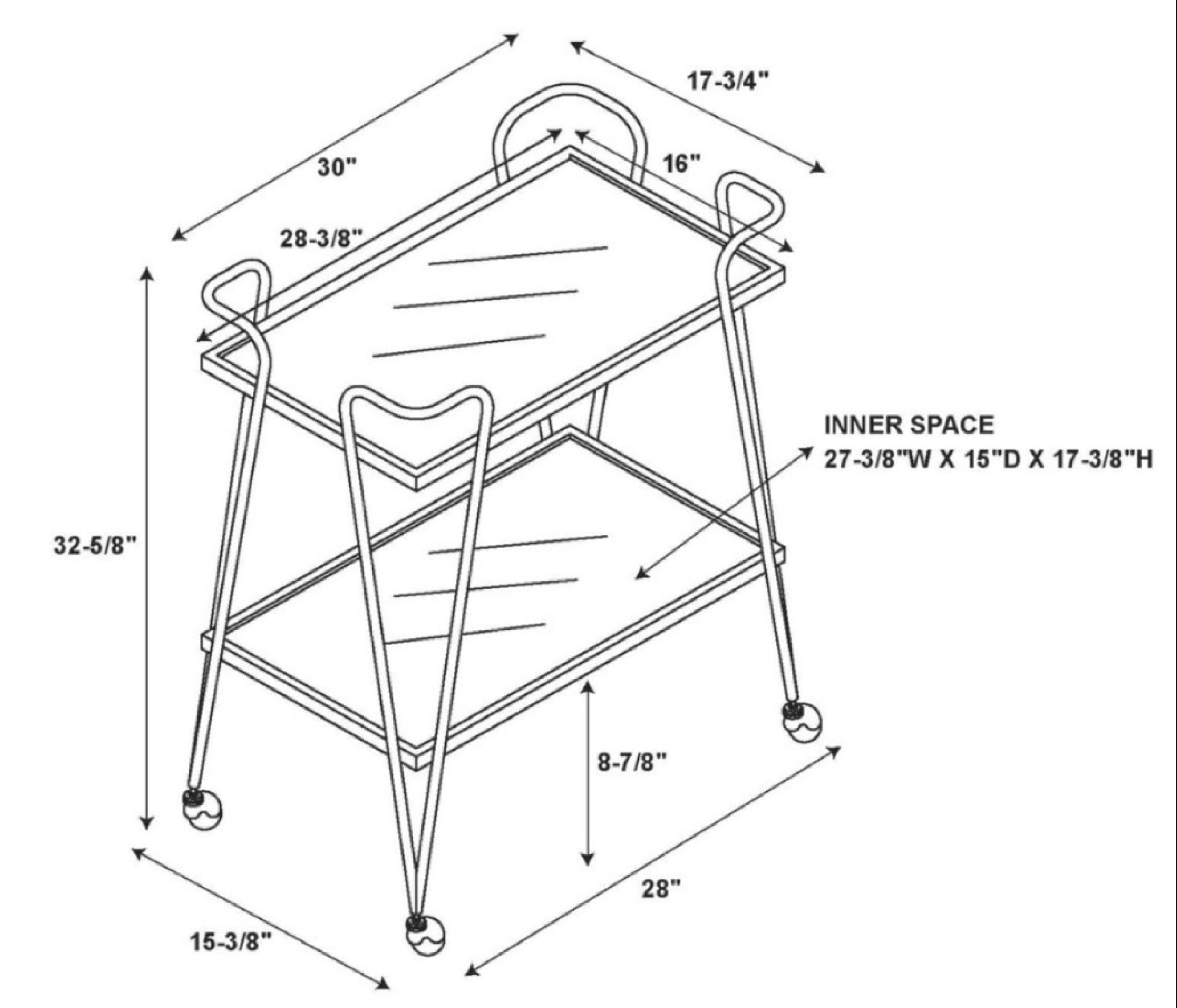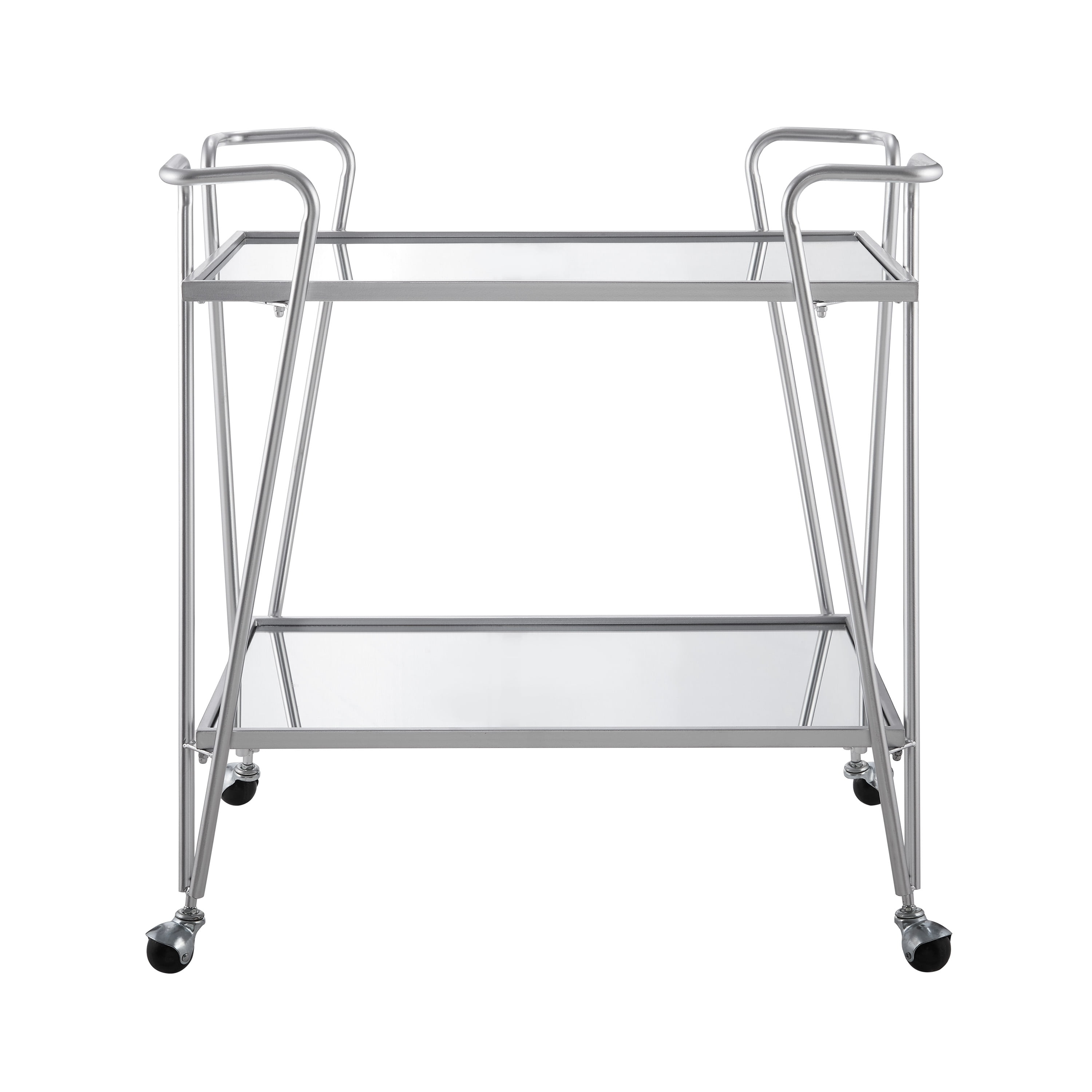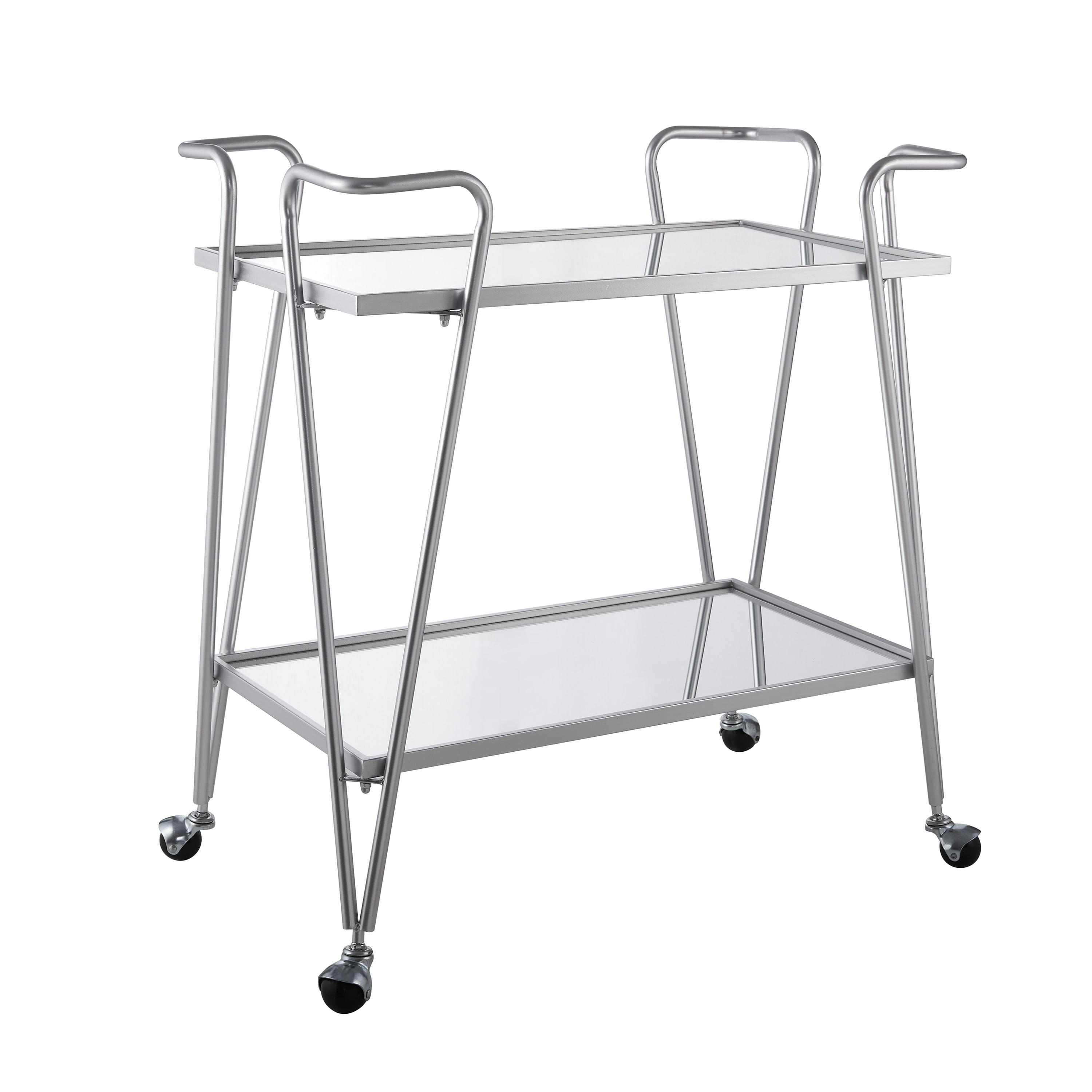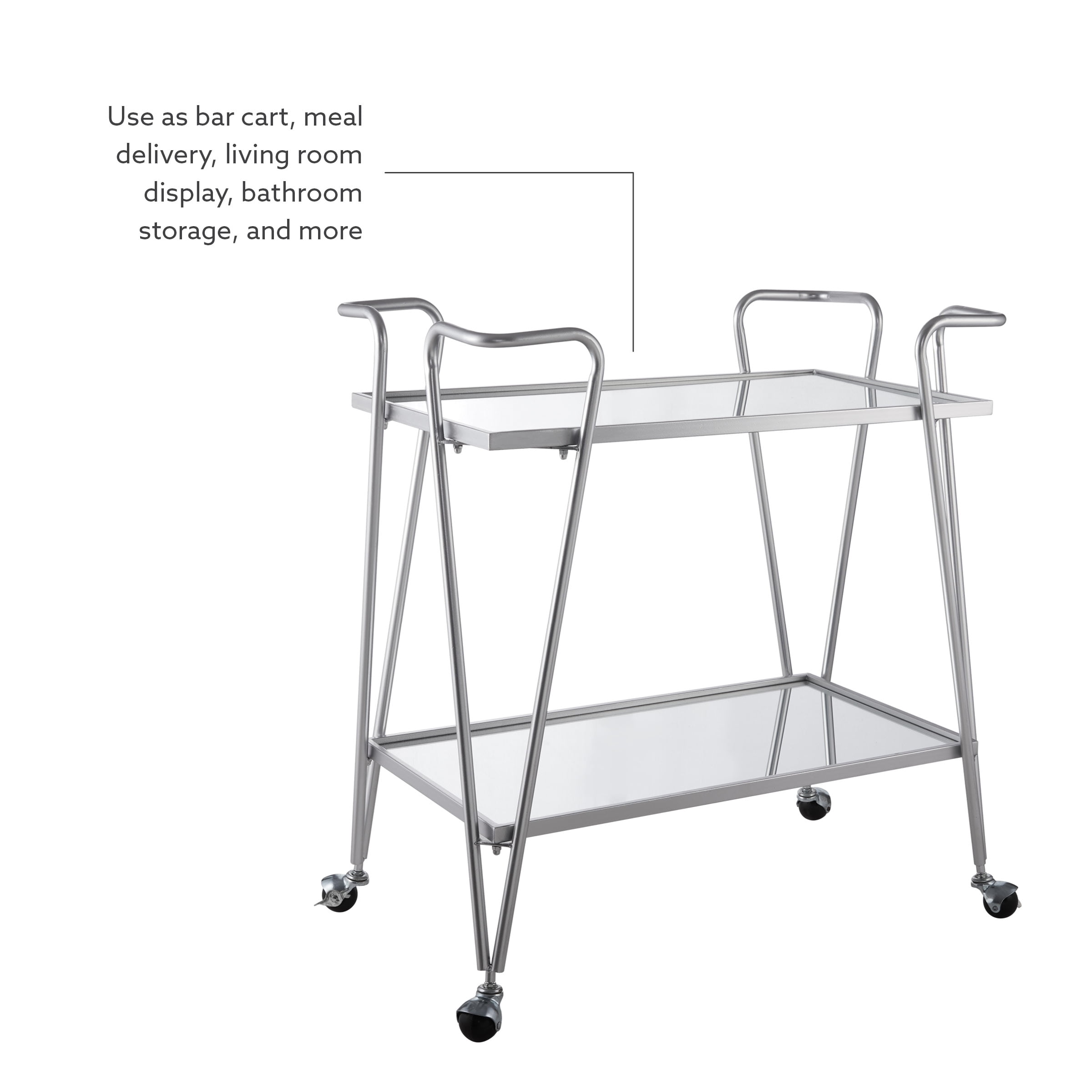 Mid-Century Design and Style Both top and lower shelves are mirrored and framed in a silver metal tray Wheel casters provide for easy mobility around your home Casters lock to hold the cart in place for stability The tubular steel frame is powder coated for a long lasting silver finish Each shelf is 30″ w x 17.75″ d Distance from Shelf to Shelf: 17.44″ Use as for bar or meal service or even as a place to display your favorite items Assembled Dimensions: 30″ w x 17.25″ d x 32.5″ h Weight Capacity: 250 lbs. Assembly Required