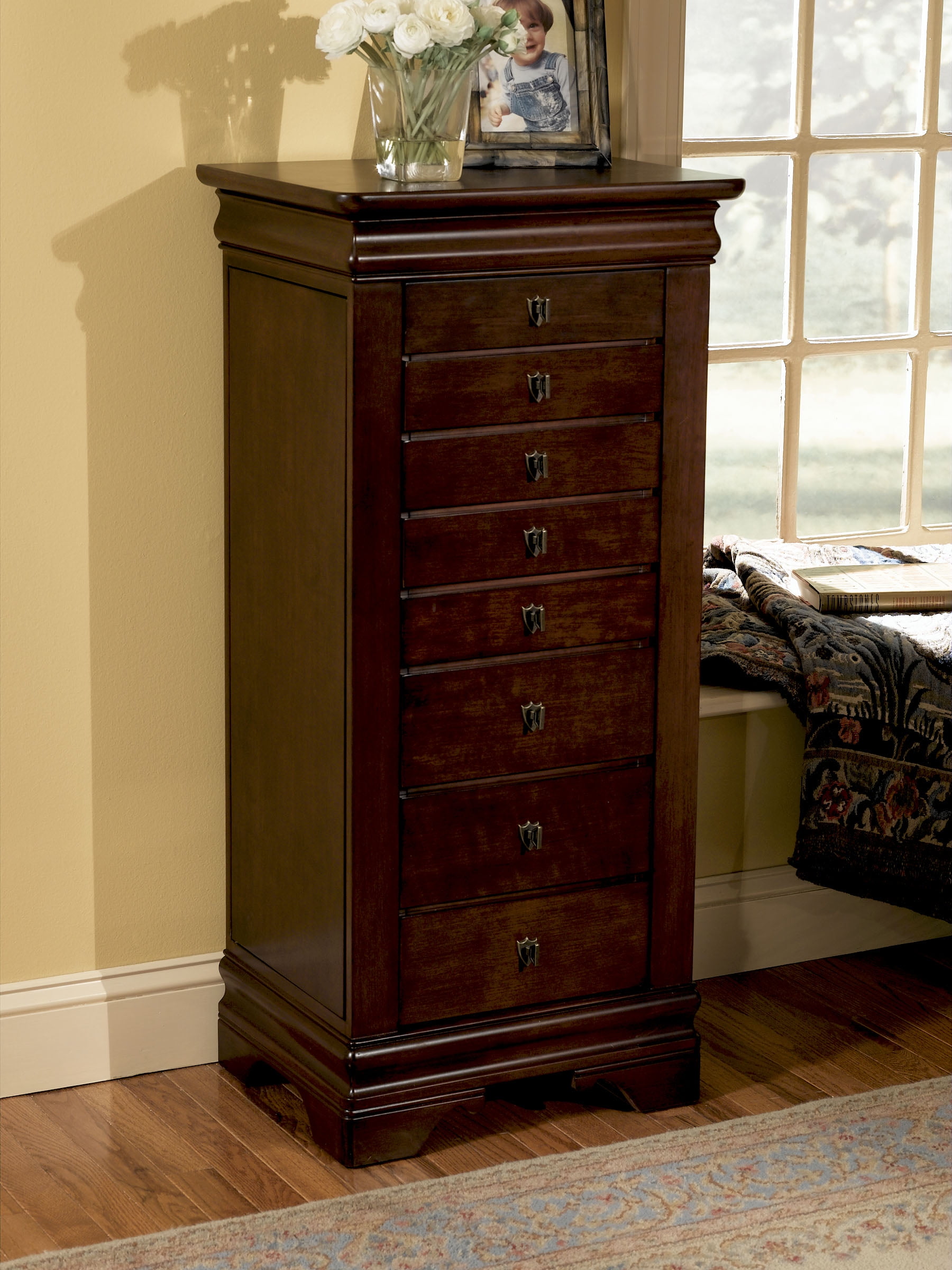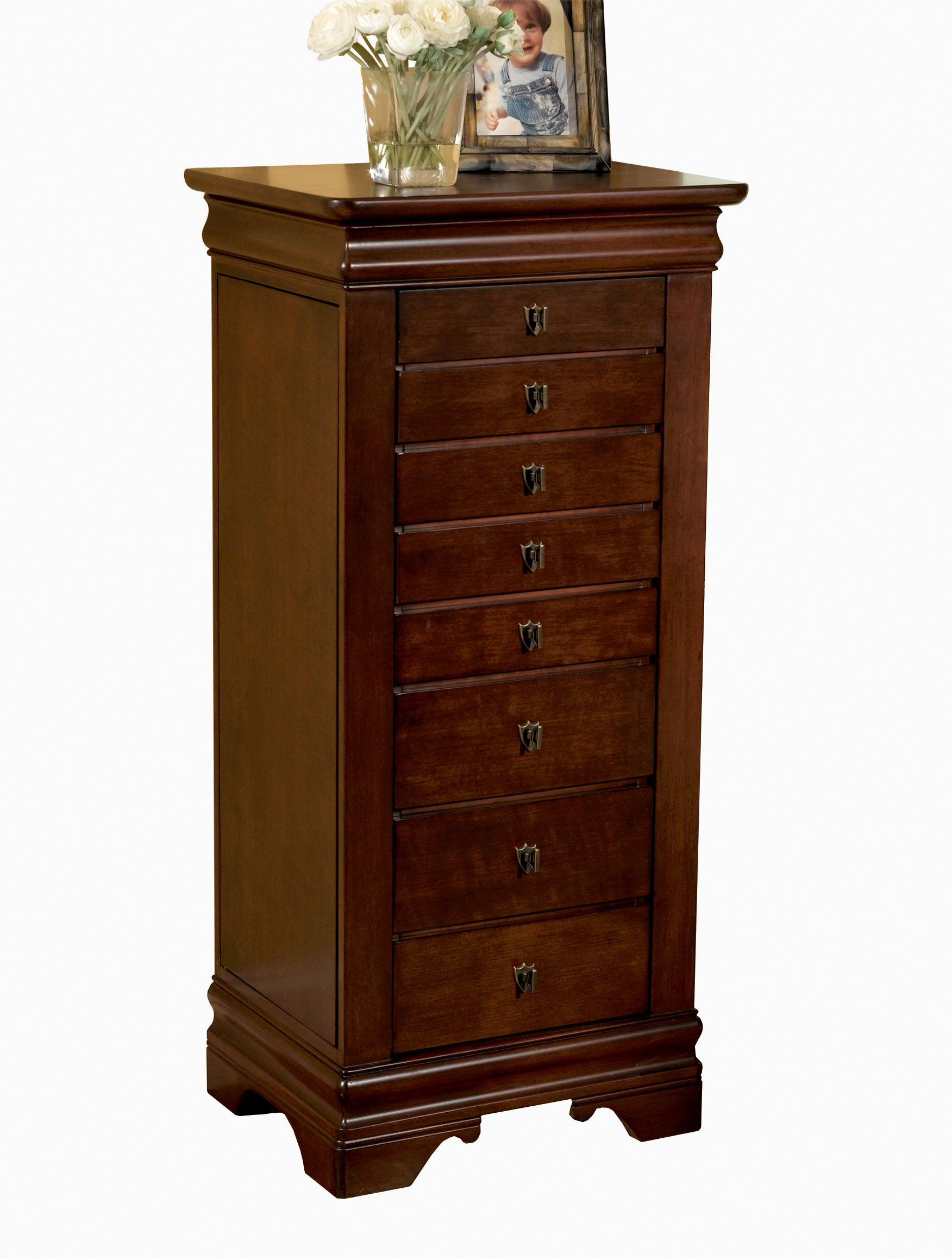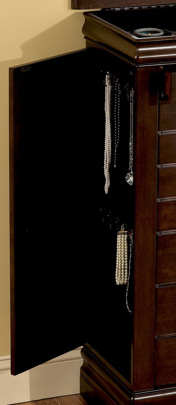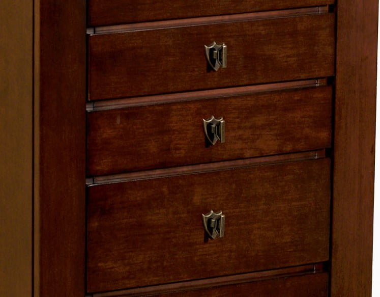 Free-standing jewelry armoire in Marquis Cherry finish is accented with classic Louis Philippe features. Flip-top mirror opens to a lined and divided jewelry compartment. Touch latch side doors swing open to reveal necklace hangers. Eight lined drawers for jewelry and accessories. Lining is plush black and drawer pulls are shaped as a shield of honor in antique brass finish. Minimal assembly, attach top only. Features: Crafted from MDF with Cherry Veneer, Solid Wood with Birch Veneer, Rayon Lining and Mirror Distressed Marquis Cherry Finish Black Lining Antique Brass Drawer Pulls Flip-top mirror opens to a lined and divided jewelry compartment Provides enough storage space for all of your prized treasures Minimal Assembly, Attach Top Only Comes with an anchor kit for safety Specifications: Assembly Required: Some Assembly Required Product Dimensions: Closed: 20.13″w x 15.13″d x 43″h, Open: 40″w x 18.75″d x 56.25″h Product Weight: 82.69 lbs Drawer Dimensions: 10.625″ x 11″ x 1.5″, 10.625″ x 11″ x 3.5″