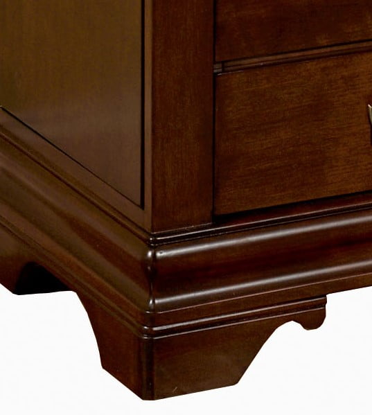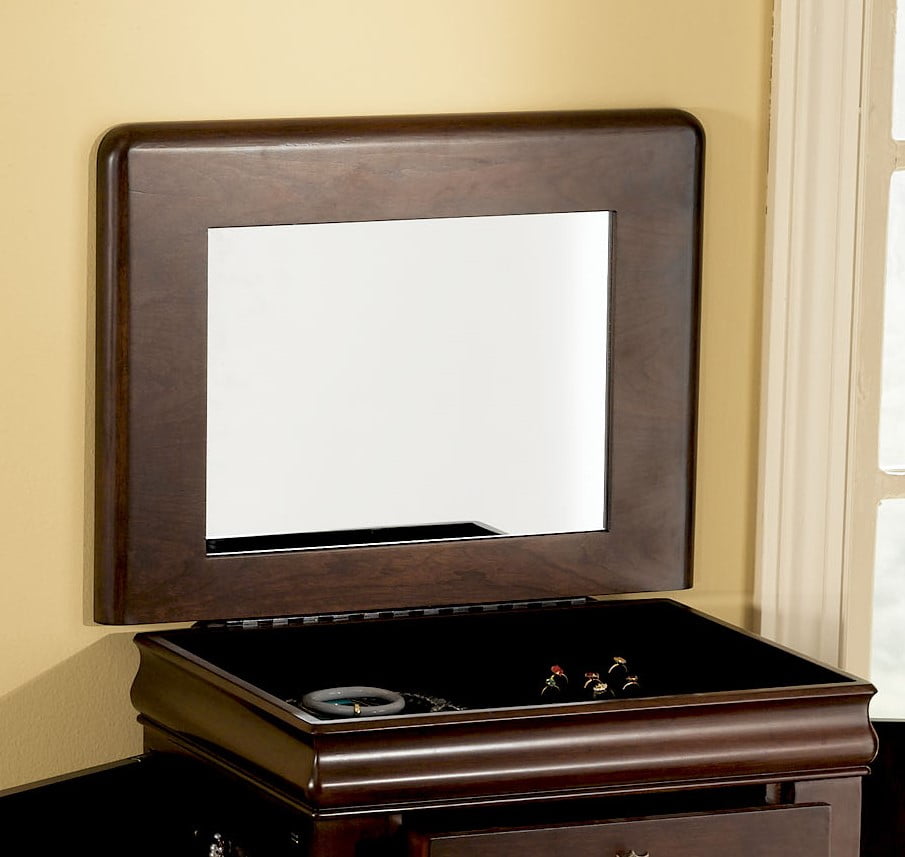 Crafted from MDF with Cherry Veneer, Solid Wood with Birch Veneer, Rayon Lining and Mirror Distressed Marquis Cherry Finish Black Lining Antique Brass Drawer Pulls Flip-top mirror opens to a lined and divided jewelry compartment Provides enough storage space for all of your prized treasures Minimal Assembly, Attach Top Only Comes with an anchor kit for safety
