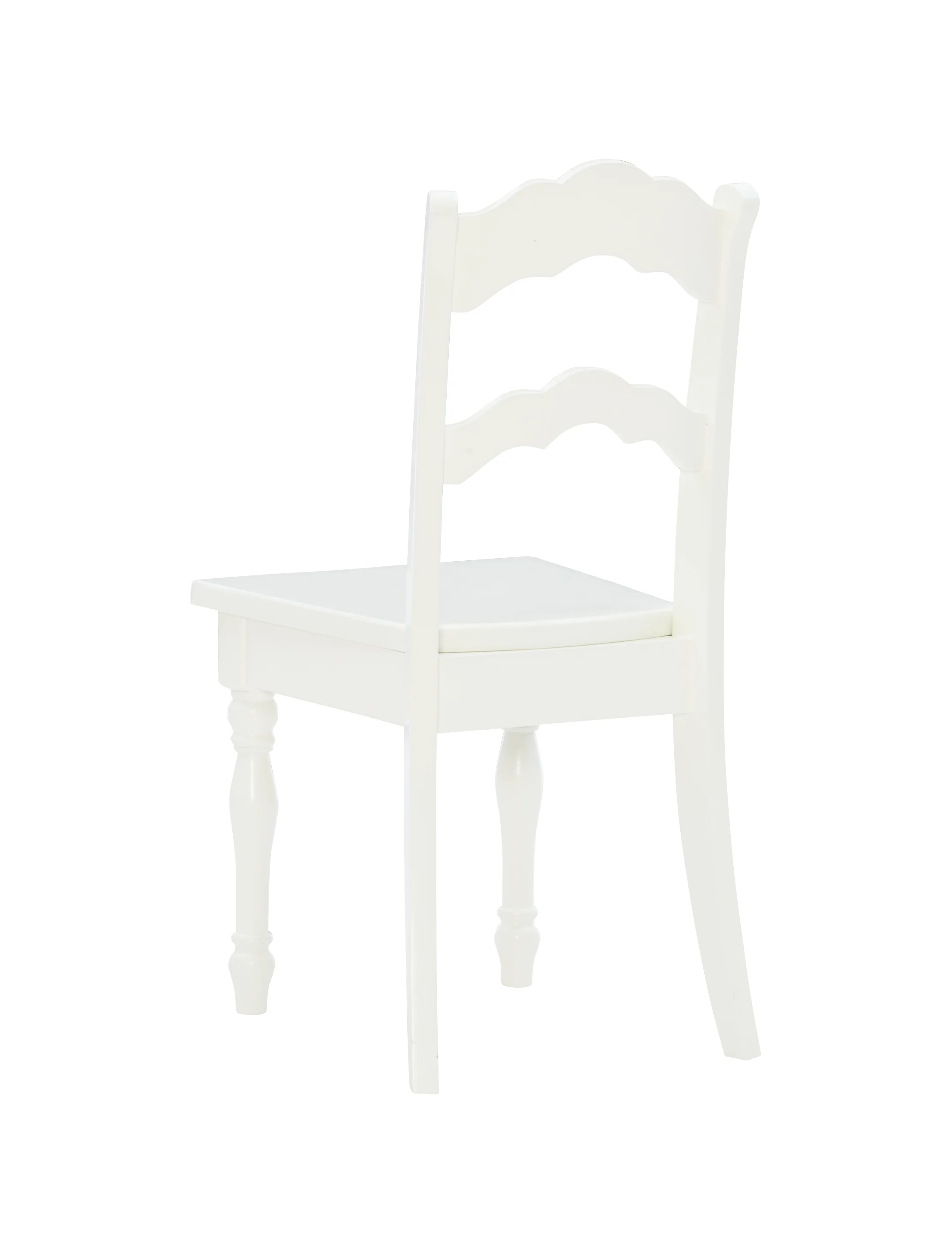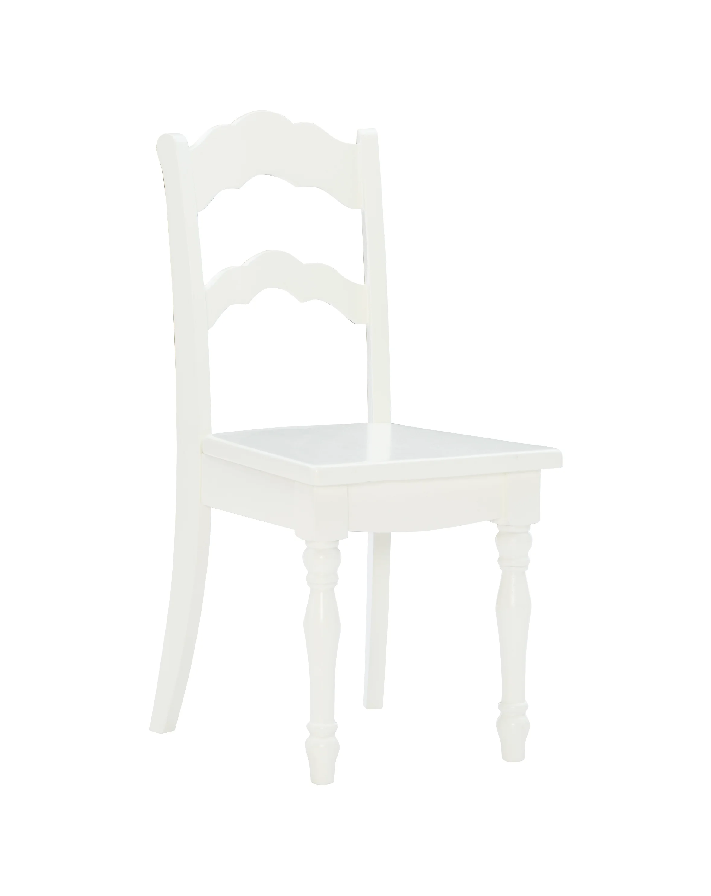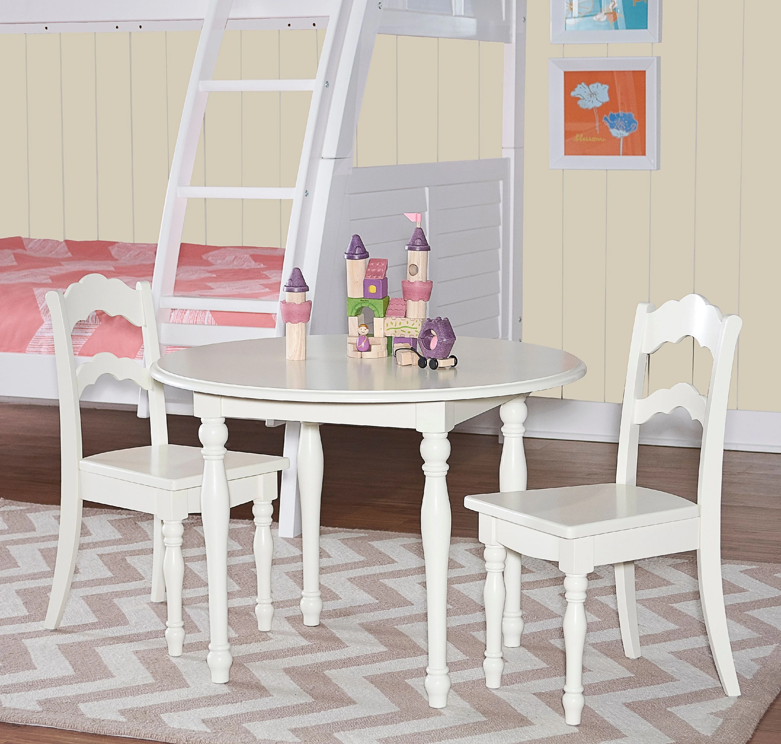 Perfectly sized for young kids work and play, this adorable table and chairs are ready for arts and crafts, tea parties, and more. With a vanilla finish, turned legs, a round tabletop, and scalloped ladderback chairs, this set combines classic design with functionality for your child’s room or anywhere in the house. Features: Crafted from Solid Wood, Rubberwood and MDF Vanilla White Finish Set includes two chairs and one table Elegant turned legs Table: 30 x 30 x 21.5 Chairs: 11.75 x 15 x 26.25 Specifications: Assembly Required: Some Assembly Required Product Dimensions: Table: 30” x 30” x 21.5” Tall; Chairs: 11.75” x 15” x 26.25” Tall Product Weight: 38.37 lbs
