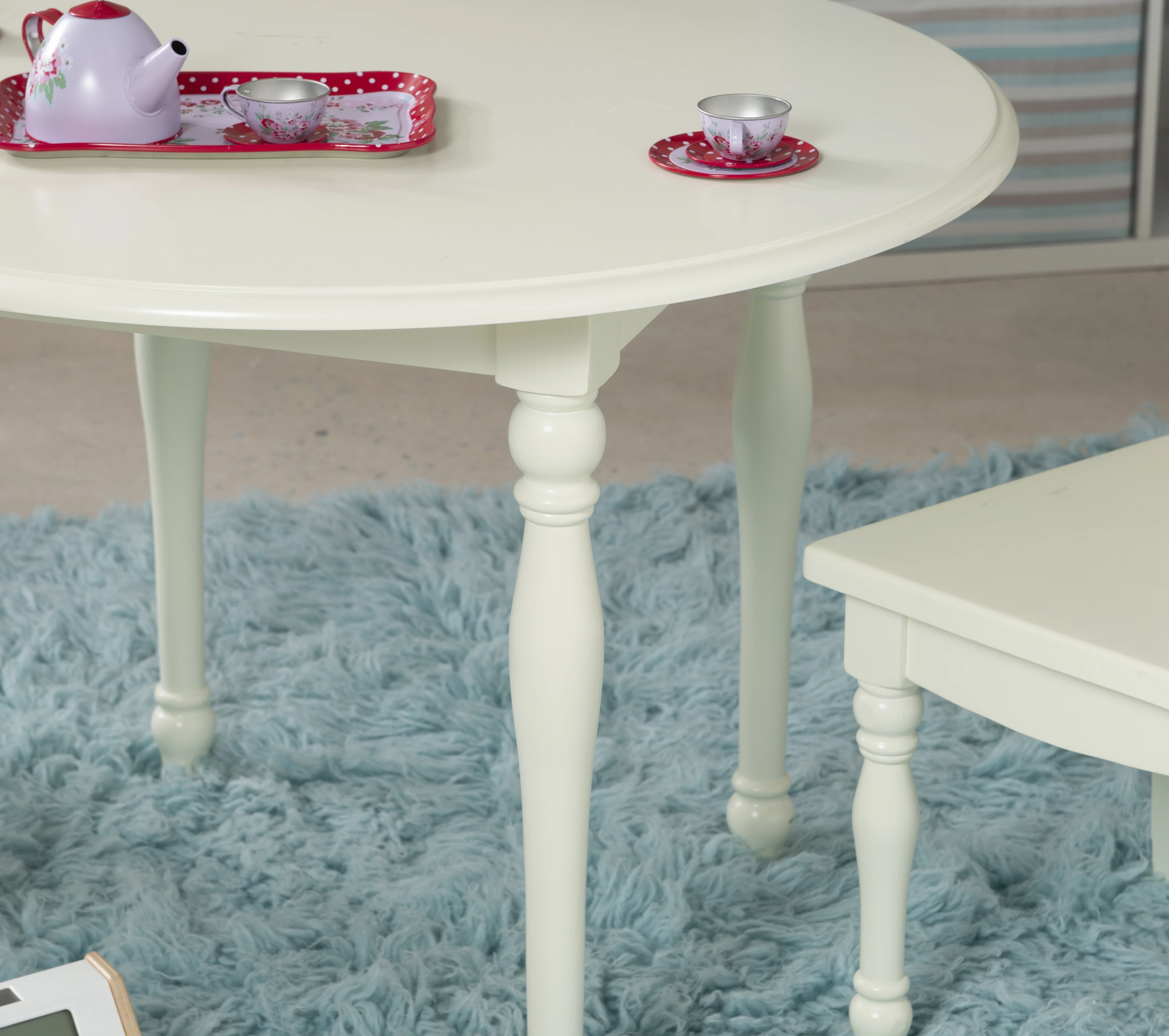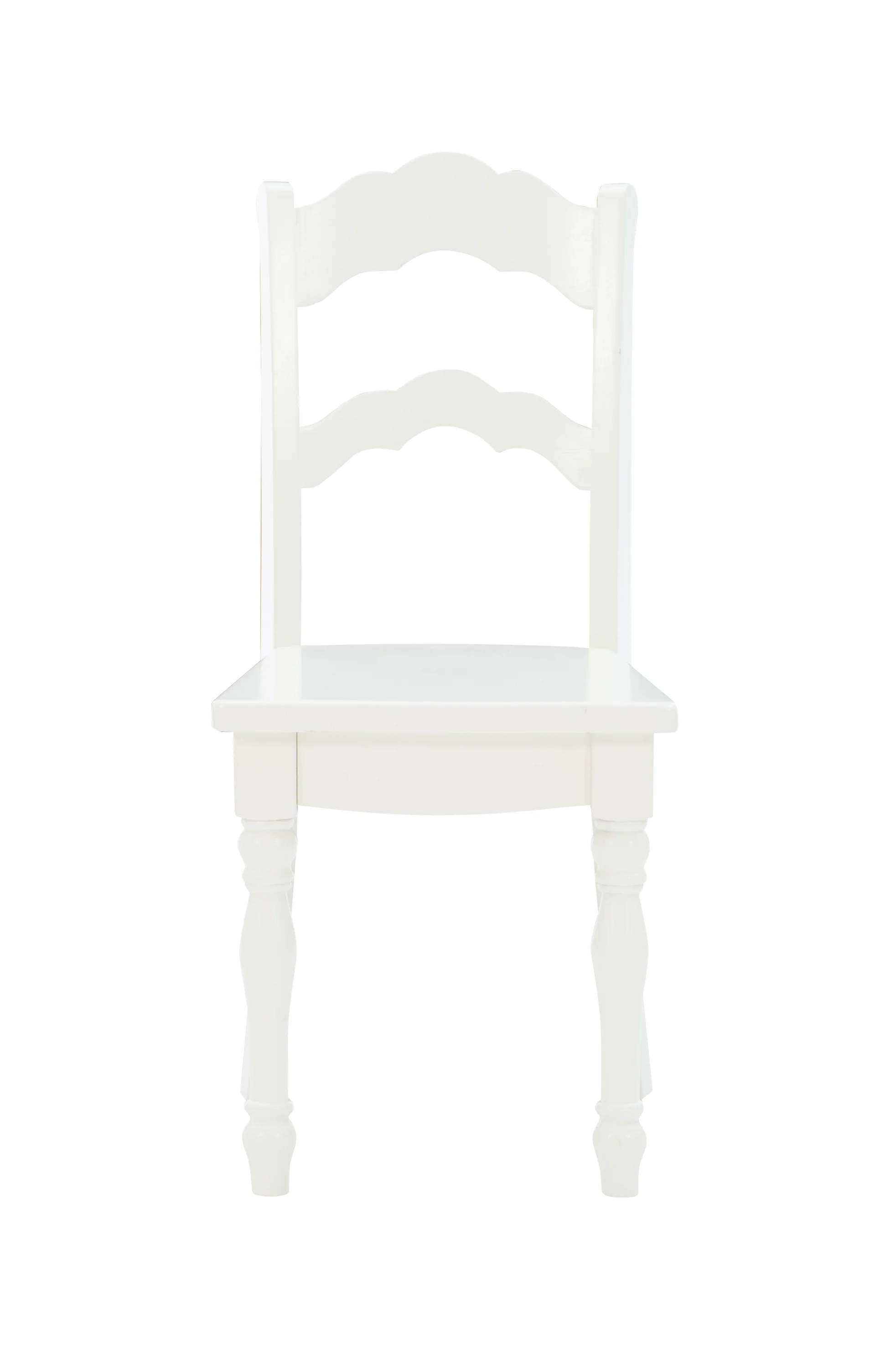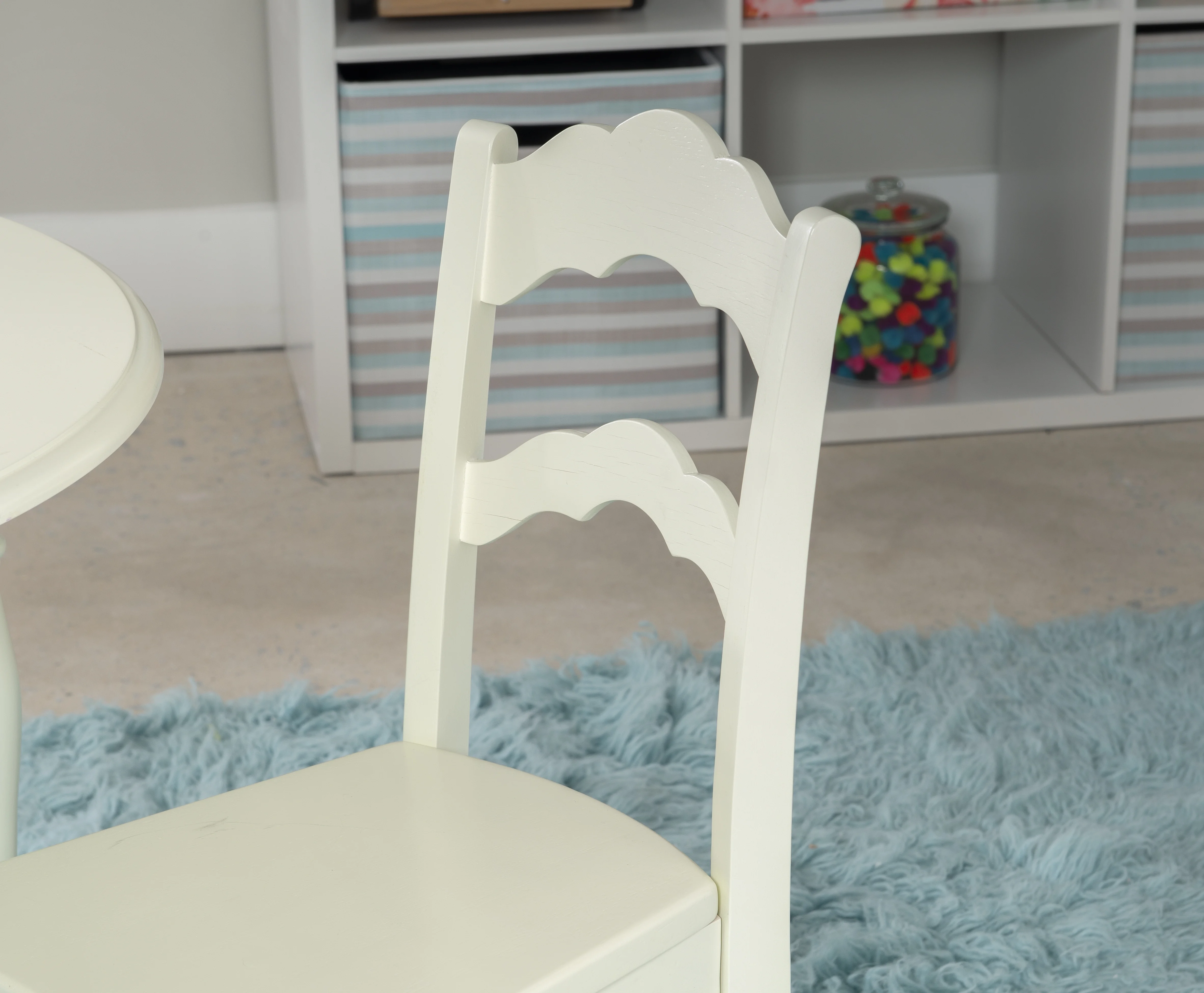 Perfectly sized for young kids work and play, this adorable table and chairs are ready for arts and crafts, tea parties, and more. With a vanilla finish, turned legs, a round tabletop, and scalloped ladderback chairs, this set combines classic design with functionality for your child’s room or anywhere in the house. Features: Crafted from Solid Wood, Rubberwood and MDF Vanilla White Finish Set includes two chairs and one table Elegant turned legs Table: 30 x 30 x 21.5 Chairs: 11.75 x 15 x 26.25 Specifications: Assembly Required: Some Assembly Required Product Dimensions: Table: 30” x 30” x 21.5” Tall; Chairs: 11.75” x 15” x 26.25” Tall Product Weight: 38.37 lbs