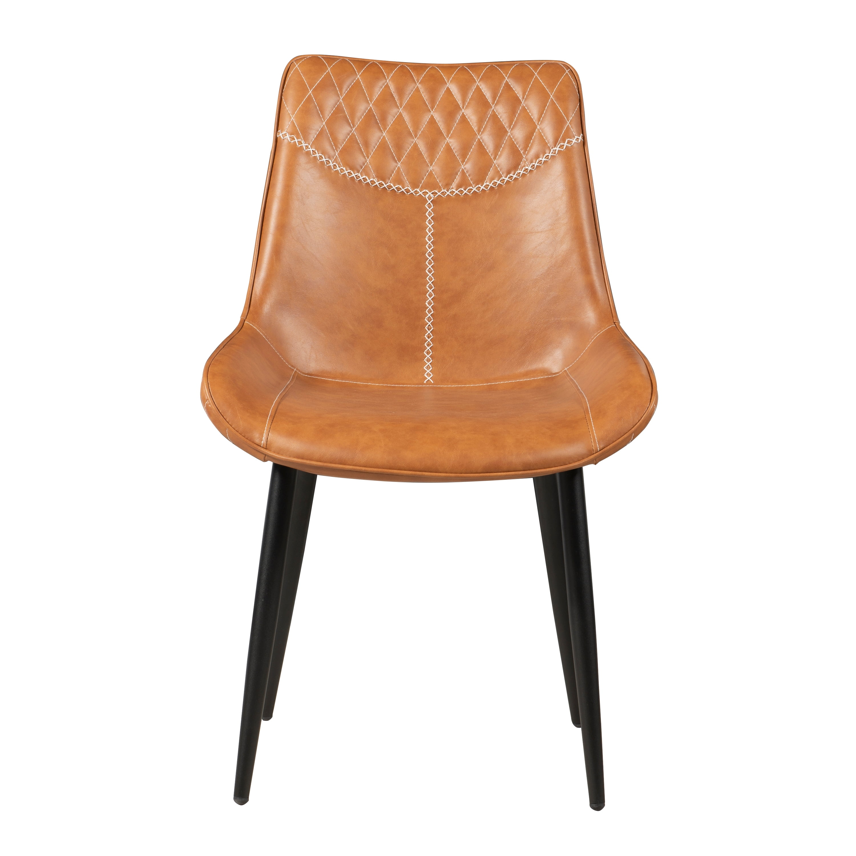 Contemporary and classic, these dining chairs fit into a variety of environments with ease. The curved scoop seat makes for comfort, while the black metal legs are crafted for durability. The faux leather-like upholstery is accented with white quilting and baseball style stitching details. Purchase includes two chairs.