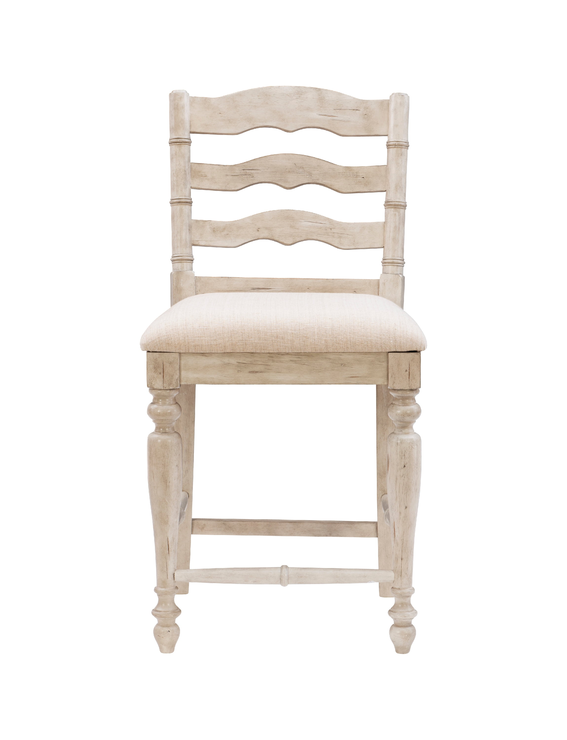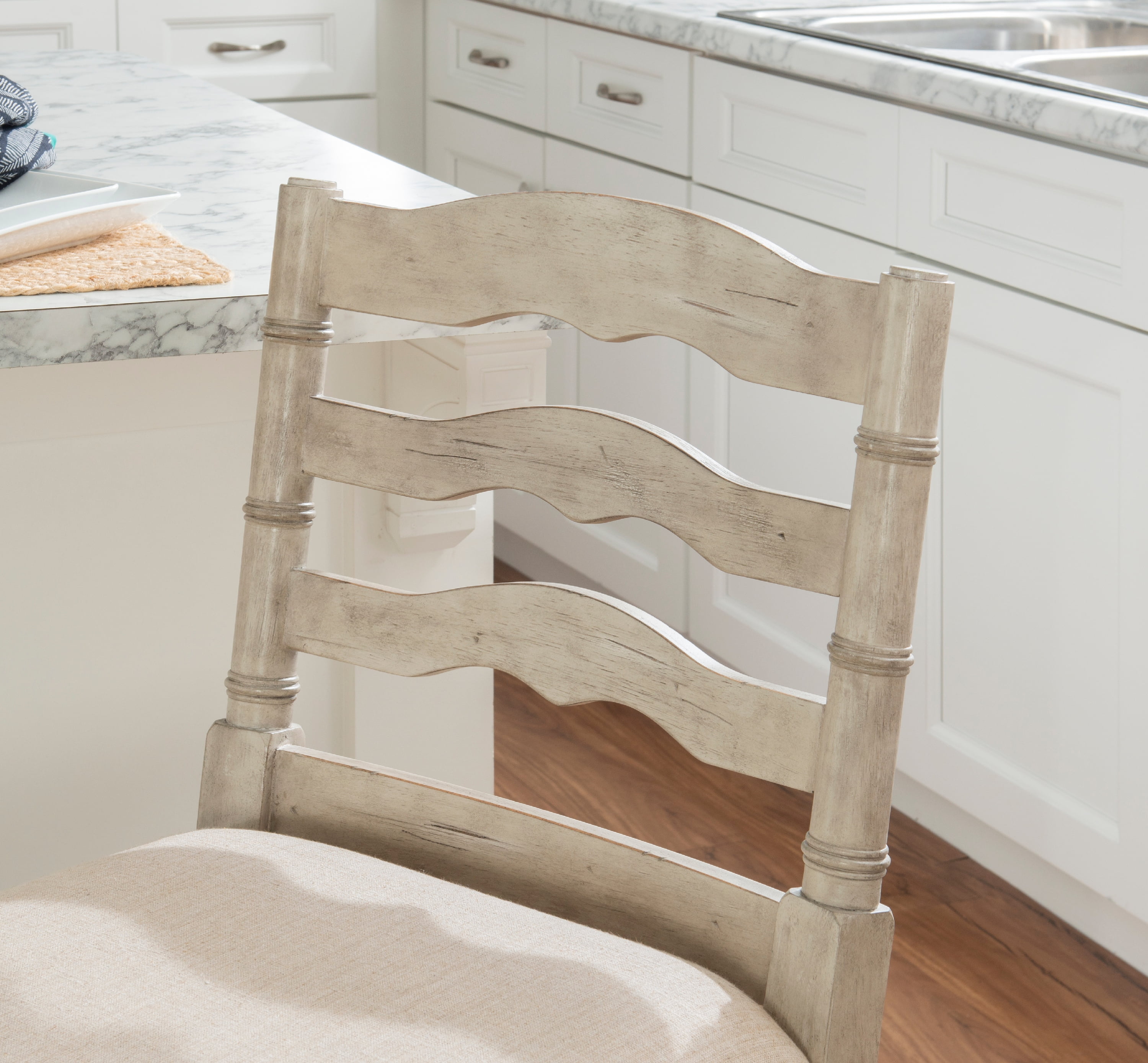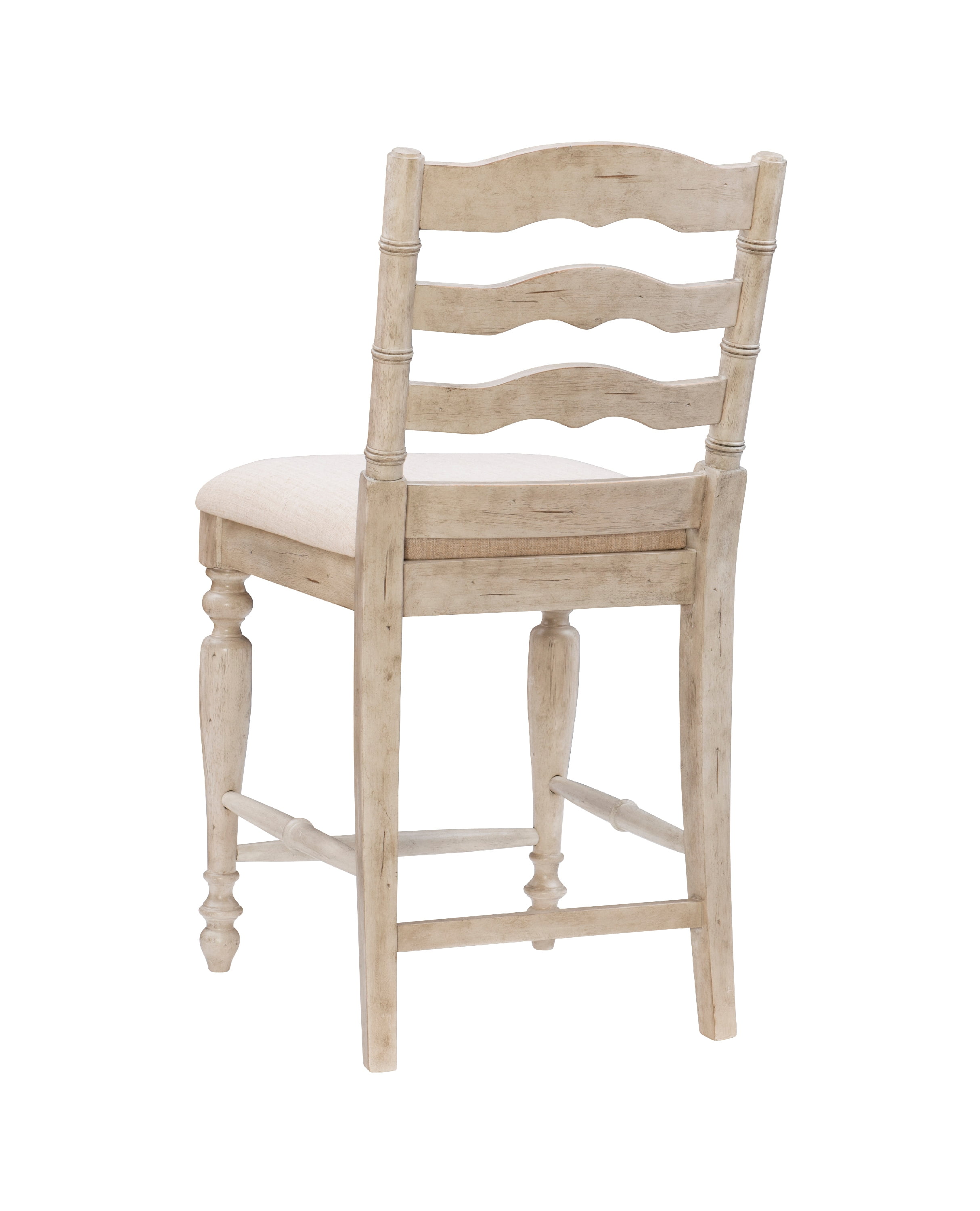Eye-catching turned front legs White Wash Finish Linen Padded Seat Counter Height – 24″ Seat Height Unique curved back design Assembled Dimensions: 19.5″w x 22.75″d x 39″h Weight Capacity: 250 lbs Assembly Required Ships in 1 box