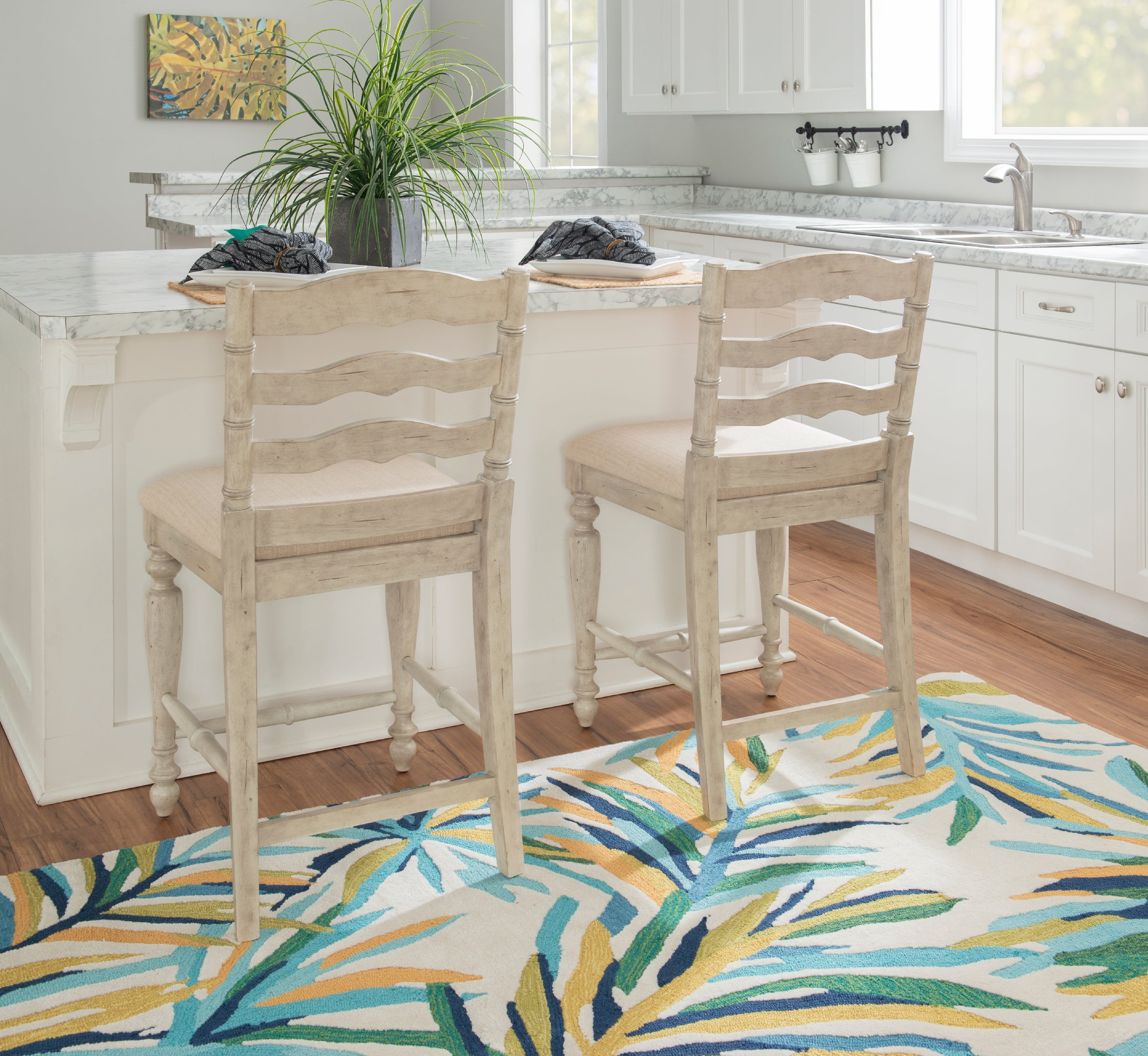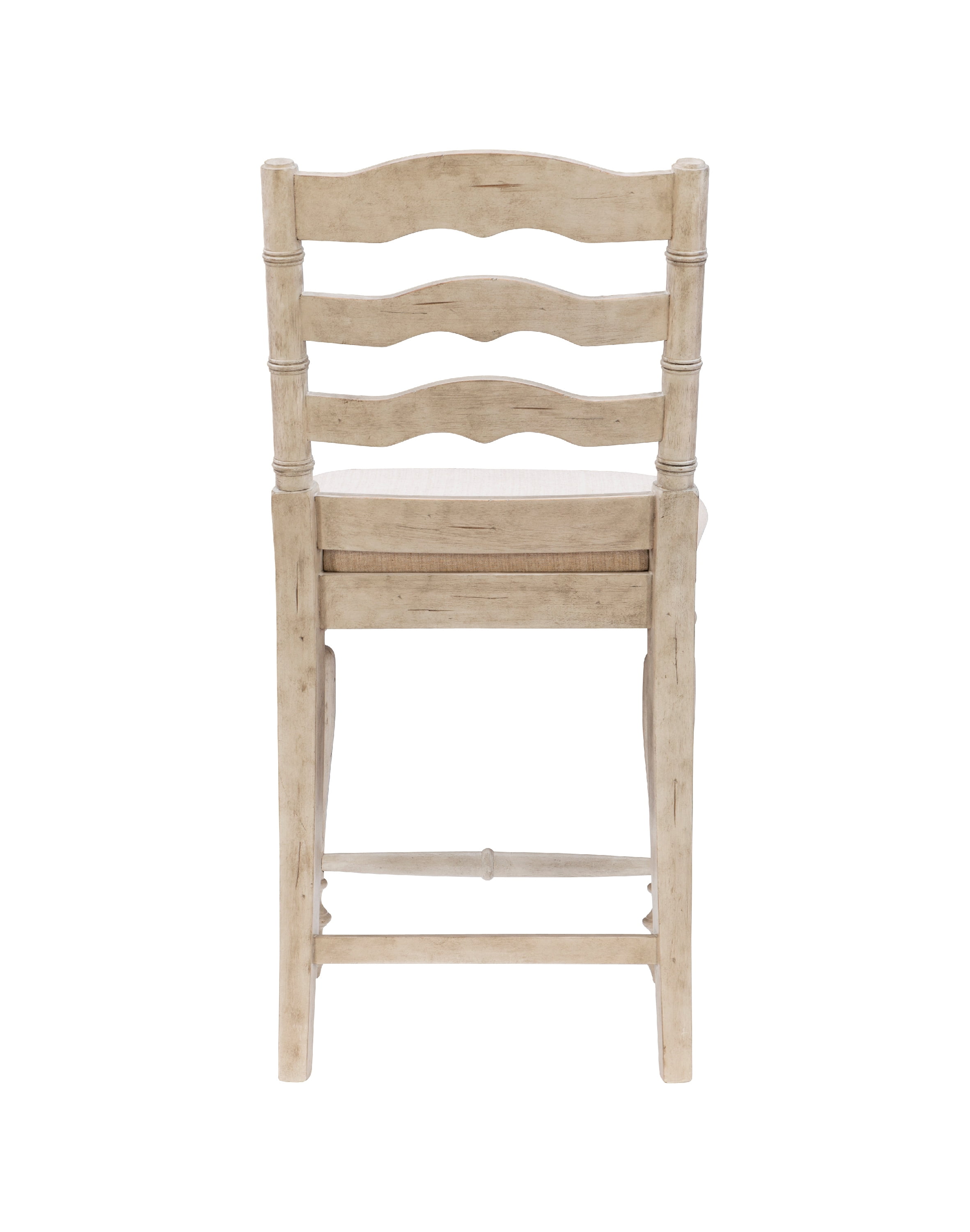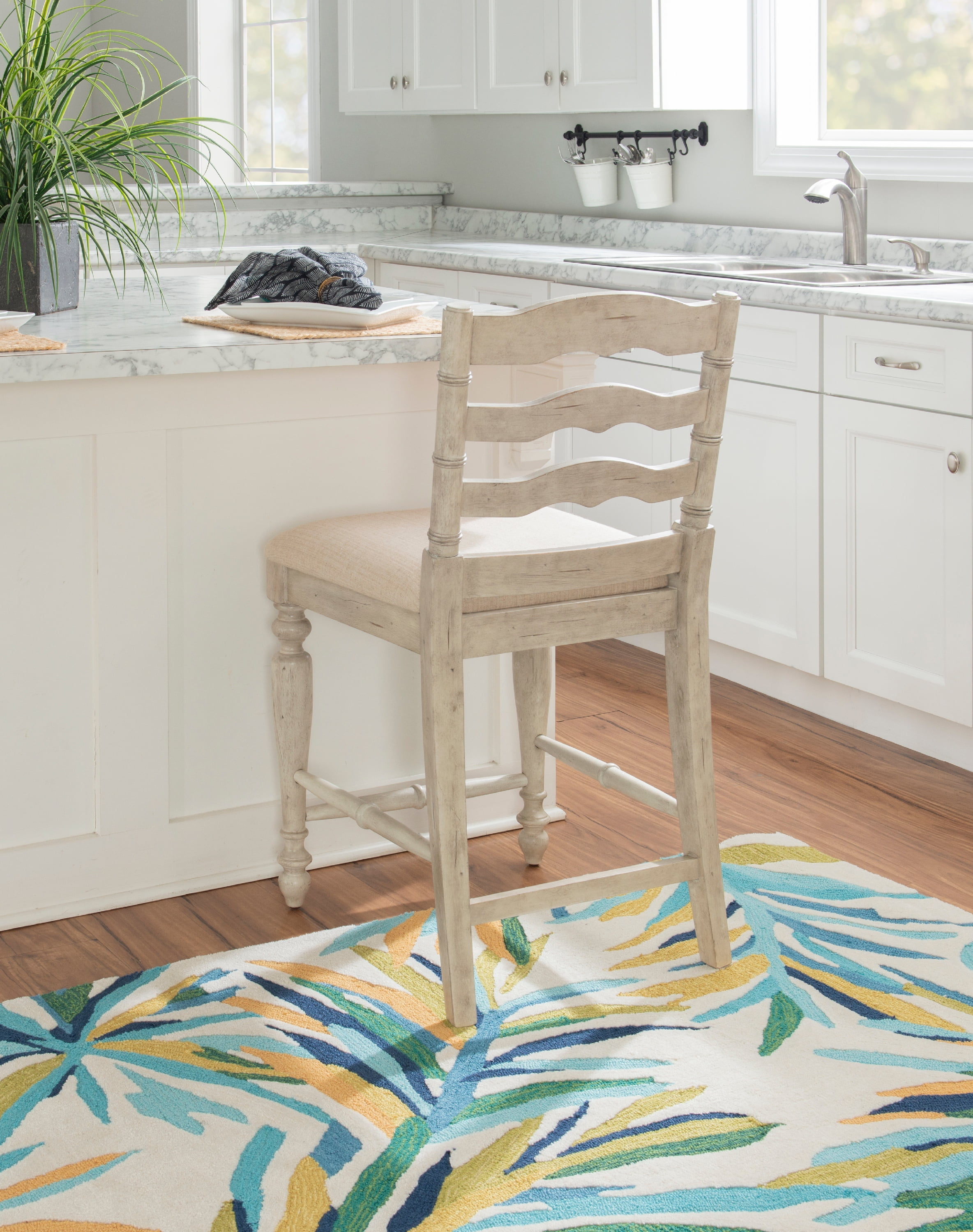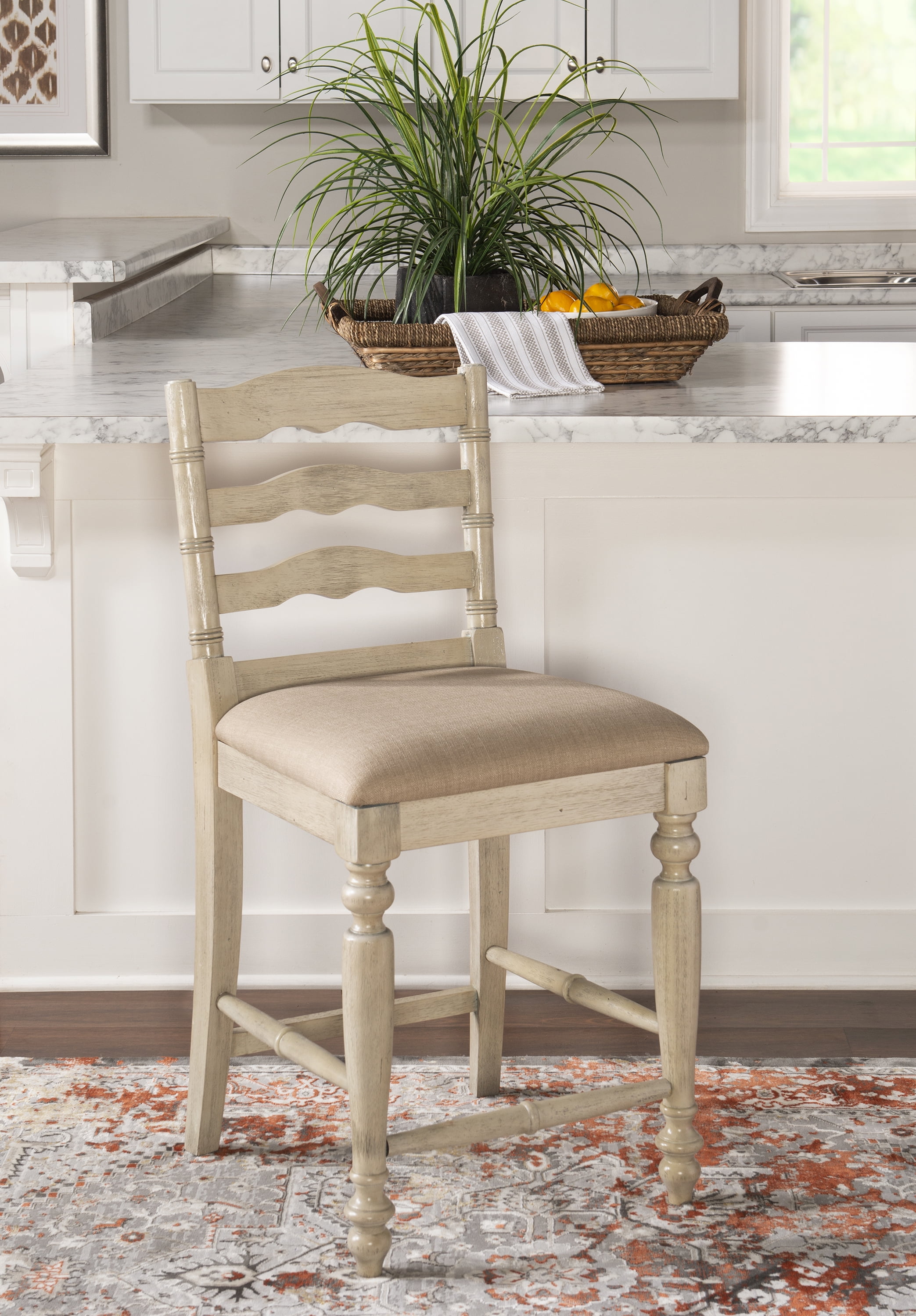 Eye-catching turned front legs White Wash Finish Linen Padded Seat Counter Height – 24″ Seat Height Unique curved back design Assembled Dimensions: 19.5″w x 22.75″d x 39″h Weight Capacity: 250 lbs Assembly Required Ships in 1 box