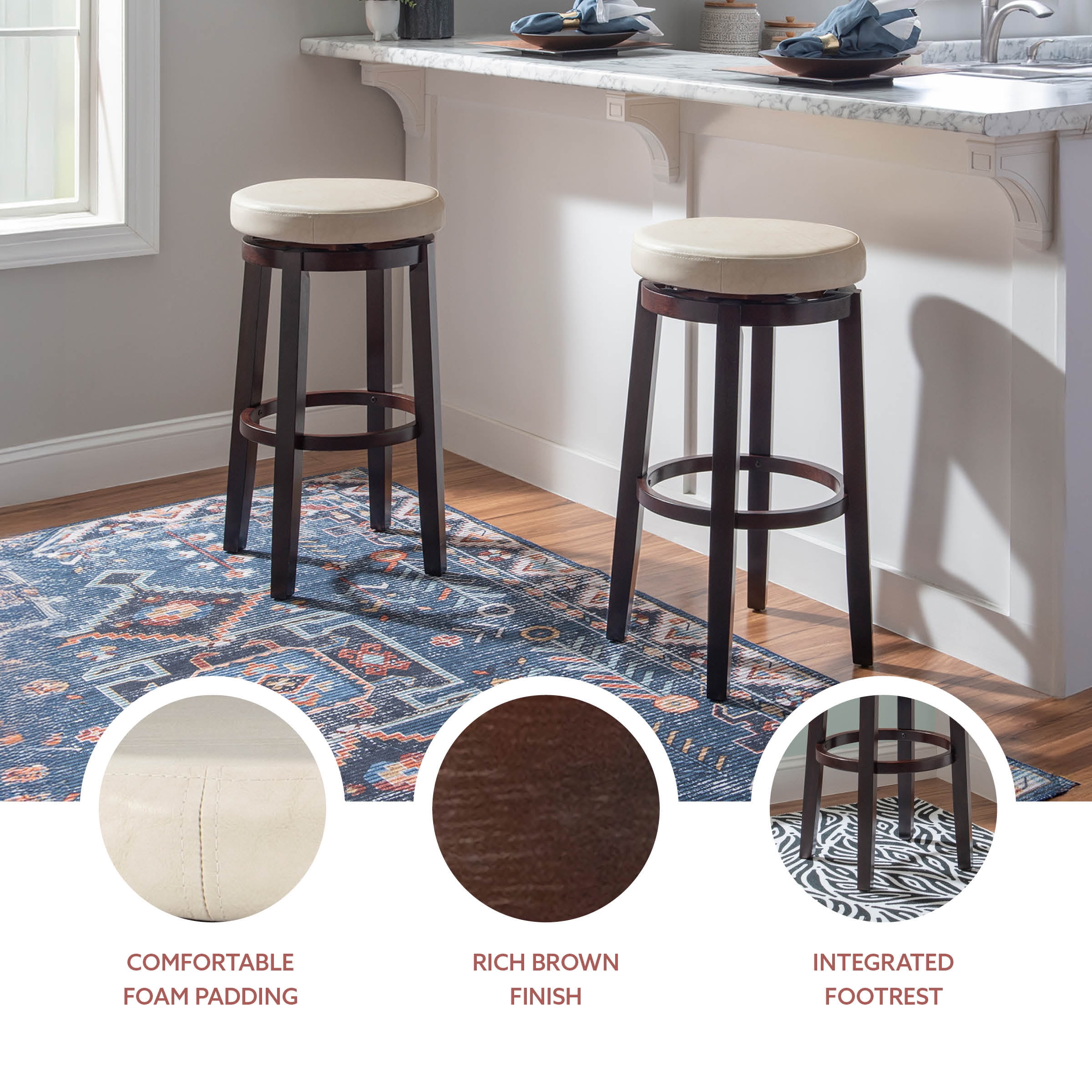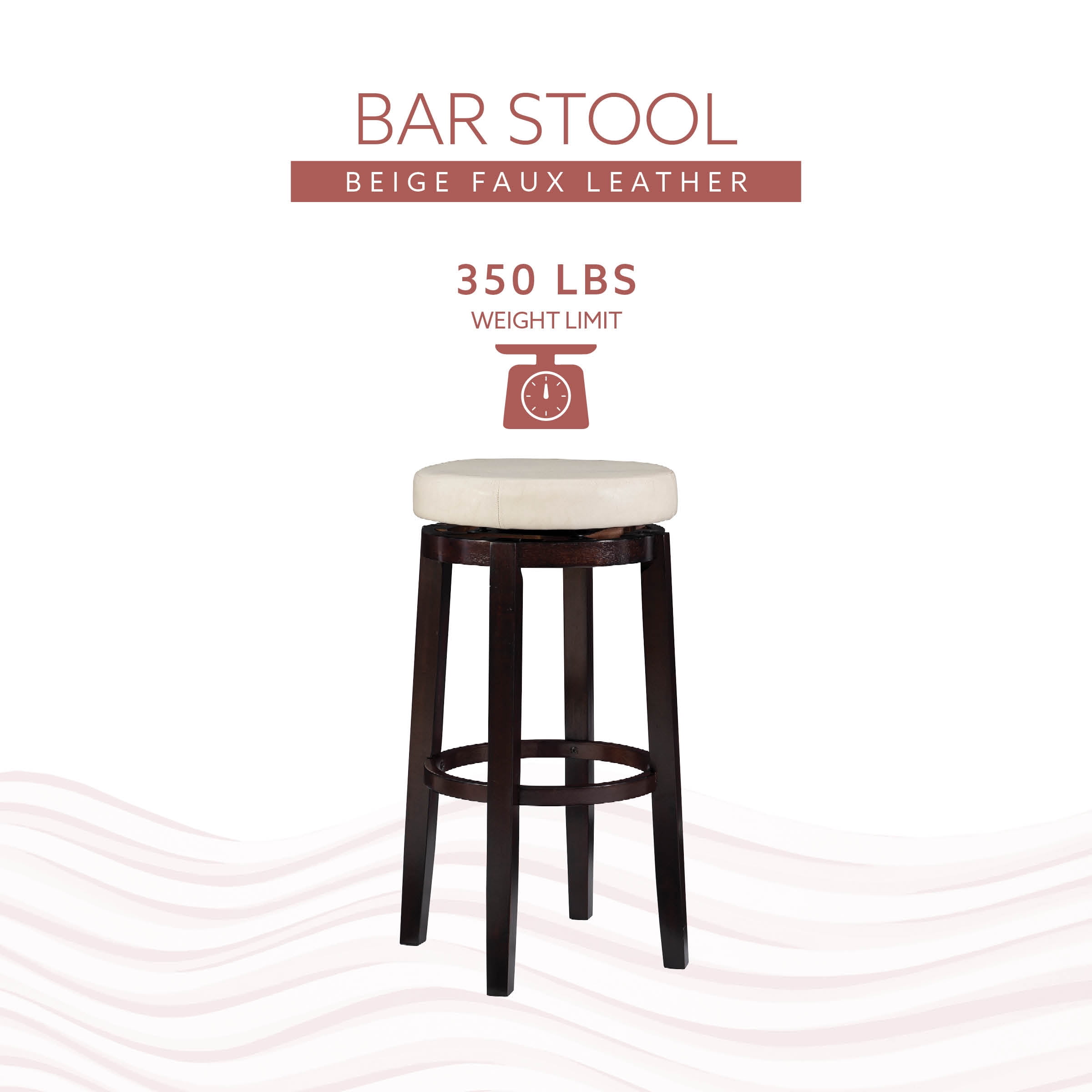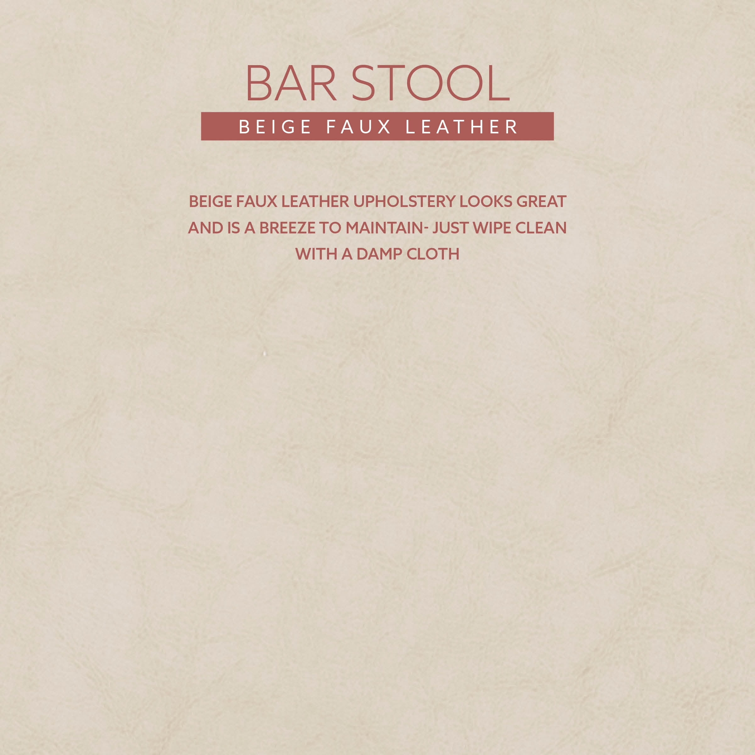 Crafted from Rubberwood and Bentwood giving it a sturdy base that supports weights of up to 350 lbs A brown finish features a lacquer coating, giving it a subtle sheen that accents the clean transitional design cues, and helps to protect it against the elements The seat is wrapped in beige faux leather, remaining durable and easy to clean for the life of the stool With a 31″ seat height, this stool is ideal for counters ranging from 39″ to 43″ in height, ensuring a comfortable seating experience Plush foam cushioning covers the seat, ensuring comfort while reading, dining, relaxing or entertaining guests 360 degree swivel seat. The seat rotates all the way around, providing comfort and convenience during meals and gatherings The integrated footrest measures 12″ from the floor, giving you additional flexibility and comfort Some Assembly Required. The stool arrives with some assembly needed. Simply attach the legs using the included hex bolts and washers, only a Phillips head screwdriver is required Designed for Residential Use Only. It’s not intended for commercial or heavy-duty environments, ensuring it remains a perfect fit for your living areas, bedrooms, and other personal spaces where you want to relax and enjoy