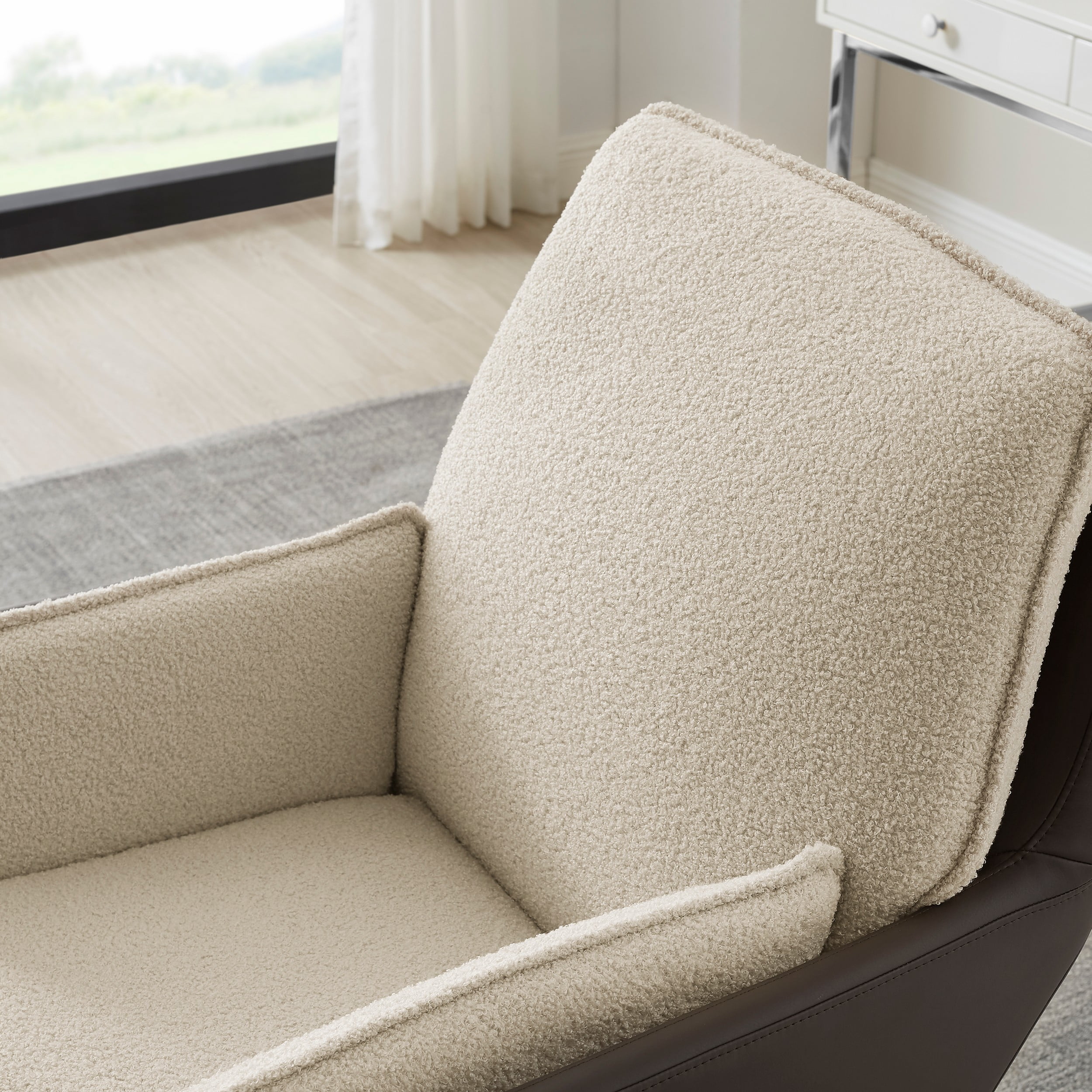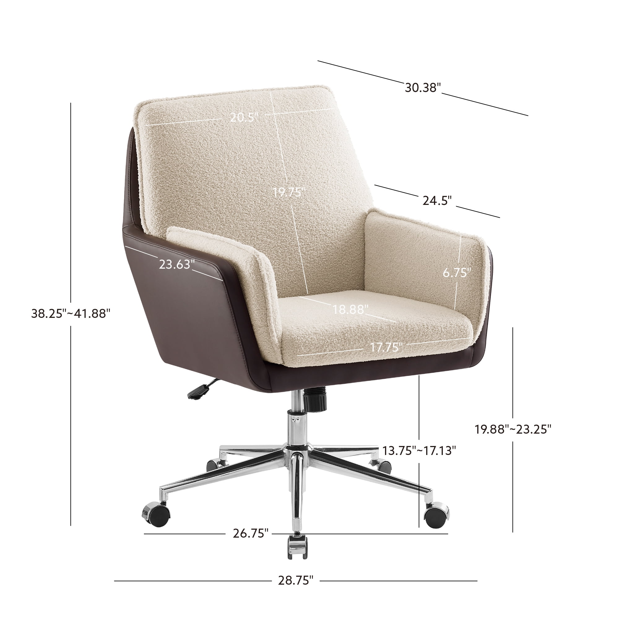 Soft beige sherpa fabric is cozy and inviting Brown faux leather shell supports cushioned seat Chrome base swivels with ease Lift and tilt feature allow you to find the perfect angle and position at your desk Metal castors make for seamless transport across your office space Contemporary design pairs well with wide range of decor Supports up to 275 lbs Arrives with only assembly of legs required Assembled Dimensions: 28.75″ L x 30.38″ D x 38.25-41.88 Ships in 1 box For adult use
