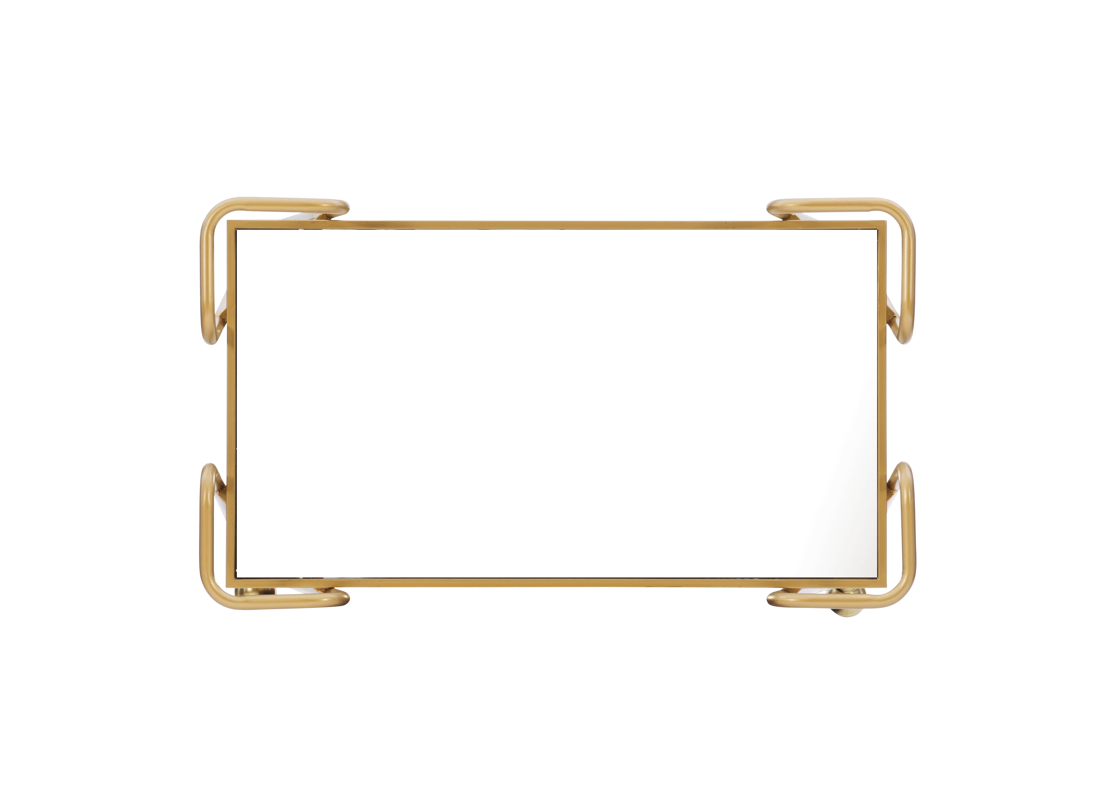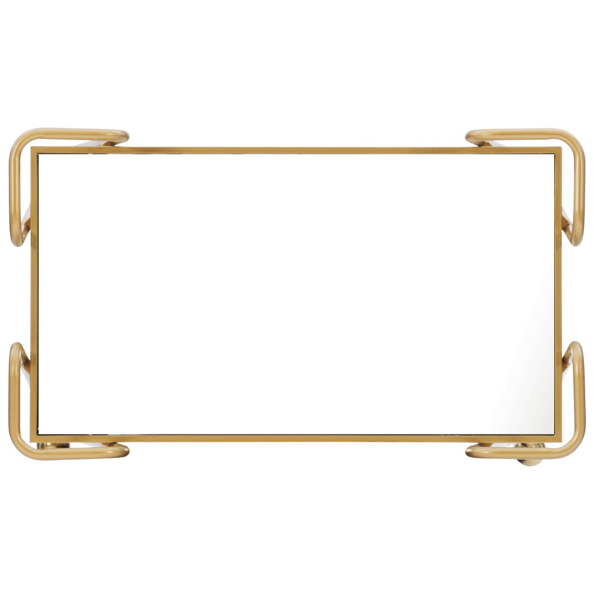 Mid century design and style Mirrored top and shelf Castors provide for easy mobility around your home. Gold finish Floor to bottom shelf 8.86in Distance from shelf to shelf 17.44in Mirror 28.17in x 15.75in Brand: Linon