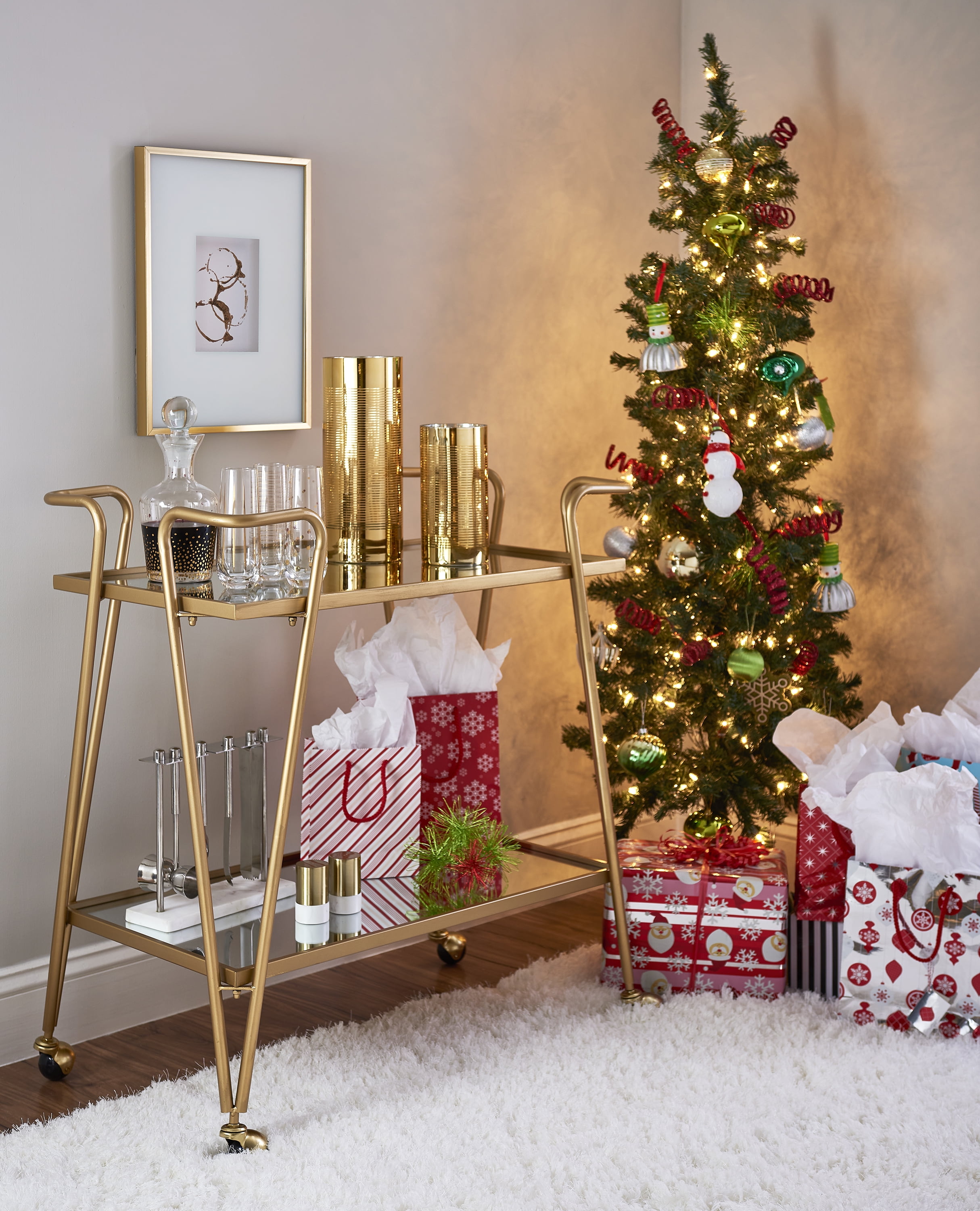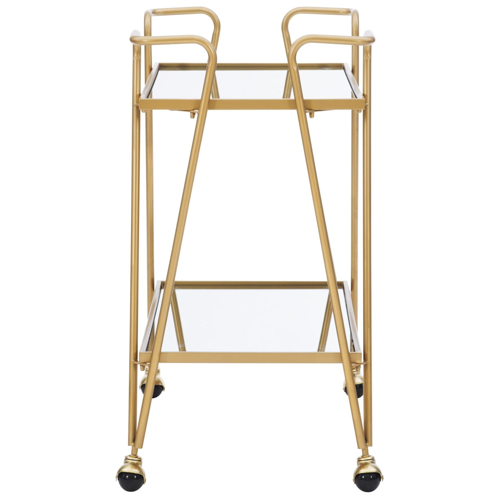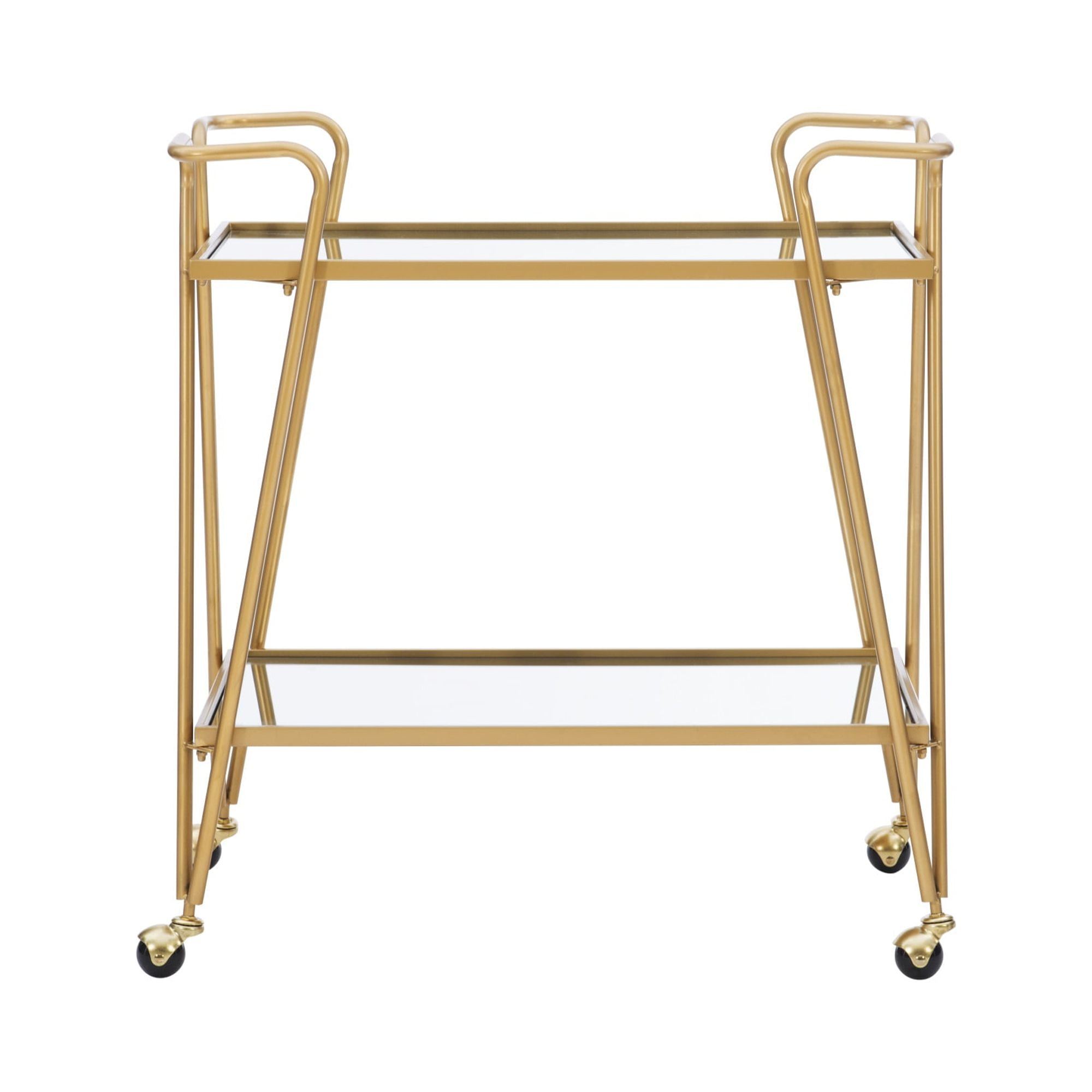 Ideal for entertaining, this Mid-Century Bar Cart is sure to infuse your next gathering with character. Two spacious shelves provide ample storage space for bottles, glasses and other bar essentials as you pour drink after drink. Durable metal legs cast in a gold finish perfectly round out this storage accent, allowing you to bring rustic glam into any room of your choosing. Features: Crafted from 70% Steel, 20% Mirror and 10% Hardware Gold Finish Mirrored top and shelf Mid Century Design and Style Castors provide for easy mobility around your home Floor to Bottom Shelf: 8.86″ Distance from Shelf to Shelf: 17.44″ Mirror: 28.17″ x 15.75″ Specifications: Assembly Required: Some Assembly Required Product Weight: 26.9 lbs Product Dimensions: 30″w x 17.38″d x 31.75″h Weight Capacity: 10 lbs each shelf
