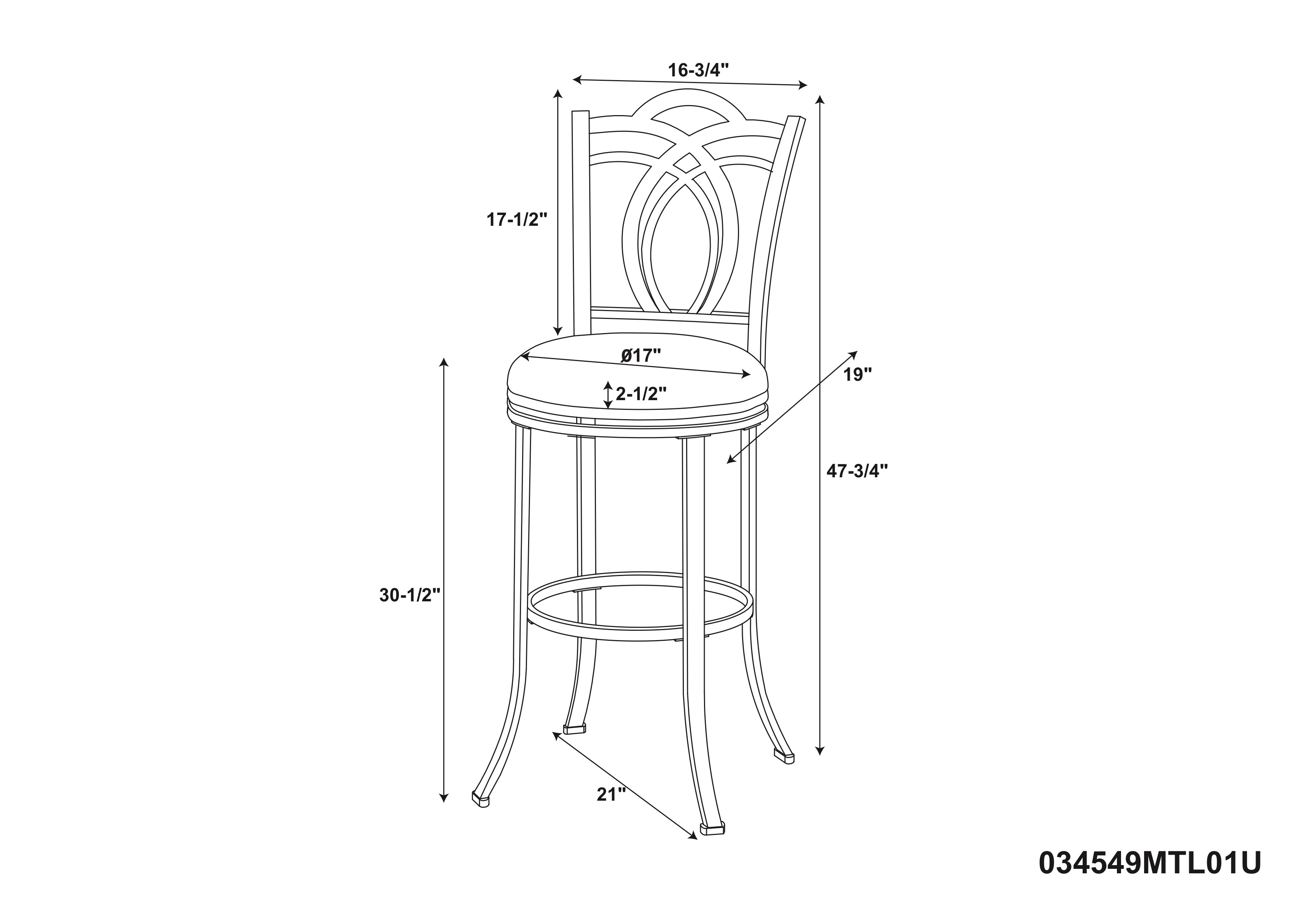 Decorative Back and Flared Legs Coffee Brown Finish Coffee Brown PU Upholstery Swivel Seat Seat Dimensions: 30″ seat height, 17″ Diameter, 3″ thick Assembled Dimensions: 16.87″ w x 20.75″ d x 47″ h Weight Capacity: 20 lbs. Assembly Required Ships in 1 box