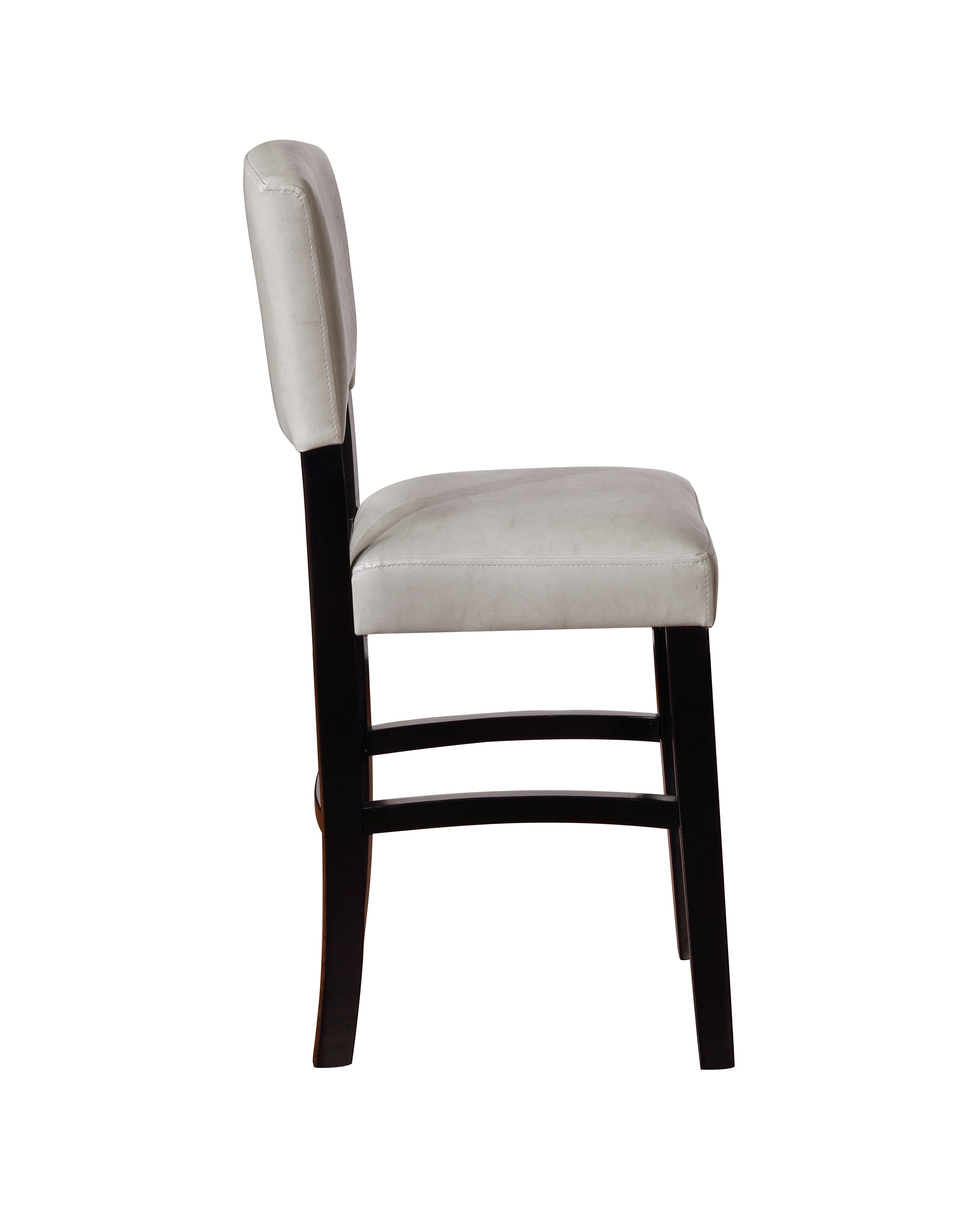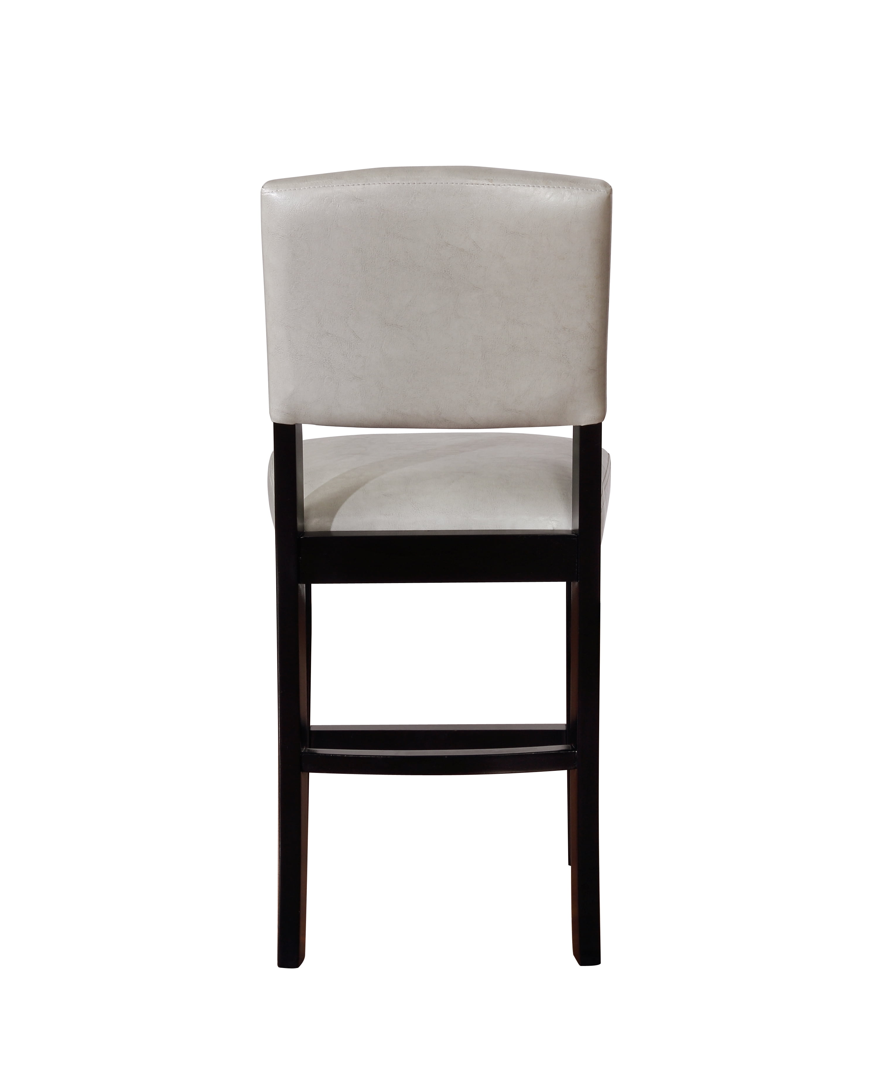 Solid wood black-finished frame Dove gray faux leather upholstery is easy to wipe clean Four foot rails provide stability and comfort High padded back for comfort 24″ seat height is perfect for counter heights of 35-39″ Easy to assemble Assembled size: 18” W x 19.5” D x 39.25” H, 22 lbs Carton size: 39.76″ w x 8.27″ d x 18.11″ h Materials: Rubberwood, PU fabric, CA fire foam, metal hardware For indoor use only