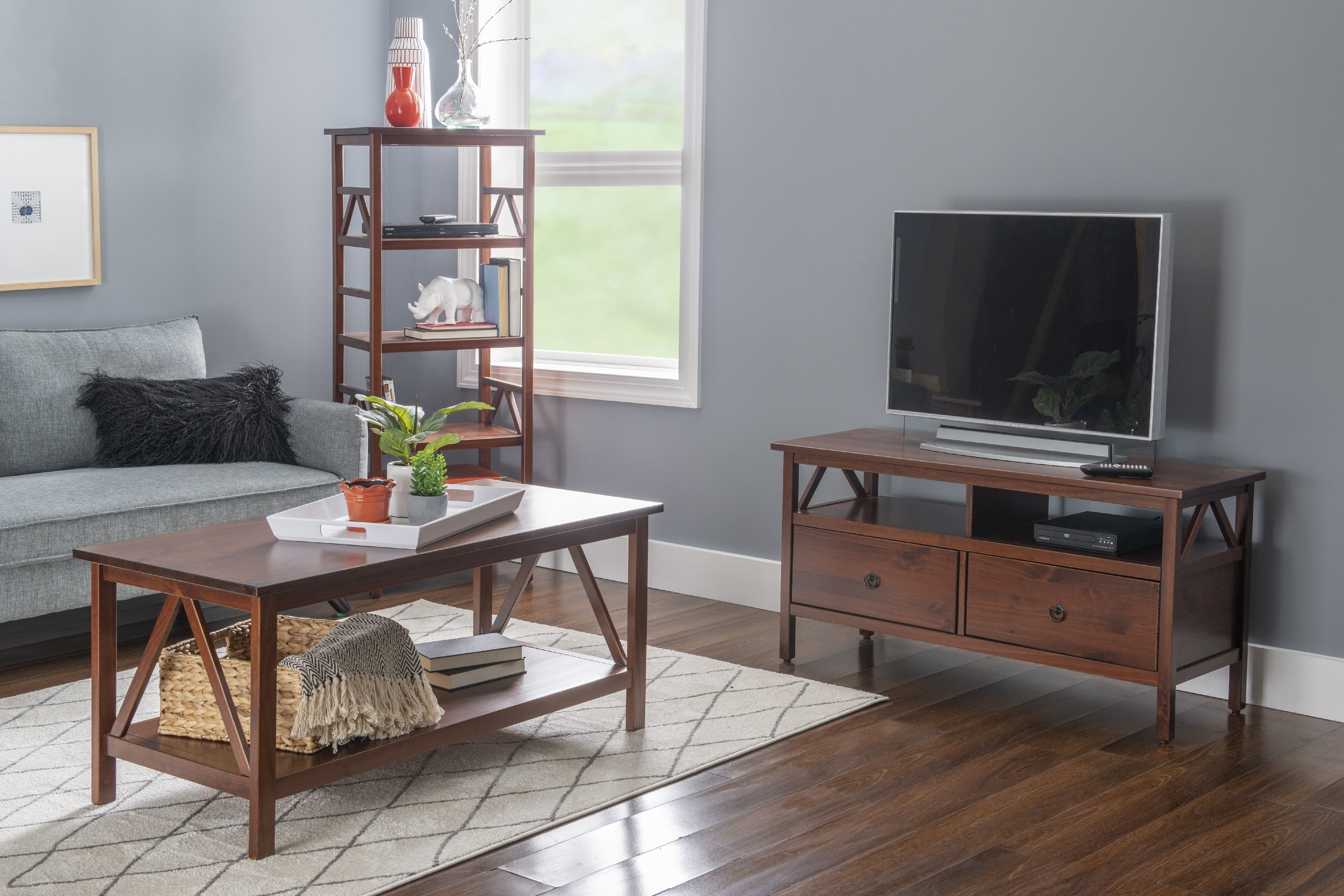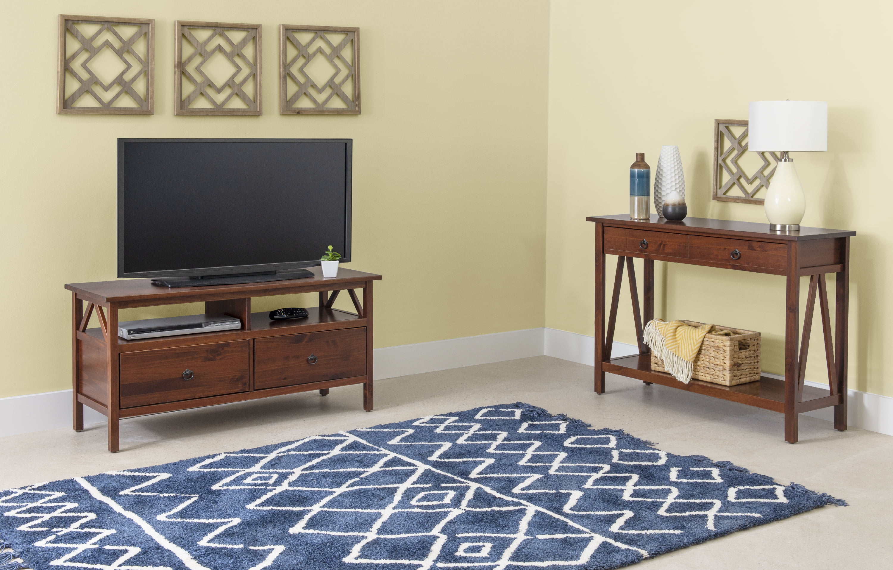 Antique tobacco finish Simple yet eye-catching design Versatile design Ample storage space Will easily complement your homes decor Shelf interior dim side 19.5 x 14.75 x 4.8 drawer interior dims 17.5 x 10.82 x 5.66 top 44 x 16 Maximum tv size 40in diagonal maximum weight on top shelf 200lbs Ships in one box For Indoor Use Only