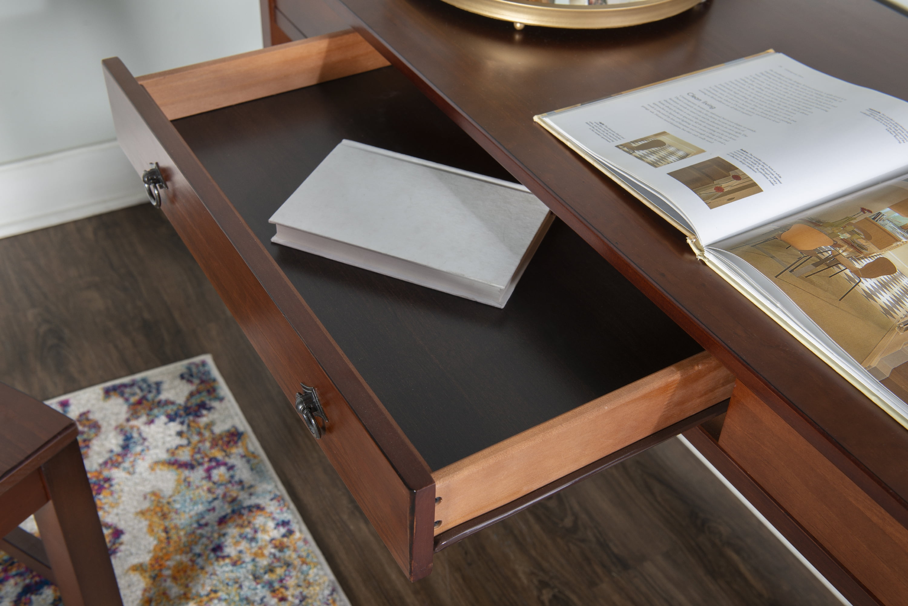 This collection has a simple yet eye-catching design that is matched with incredible durability. This versatile desk makes good use of space with ample work and display space. A single, wide drawer provides ample hidden storage space for small items. A neutral, classic antique tobacco finish allows this piece to easily complement your homes decor. Suggested for Adult Use.