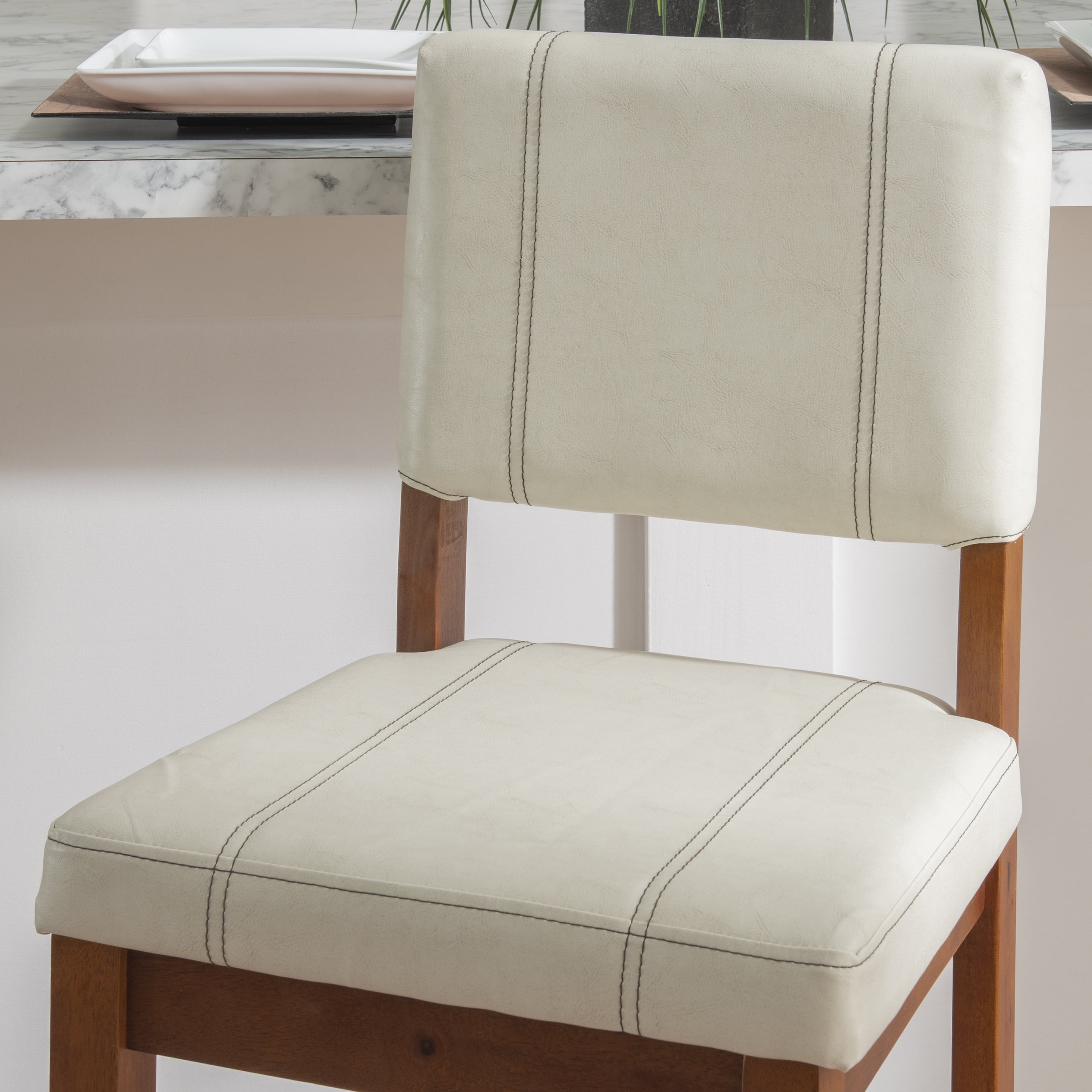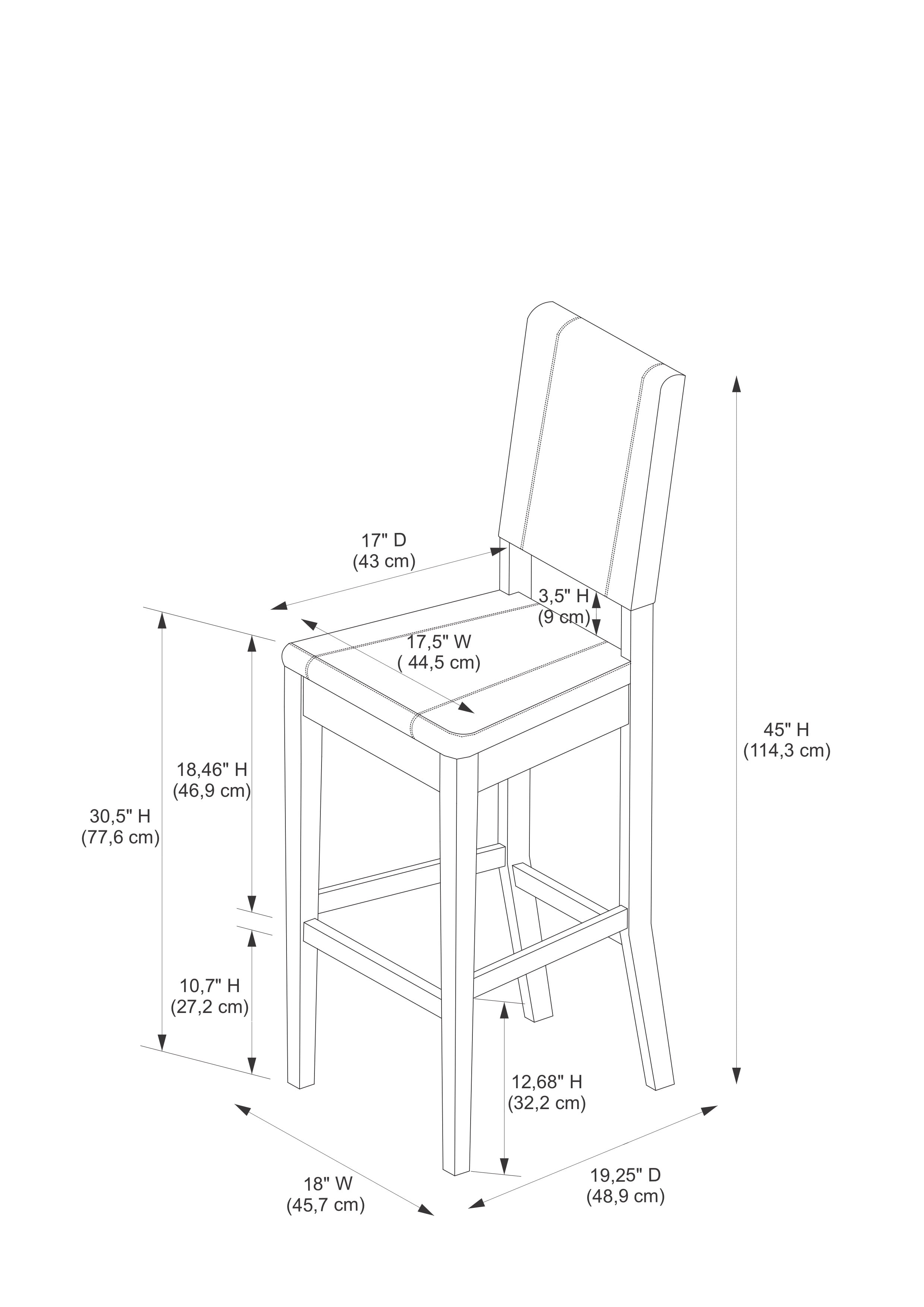 Medium/Dark Walnut Finish Wipe clean Cream PVC Vinyl seat cover Wood legs and padded seat cushion Four foot rails provide stability and comfort Seat Dimensions: 30″ seat height, 17.99″ x 17.01″ x 2.76″ Weight Limit: 275 lbs Assembled Dimensions: 18″w x 19.25″d x 45″h Ships in 1 box