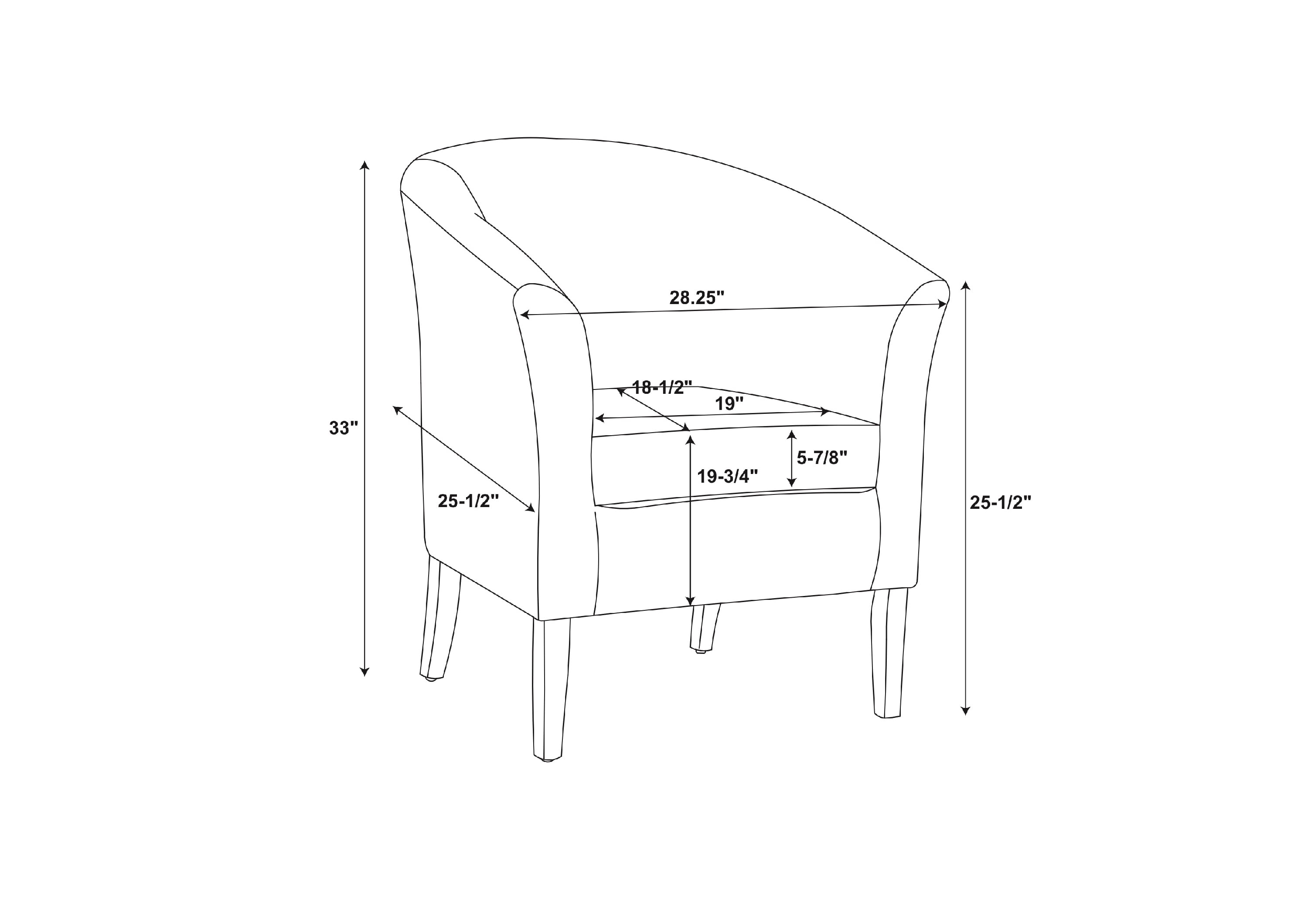 Wide barrel shape with deep seat and high back adn flared armrests create an inviting place to relax Generously padded 5.875 in thick seat provides extra comfort Upholstered with stain and fade resistant wipe-clean vinyl Hardwood frame provides long term strength and stability Brown finish on legs 28.25in l x 25.5in d x 33in h dimensions make for ideal placement in compact quarters and open spaces alike Arrives with easy assembly of legs required Seat Dimensions:18 W X 18 D X 5.5 H Seat Height: 19.5 H Assembled Dimensions: 28.25 L X 25.5 D X 33 H Ships in one box Weight Capacity: 275 Lbs
