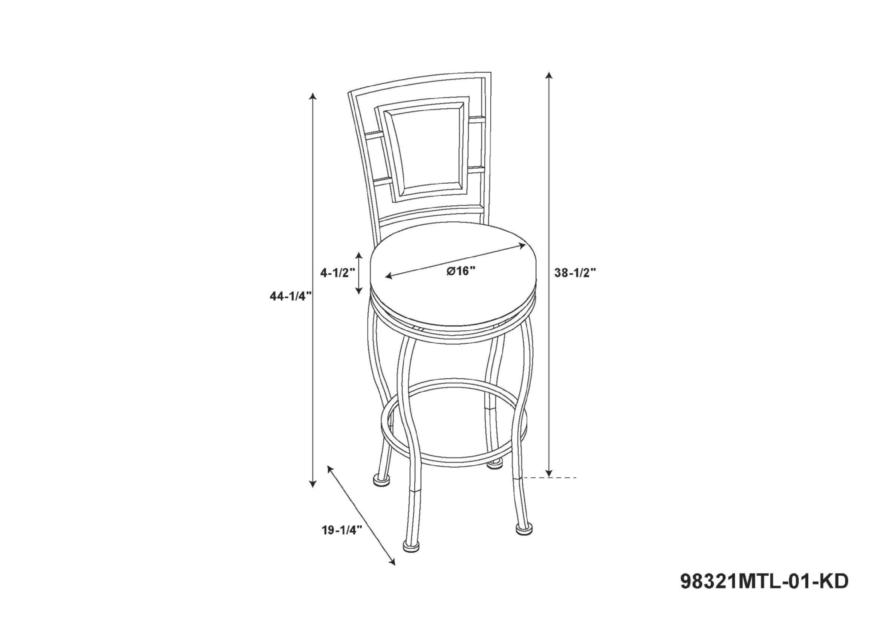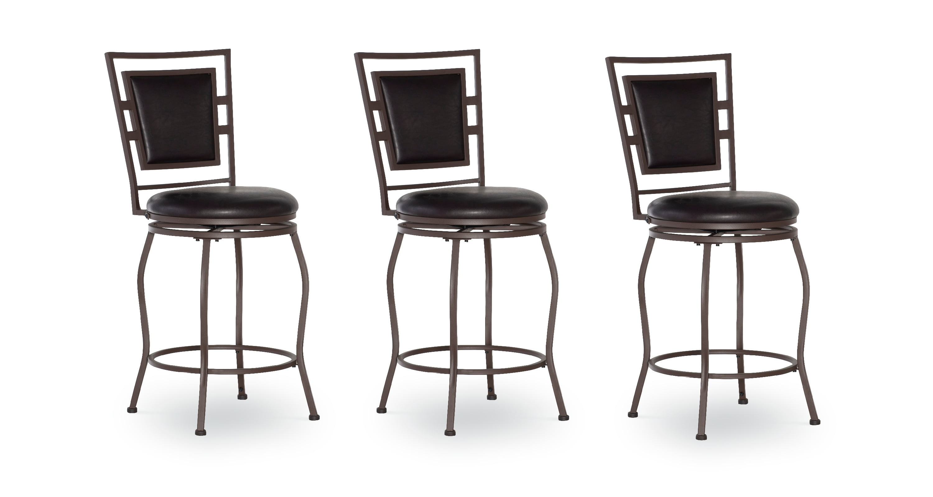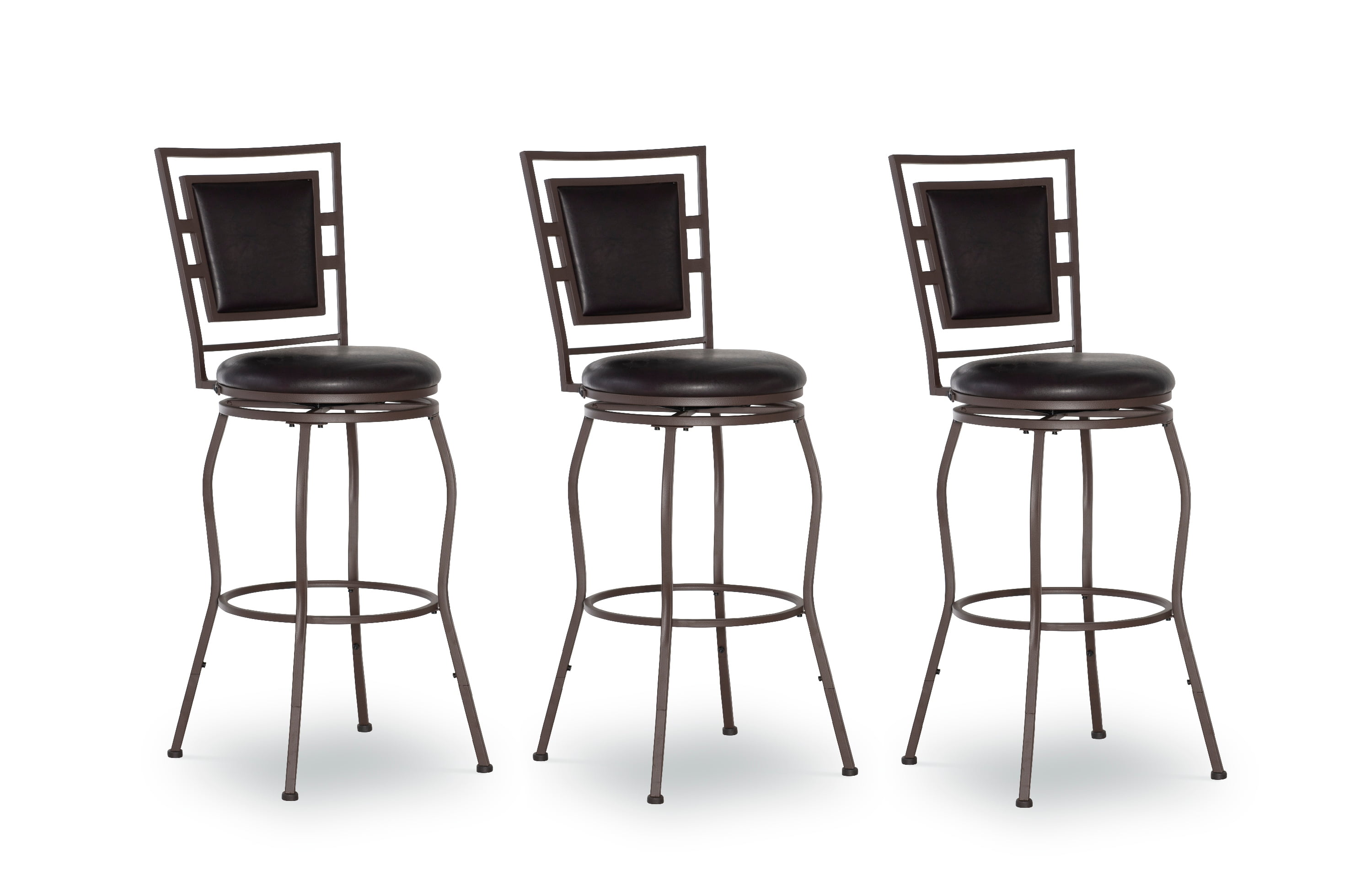 Dark Brown Finish Wipe clean dark brown PU seat and back. Swivel Seat Adjustable Height Legs – 24-30″ Seat Height Set of Three Transitional Design and Style Seat Dimensions: 16″ diameter x 2.375″ thick Weight Limit: 275 lbs Assembled Dimensions: 16″w x 18″d x 38.5-44.75″h Ships in 1 box For indoor use only