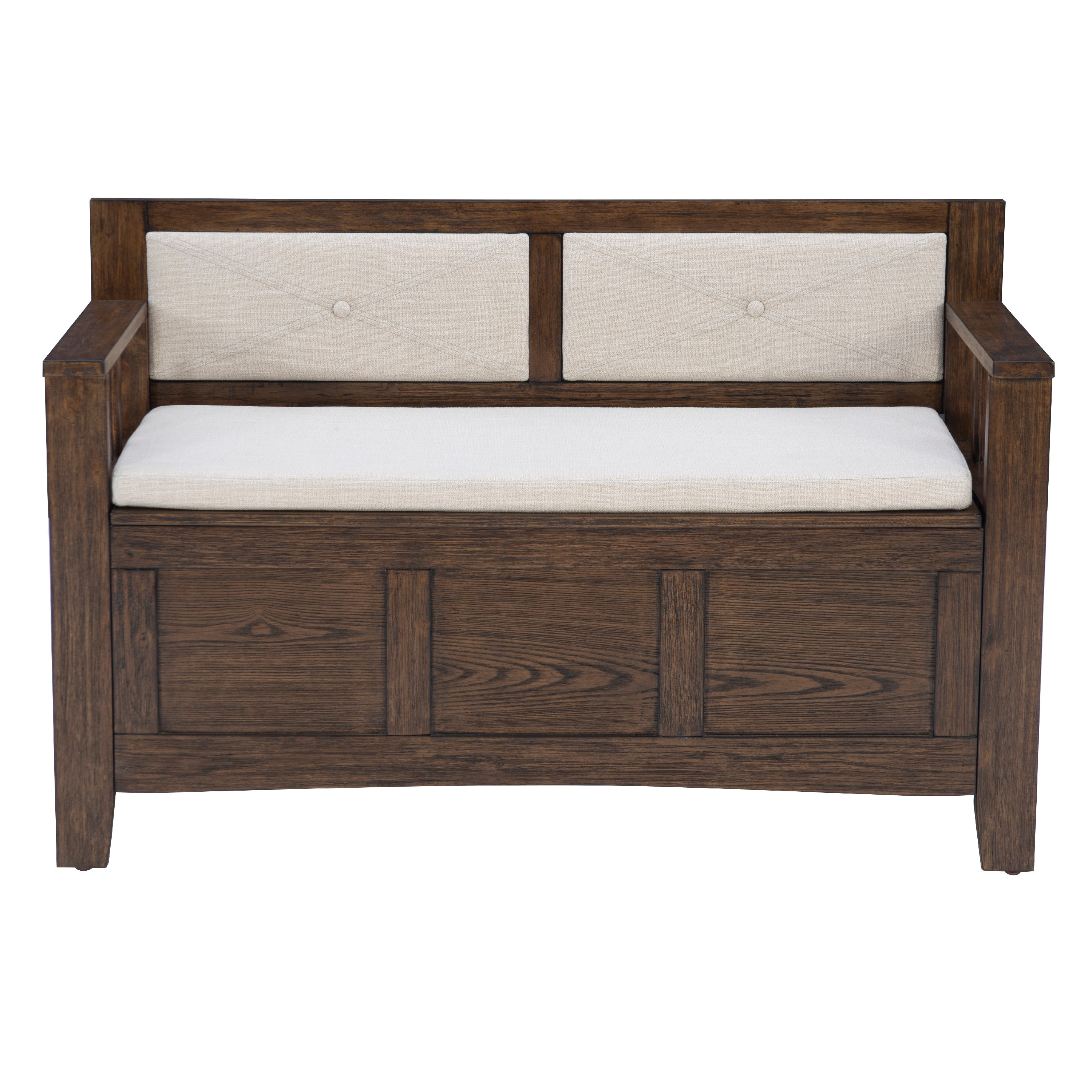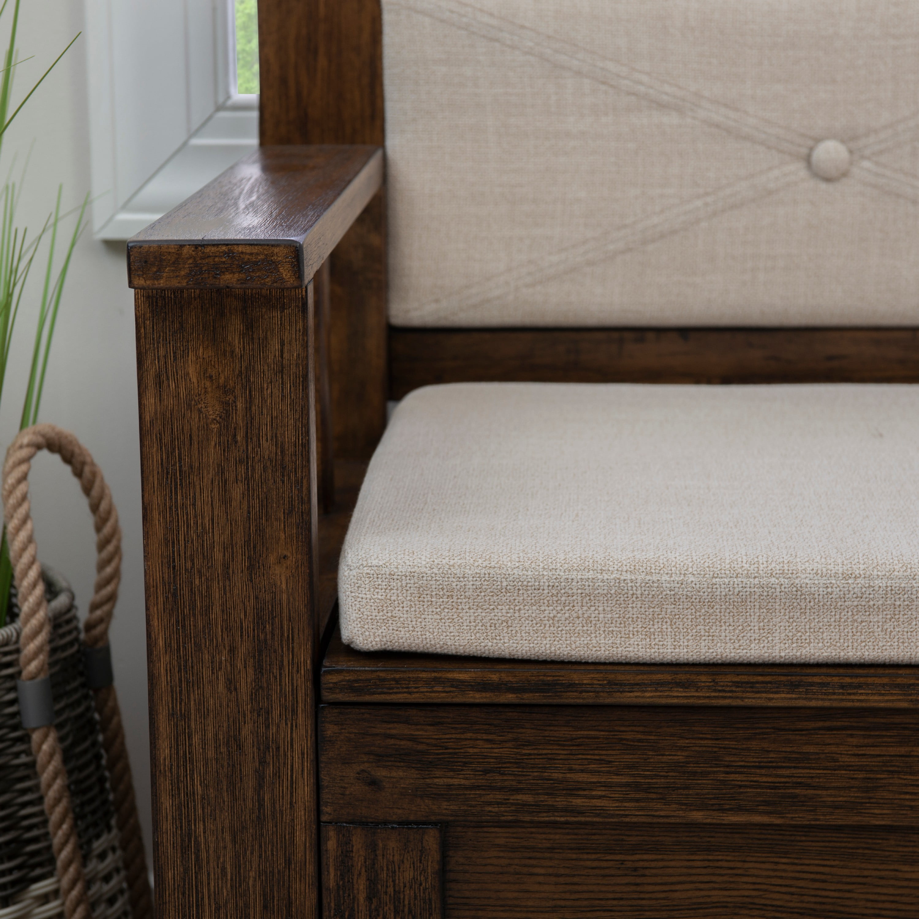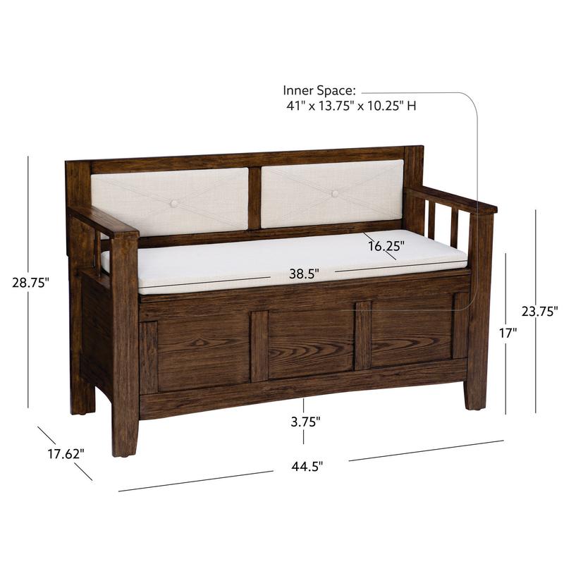 Ash wood veneers stained in umber brown lends to a rustic aesthetic Flip top seat opens to reveal hidden storage compartment Beige linen look upholstery fitted over cushioned seat and backrest is stain resistant Seat cushion is removable for easy upkeep Paneled facades add depth and cottage flair Perfect placed under a w Dow, in the corner of your mudroom, against the wall in your entryway, or next to a kitchen table. Dimensions: 44.5 L X 17.62 D X 28.75 H Ships in 1 box Weight Capacity: 225 lbs Brand: Linon